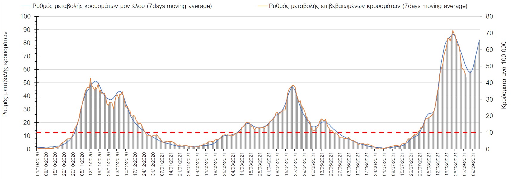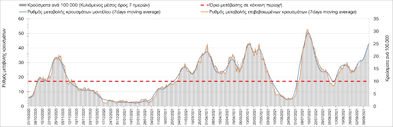 Η πορεία της μέσης εβδομαδιαίας τιμής των κρουσμάτων, καθώς και του κυλιόμενου μέσου όρου 7 ημερών του αριθμού των κρουσμάτων ανά 100.000 πληθυσμού, όπως έχουν καταγραφεί από τον ΕΟΔΥ και η αναμενόμενη πορεία τους όπως προδιαγράφεται από την υπολογιστική πλατφόρμα CORE για την Ελληνική επικράτεια μέχρι τις 15 Σεπτεμβρίου, αποτυπώνονται στο Σχήμα 4.