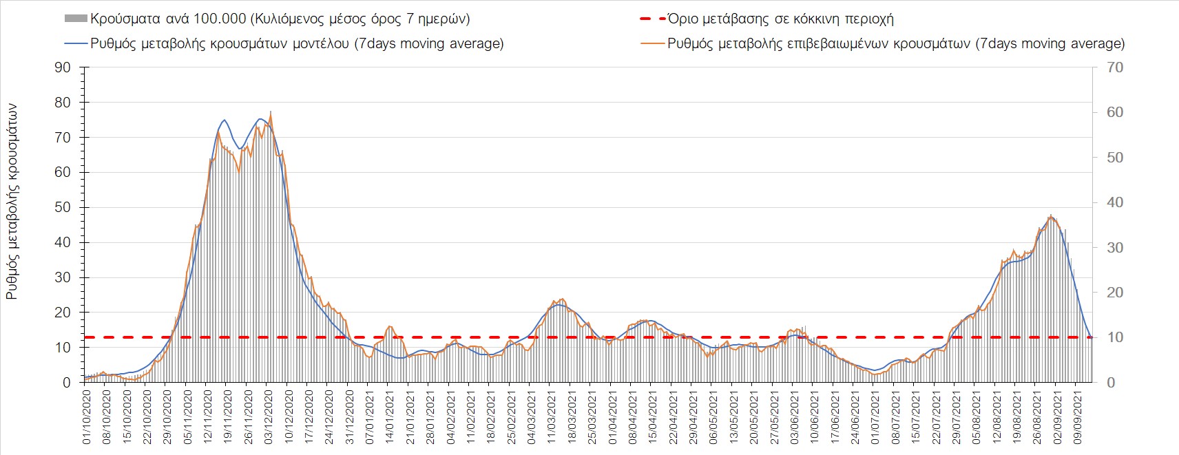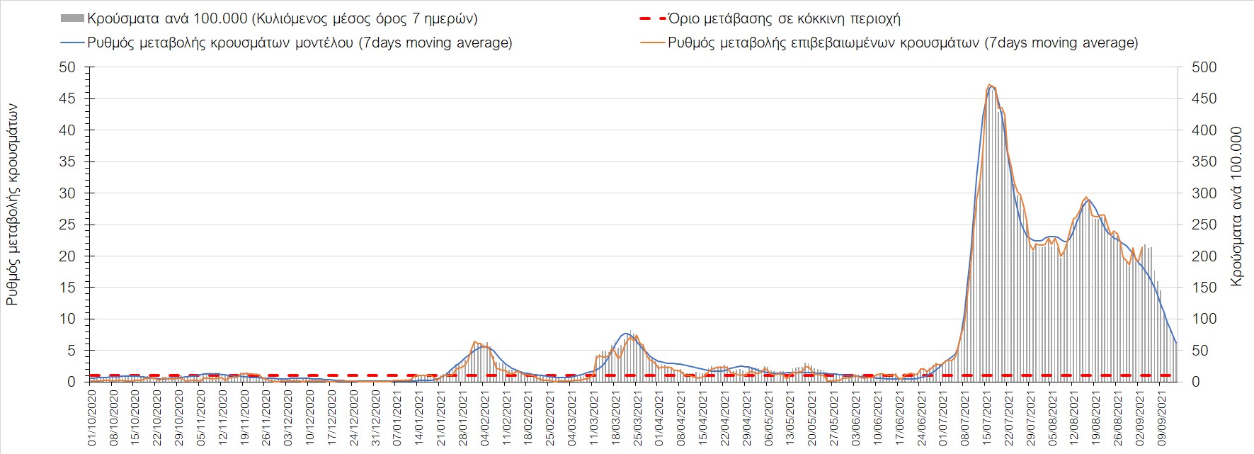 Όμως η έντονη αναζωπύρωση έχει περιέλθει σε έντονη αποκλιμάκωση, ως αποτέλεσμα των περιοριστικών μέτρων που έχουν επιβληθεί (Σχήμα 45).