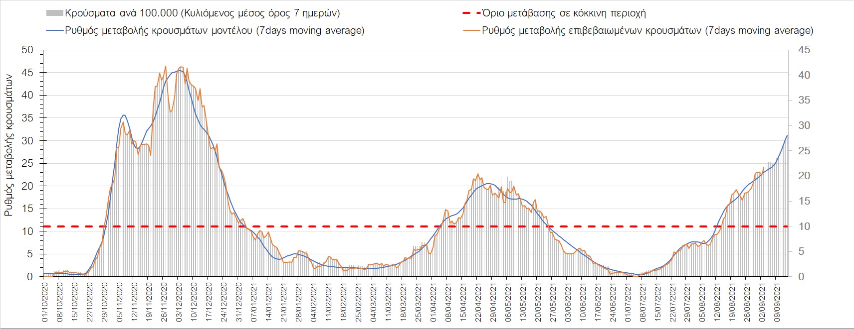 Στη Μαγνησία με 15 κρούσματα (Σχήμα 10) παρατηρείται μειωμένος αριθμός κρουσμάτων σε σχέση με προχθες και παρά την καθοδική πλέον τροχιά, συνεχίζει να παραμένει πάνω από το όριο χαρακτηρισμού ως περιοχή ανησυχίας.
