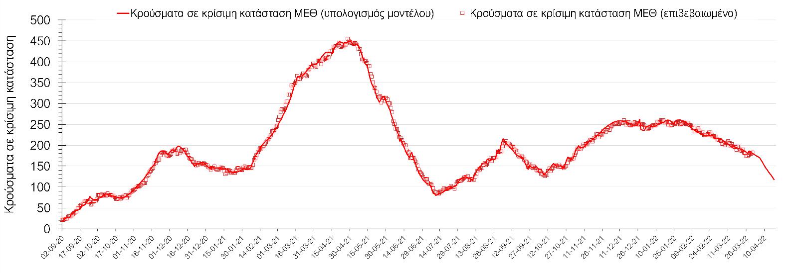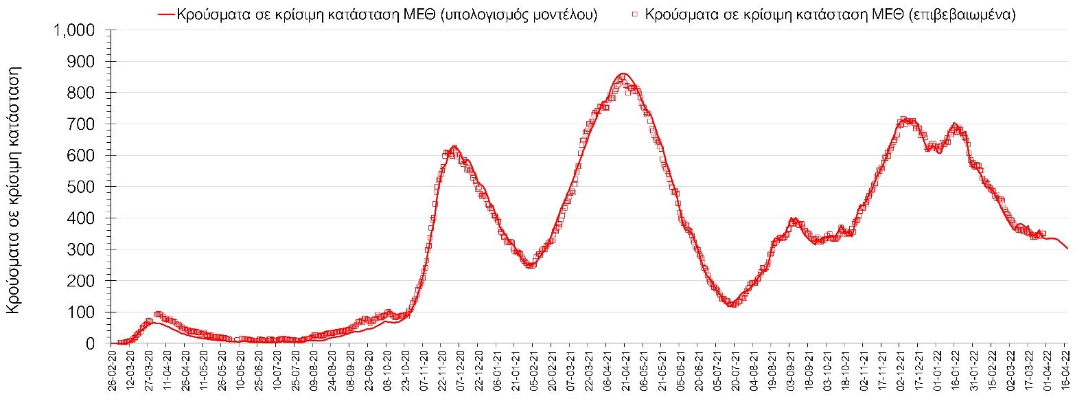 Η πορεία της μέσης εβδομαδιαίας τιμής των κρουσμάτων, καθώς και του κυλιόμενου μέσου όρου 7 ημερών του αριθμού των κρουσμάτων ανά 100.000 πληθυσμού, όπως έχουν καταγραφεί από τον ΕΟΔΥ και η αναμενόμενη πορεία τους, όπως προδιαγράφεται από την υπολογιστική πλατφόρμα CORE για την Ελληνική επικράτεια (όπως και στην Αττική και τη Θεσσαλονίκη) μέχρι τις 15 Απριλίου, αποτυπώνονται στο Σχήμα 4. Αυτή η προβλεπόμενη πορεία, που αφορά τα κρούσματα, τους νοσηλευόμενους σε απλές κλίνες, όσο και σε ΜΕΘ, καθώς επίσης και τους θανάτους, βασίζεται στις ακόλουθες παραδοχές: