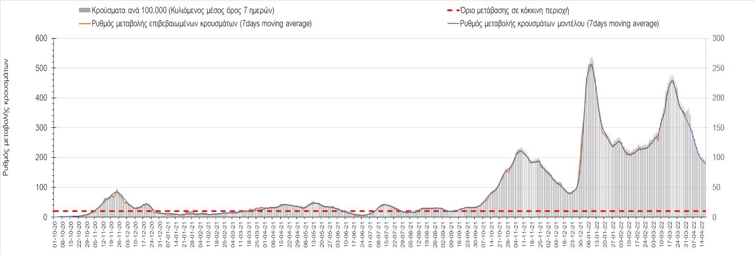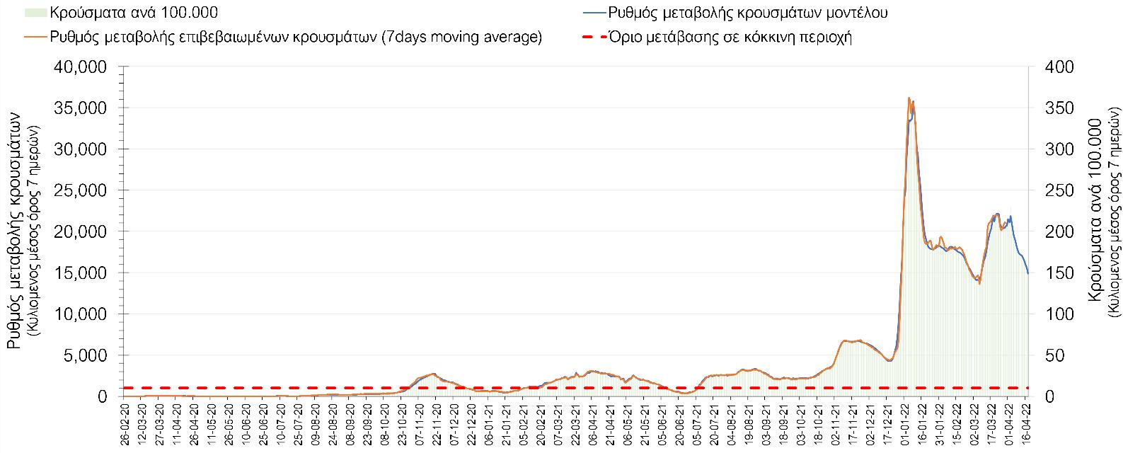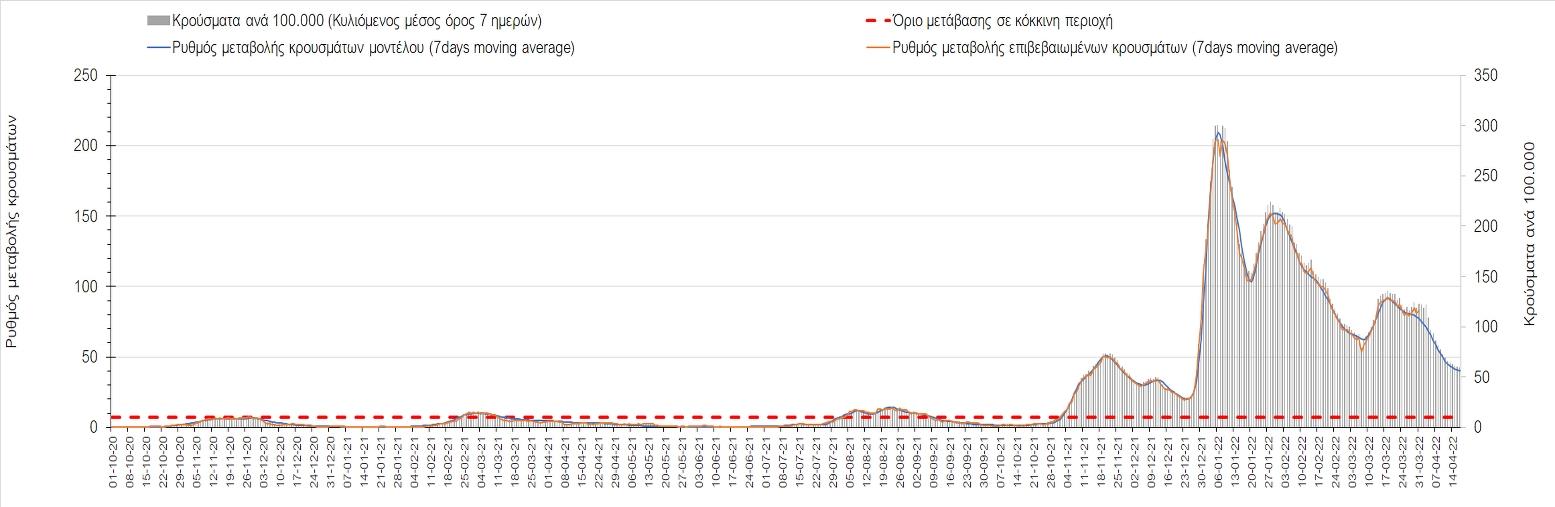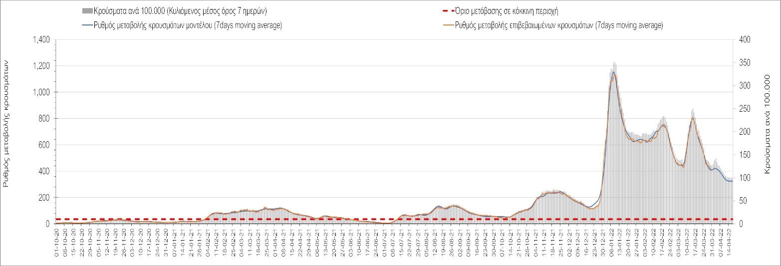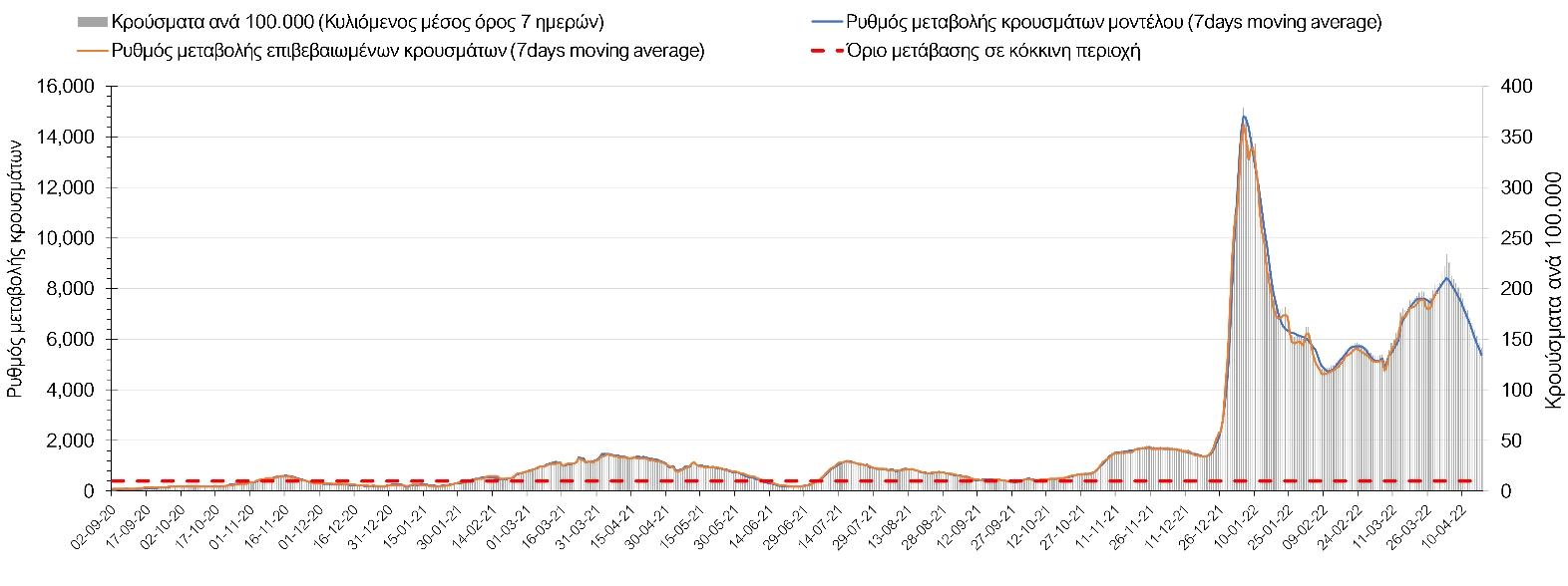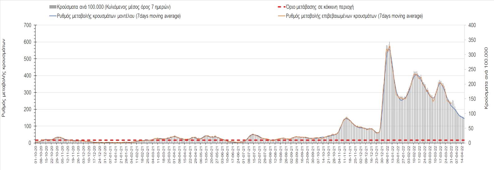 Η κάμψη της ανοδικής πορείας της προηγούμενης εβδομάδας, δείχνει να επανέρχεται και αντικατοπτρίζεται και στον ημερήσιο αριθμό των κρουσμάτων (κυλιόμενος μέσος όρος 7 ημερών), ο οποίος εμφανίζει οριακή πτώση, και βρίσκεται μόλις πάνω από τις 21.000 (20.885). Για να επανέλθει η συστηματική αποκλιμάκωση της πανδημίας, πέρα από την εφαρμογή των μέτρων (σε συνδυασμό με την σημαντική συνειδητοποίηση εκ μέρους του πληθυσμού ότι χρειάζεται προσοχή και σύνεση για την αντιμετώπιση της διασποράς της παραλλαγής Ο), θα πρέπει να στοχεύσουμε στη διατήρηση και την επέκταση της επίκτητης ανοσίας του πληθυσμού, αλλά και στον πολύ μεγάλο αριθμό των τεστ συνολικά (μοριακά, rapid και self-test) που πραγματοποιούνται καθημερινά, των οποίων ο αριθμός έχει φθάσει σε ημερήσια βάση τις 700.000. Για αυτό το λόγο και με δεδομένη τη μεγάλη διασπορά στα σχολεία θεωρούμε πρόωρη τη μείωση των self-test στα παιδιά σχολικής ηλικίας σε ένα μόνο την εβδομάδα από τα δύο που γίνονταν μέχρι τώρα.