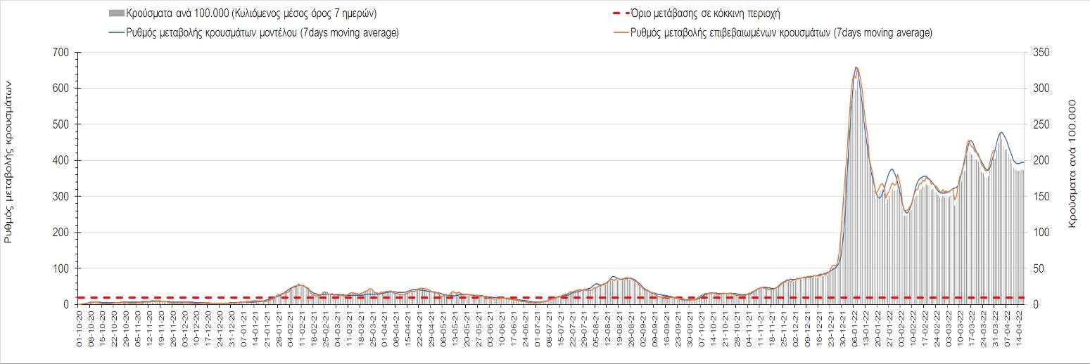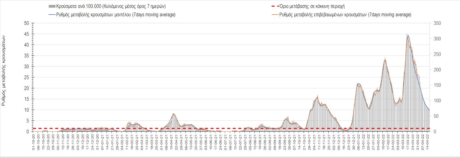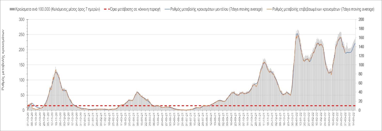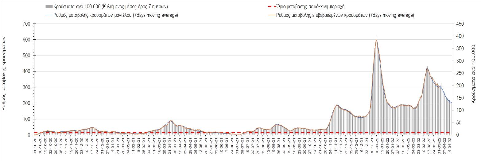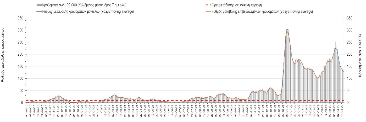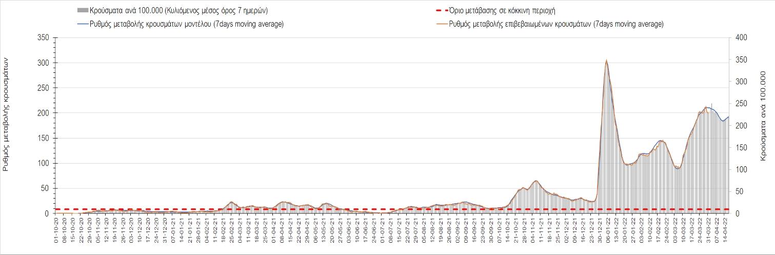 Η κάμψη της ανοδικής πορείας της προηγούμενης εβδομάδας, δείχνει να επανέρχεται και αντικατοπτρίζεται και στον ημερήσιο αριθμό των κρουσμάτων (κυλιόμενος μέσος όρος 7 ημερών), ο οποίος εμφανίζει οριακή πτώση, και βρίσκεται μόλις πάνω από τις 21.000 (20.885). Για να επανέλθει η συστηματική αποκλιμάκωση της πανδημίας, πέρα από την εφαρμογή των μέτρων (σε συνδυασμό με την σημαντική συνειδητοποίηση εκ μέρους του πληθυσμού ότι χρειάζεται προσοχή και σύνεση για την αντιμετώπιση της διασποράς της παραλλαγής Ο), θα πρέπει να στοχεύσουμε στη διατήρηση και την επέκταση της επίκτητης ανοσίας του πληθυσμού, αλλά και στον πολύ μεγάλο αριθμό των τεστ συνολικά (μοριακά, rapid και self-test) που πραγματοποιούνται καθημερινά, των οποίων ο αριθμός έχει φθάσει σε ημερήσια βάση τις 700.000. Για αυτό το λόγο και με δεδομένη τη μεγάλη διασπορά στα σχολεία θεωρούμε πρόωρη τη μείωση των self-test στα παιδιά σχολικής ηλικίας σε ένα μόνο την εβδομάδα από τα δύο που γίνονταν μέχρι τώρα.