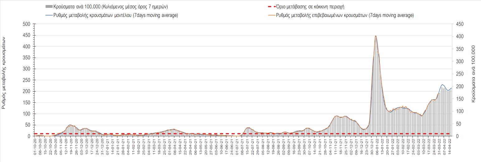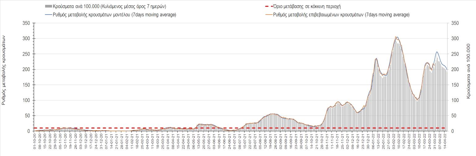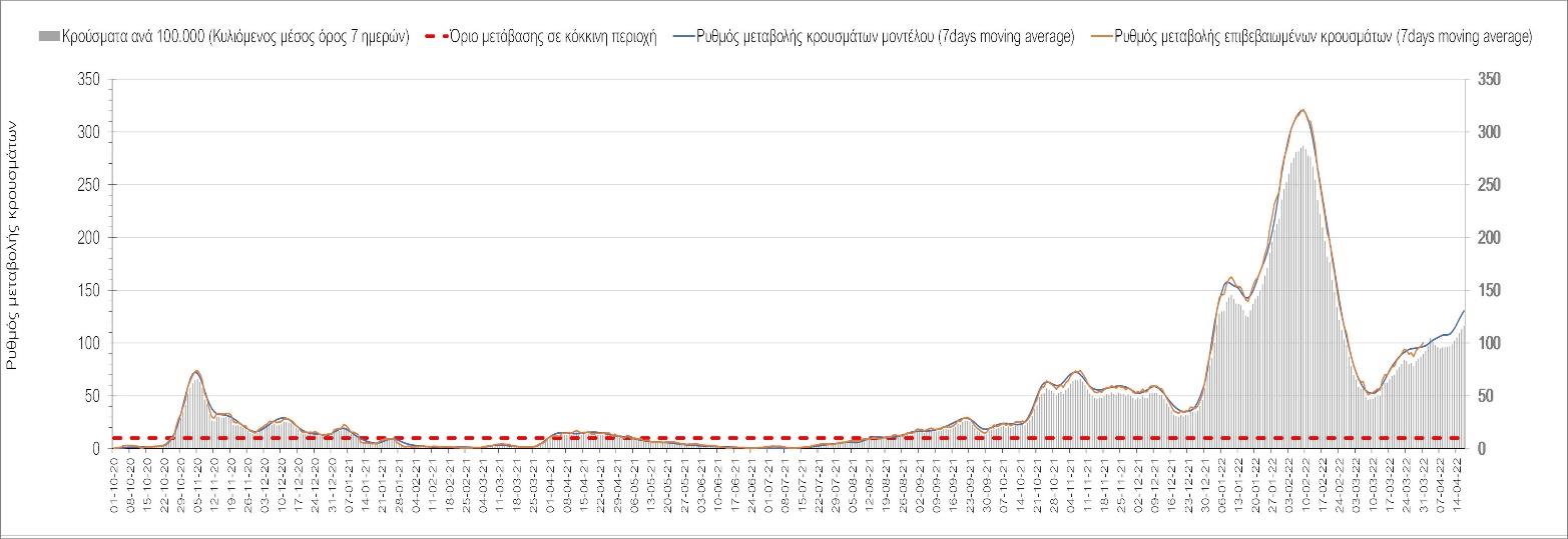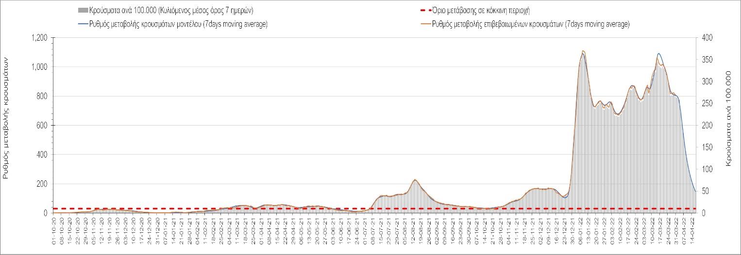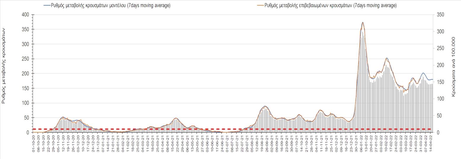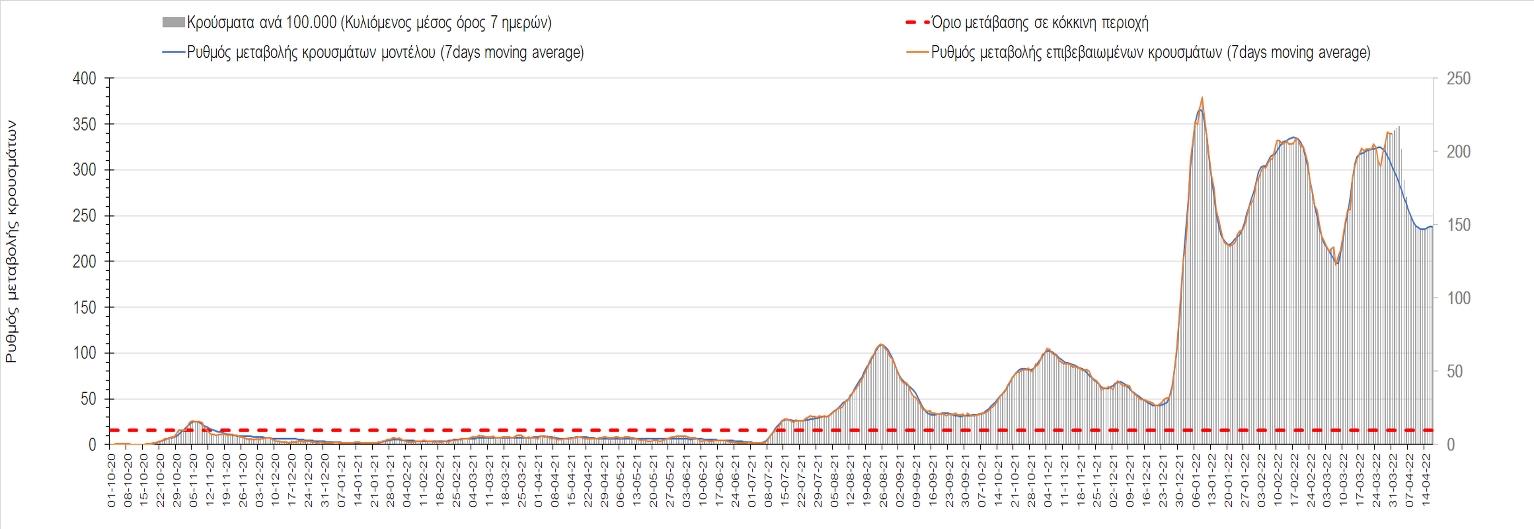 Η κάμψη της ανοδικής πορείας της προηγούμενης εβδομάδας, δείχνει να επανέρχεται και αντικατοπτρίζεται και στον ημερήσιο αριθμό των κρουσμάτων (κυλιόμενος μέσος όρος 7 ημερών), ο οποίος εμφανίζει οριακή πτώση, και βρίσκεται μόλις πάνω από τις 21.000 (20.885). Για να επανέλθει η συστηματική αποκλιμάκωση της πανδημίας, πέρα από την εφαρμογή των μέτρων (σε συνδυασμό με την σημαντική συνειδητοποίηση εκ μέρους του πληθυσμού ότι χρειάζεται προσοχή και σύνεση για την αντιμετώπιση της διασποράς της παραλλαγής Ο), θα πρέπει να στοχεύσουμε στη διατήρηση και την επέκταση της επίκτητης ανοσίας του πληθυσμού, αλλά και στον πολύ μεγάλο αριθμό των τεστ συνολικά (μοριακά, rapid και self-test) που πραγματοποιούνται καθημερινά, των οποίων ο αριθμός έχει φθάσει σε ημερήσια βάση τις 700.000. Για αυτό το λόγο και με δεδομένη τη μεγάλη διασπορά στα σχολεία θεωρούμε πρόωρη τη μείωση των self-test στα παιδιά σχολικής ηλικίας σε ένα μόνο την εβδομάδα από τα δύο που γίνονταν μέχρι τώρα.