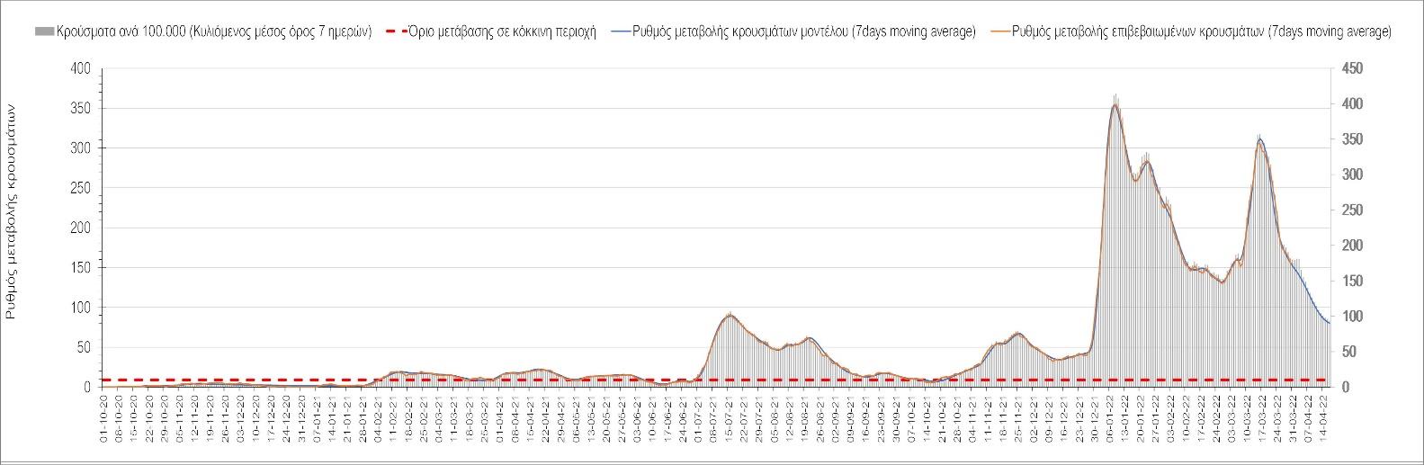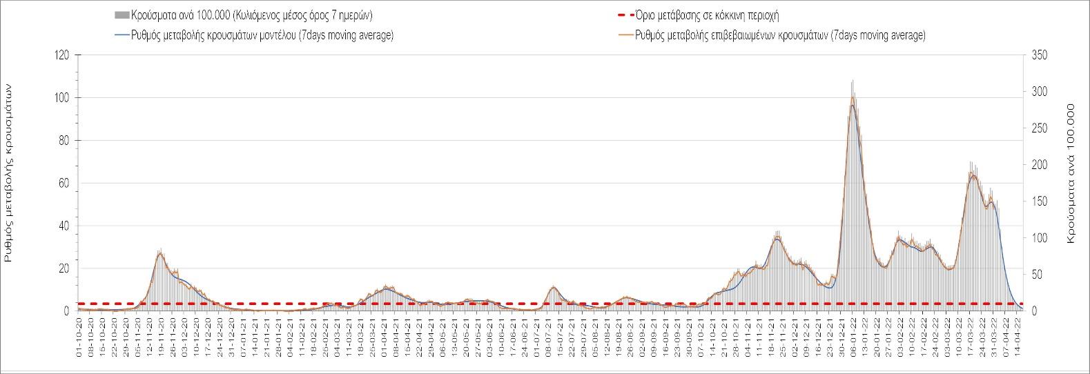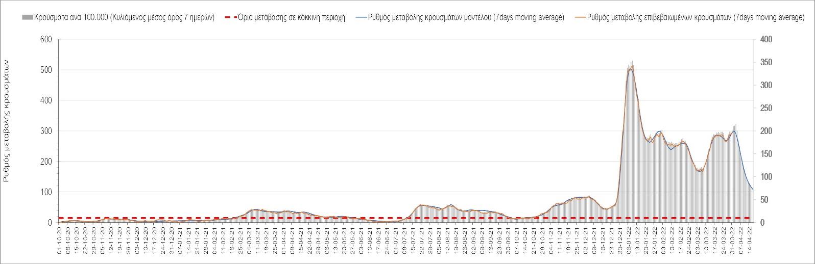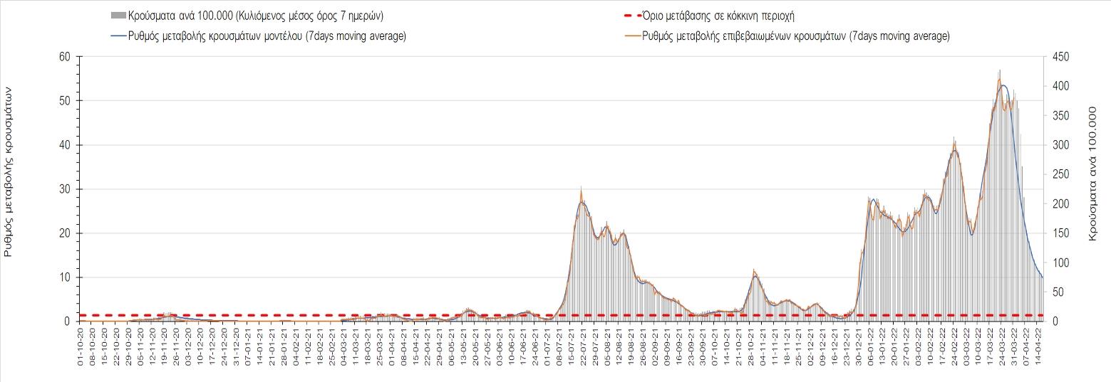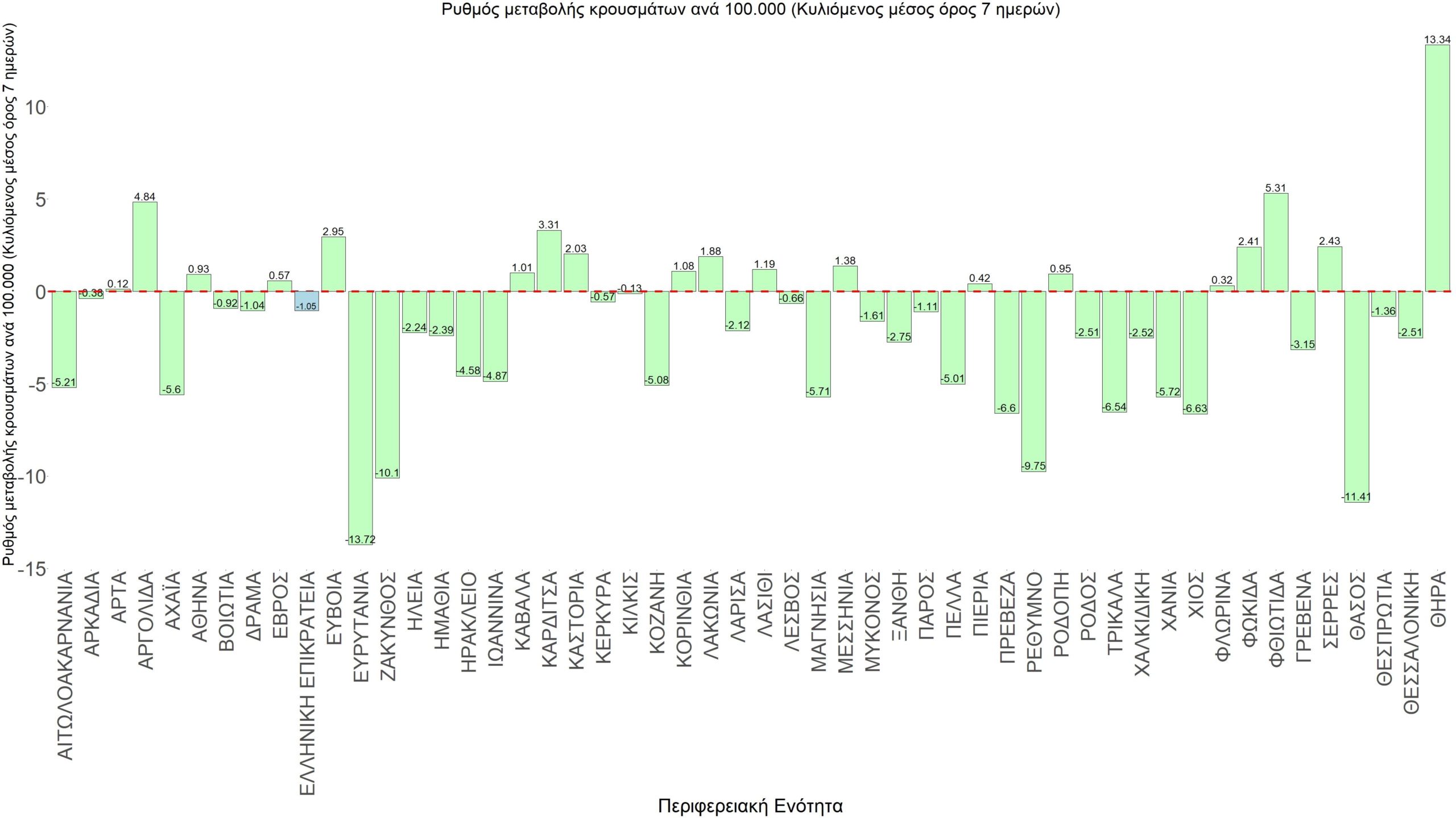 Η αποτύπωση των τάσεων στις επιμέρους περιοχές, παρουσιάζεται στο Σχήμα 61, όπου παρουσιάζεται ο ρυθμός μεταβολής των νέων κρουσμάτων ανά 100.000 κατοίκους (κυλιόμενος μέσος όρος 7 ημερών) των επιμέρους περιοχών. Θετικές τιμές του ρυθμού μεταβολής υποδηλώνουν άνοδο, ενώ αρνητικές τιμές υποδηλώνουν πτωτική πορεία.