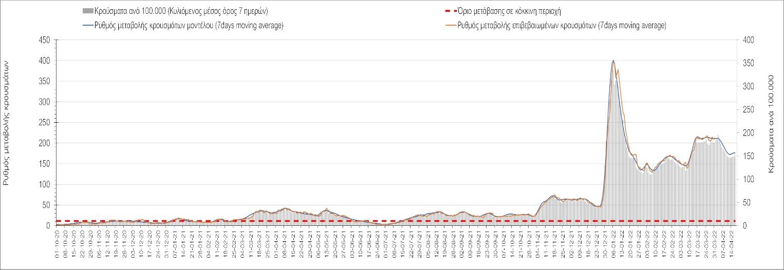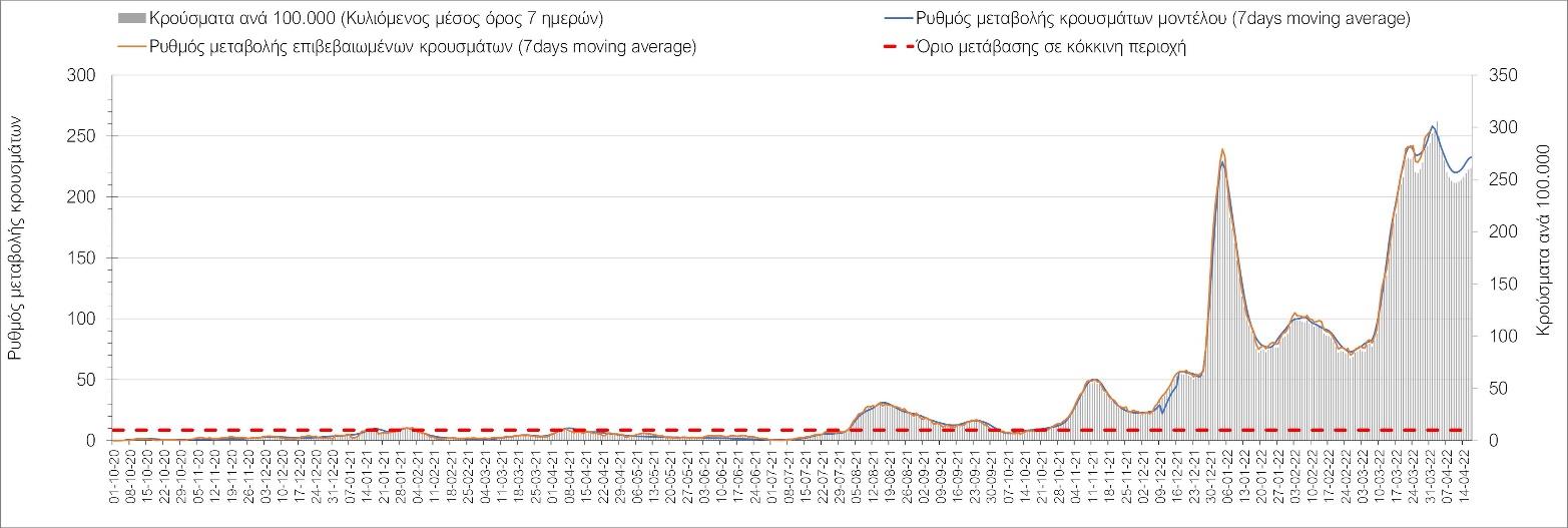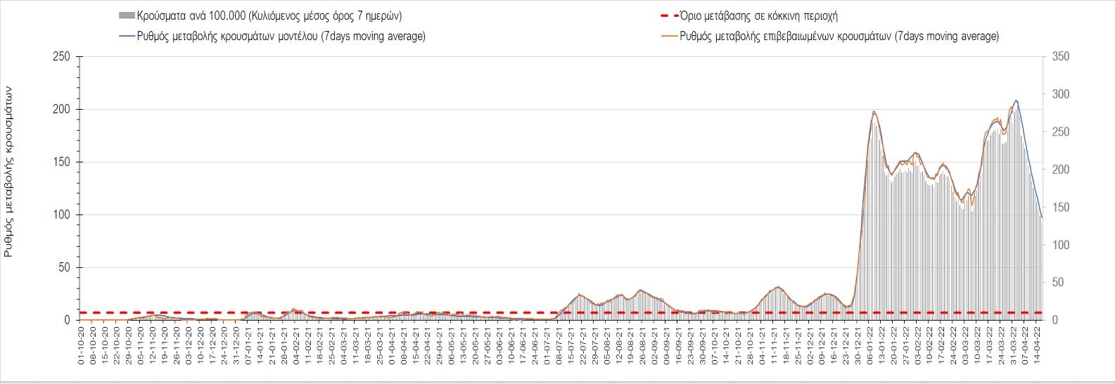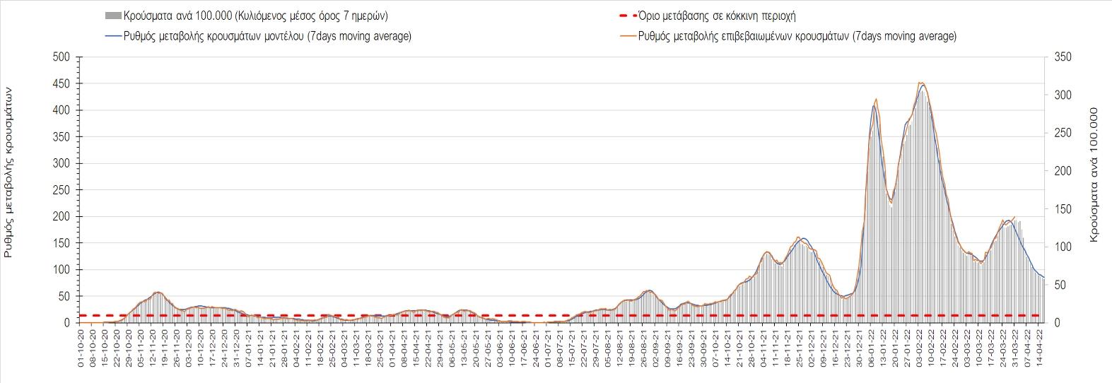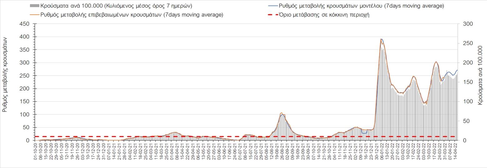 Η αποτύπωση των τάσεων στις επιμέρους περιοχές, παρουσιάζεται στο Σχήμα 61, όπου παρουσιάζεται ο ρυθμός μεταβολής των νέων κρουσμάτων ανά 100.000 κατοίκους (κυλιόμενος μέσος όρος 7 ημερών) των επιμέρους περιοχών. Θετικές τιμές του ρυθμού μεταβολής υποδηλώνουν άνοδο, ενώ αρνητικές τιμές υποδηλώνουν πτωτική πορεία.