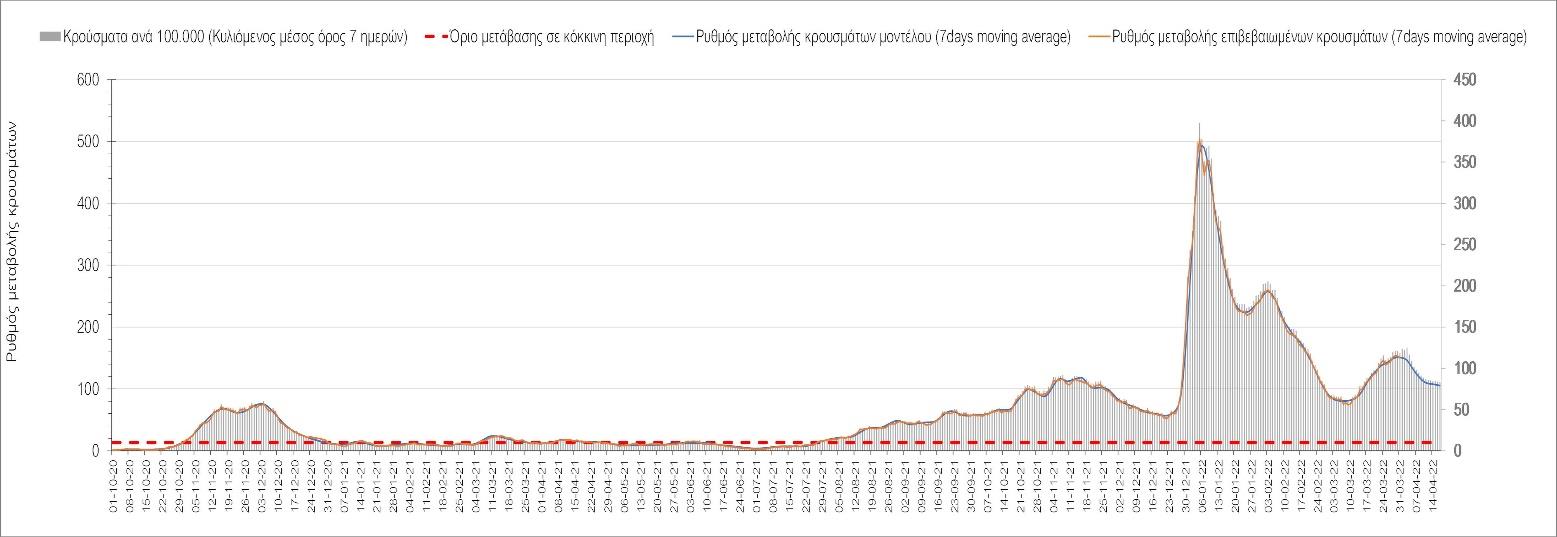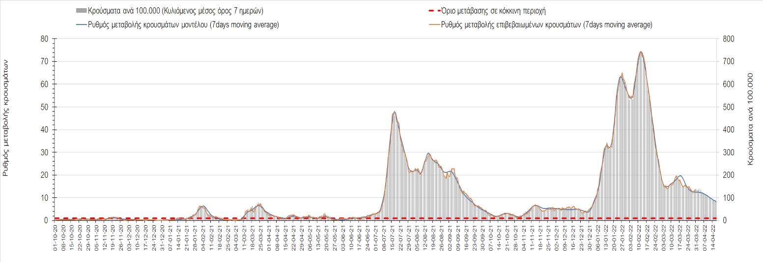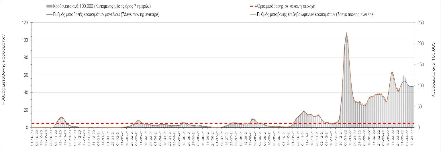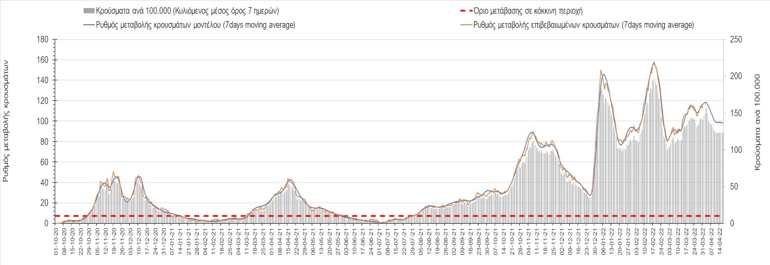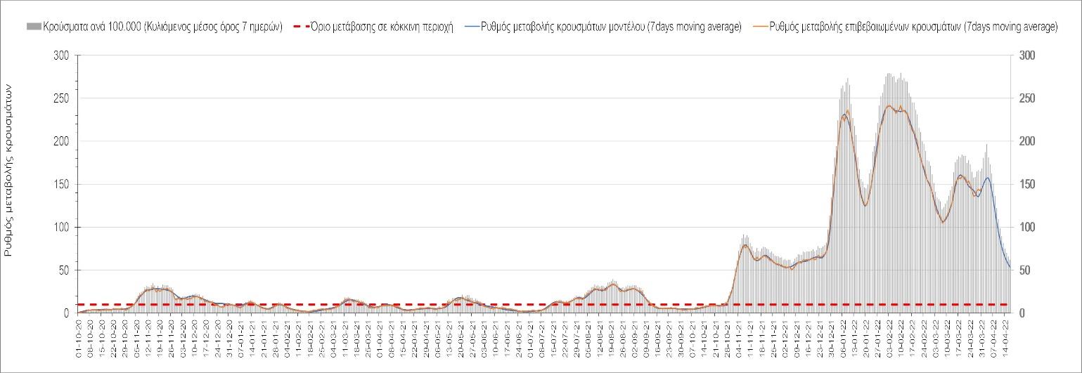Η αποτύπωση των τάσεων στις επιμέρους περιοχές, παρουσιάζεται στο Σχήμα 61, όπου παρουσιάζεται ο ρυθμός μεταβολής των νέων κρουσμάτων ανά 100.000 κατοίκους (κυλιόμενος μέσος όρος 7 ημερών) των επιμέρους περιοχών. Θετικές τιμές του ρυθμού μεταβολής υποδηλώνουν άνοδο, ενώ αρνητικές τιμές υποδηλώνουν πτωτική πορεία.