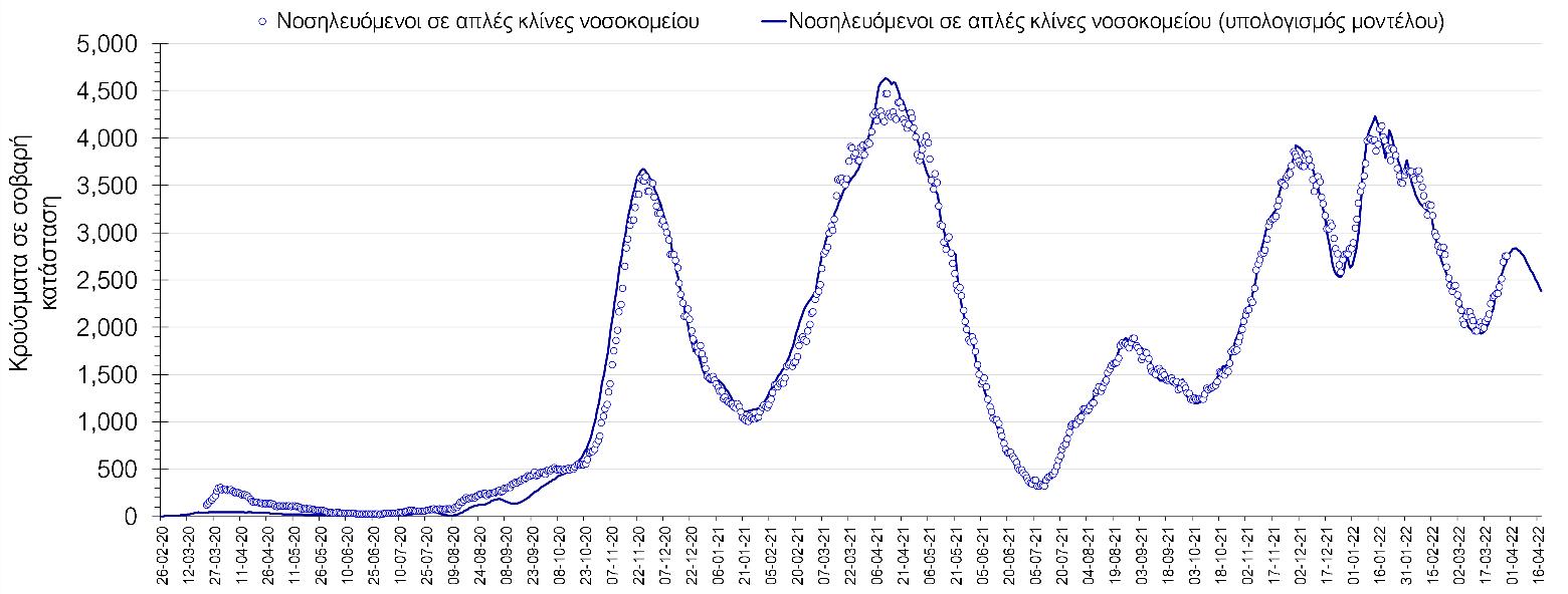 Σχήμα 2. Αριθμός κρουσμάτων σε σοβαρή κατάσταση (νοσηλευόμενοι σε απλές κλίνες) σύμφωνα με τα στοιχεία του ΕΟΔΥ και τις προβλέψεις της υπολογιστικής πλατφόρμας CORE.