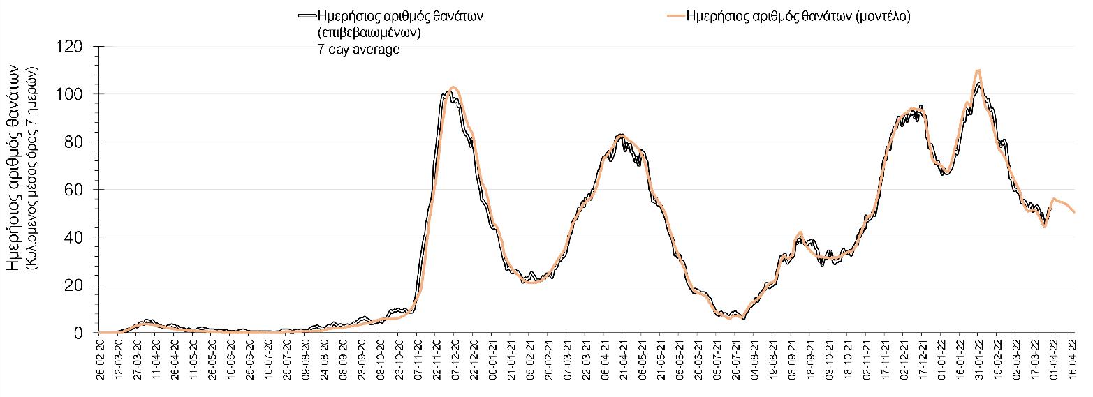 Ο αριθμός ημερήσιων θανάτων (51) που καταγράφηκε είναι μικρότερος σε σχέση με την Τετάρτη (60). Όπως είχαμε προβλέψει ο κυλιόμενος εβδομαδιαίος μέσος όρος που είναι 53,7 παραμένει υψηλός, και τόσο ο αριθμός, όσο και η τάση του, δε συνάδει με τον αριθμό των νοσηλειών σε κρίσιμη κατάσταση (διασωληνωμένοι σε ΜΕΘ).