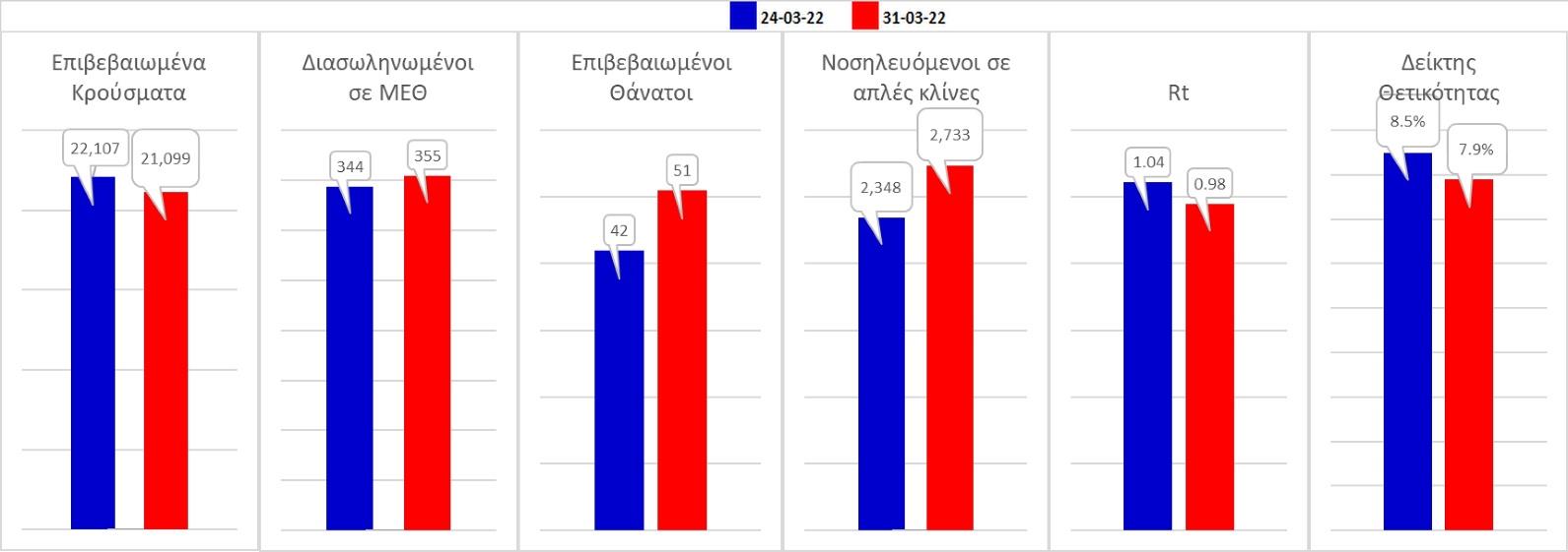 Σχήμα 59. Συγκριτικά αποτελέσματα της επιδημιολογικής εικόνας της Πέμπτης (31/03/2022) σε σχέση με τη προηγούμενη (24/03/2022)