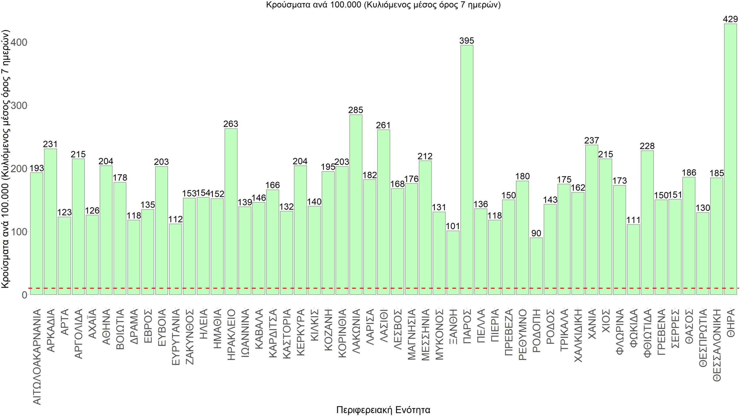 Σχήμα 60. Συγκεντρωτική εικόνα των νέων κρουσμάτων ανά 100.000 κατοίκους (κυλιόμενος μέσος όρος 7 ημερών) των επιμέρους περιοχών