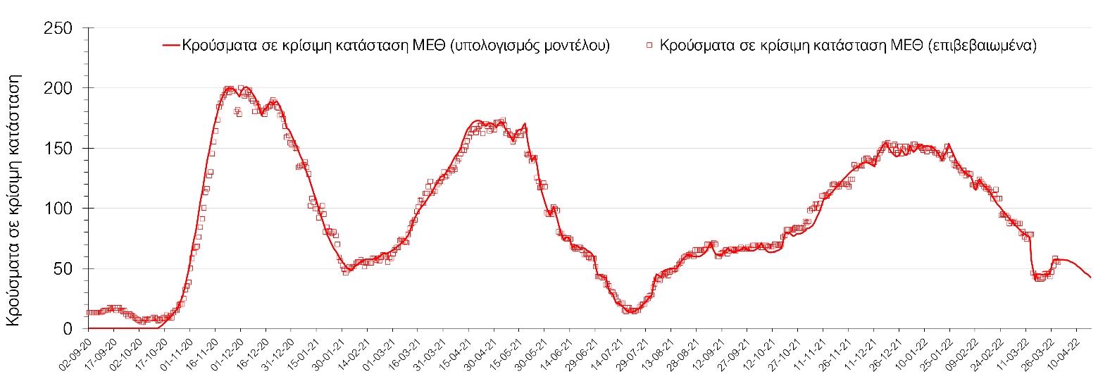 Σχήμα 1. Αριθμός κρουσμάτων σε κρίσιμη κατάσταση (ΜΕΘ) σύμφωνα με τα στοιχεία του ΕΟΔΥ και τις προβλέψεις της υπολογιστικής πλατφόρμας CORE.