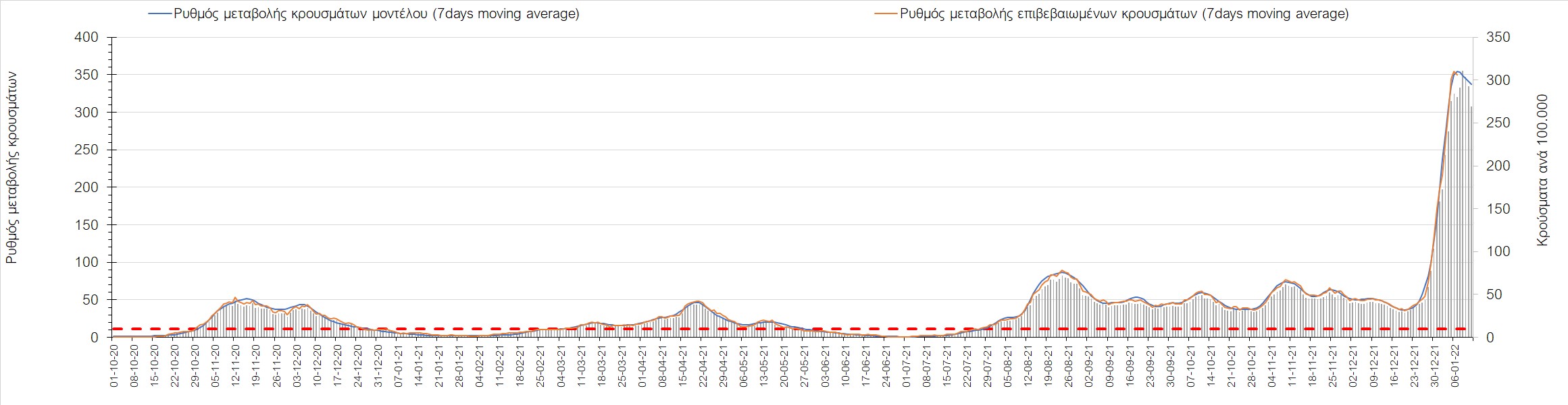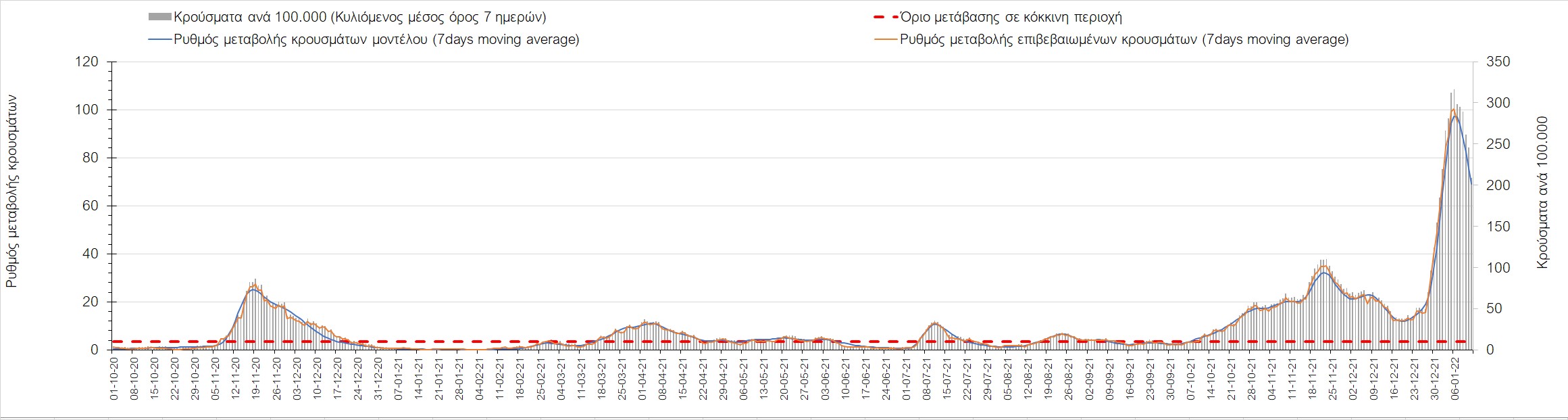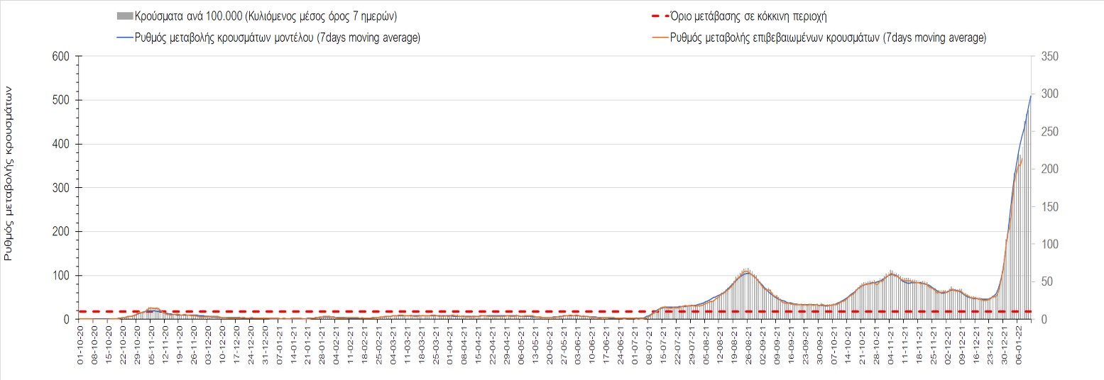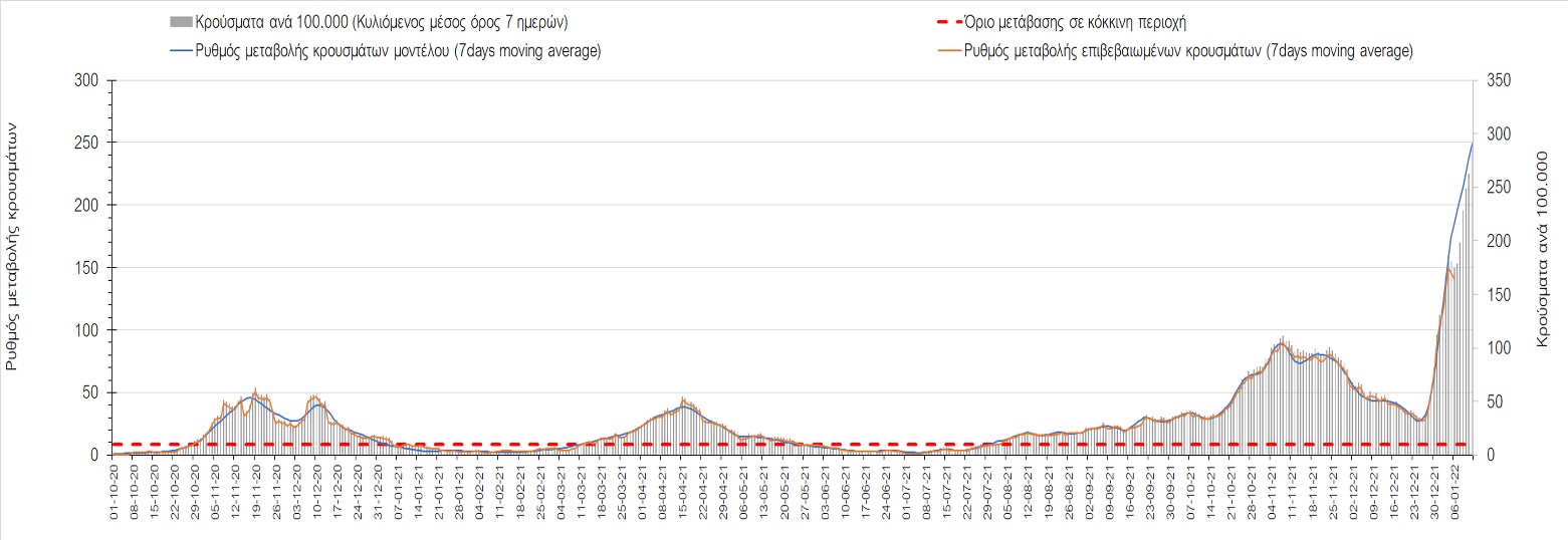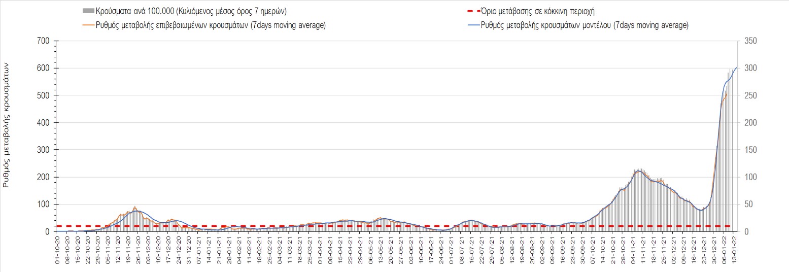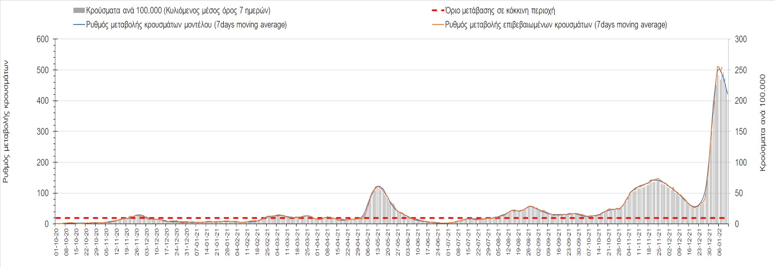 Αυτές τις ημέρες, παρατηρείται σημαντική επιβράδυνση του αριθμού των κρουσμάτων μετά από την πολύ έντονη άνοδο, η οποία πλέον είναι αποδεδειγμένο ότι οφείλεται στη διασπορά του στελέχους Ο στον πληθυσμό. Η εκτίμησή μας είναι ότι πάνω από το 95% των νέων κρουσμάτων στην ελληνική επικράτεια αφορά πια στο στέλεχος Ο. Δεδομένου ότι η αύξηση της διασποράς της παραλλαγής Ο στον ελληνικό πληθυσμό εξηγεί την παρατηρούμενη αύξηση της συνολικής διασποράς του ιού, πλέον το βάρος πέφτει στην εφαρμογή των μέτρων αντιμετώπισης της διασποράς του ιού, η οποία προβλέπεται να αναπτυχθεί περαιτέρω μέχρι τα μέσα Ιανουαρίου. Και για σήμερα παρατηρείται πτώση του αριθμού των κρουσμάτων (κυλιόμενος μέσος όρος 7 ημερών), και μένει να δούμε στις επόμενες ημέρες, εάν αυτή η μείωση είναι αποτέλεσμα της ελλιπούς καταγραφής των κρουσμάτων λόγω των συνεχόμενων εορταστικών αργιών και θα υπάρξει συνέχιση της ανοδικής πορείας, ή εάν άρχισε νωρίτερα η κάμψη του 5ου κύματος.