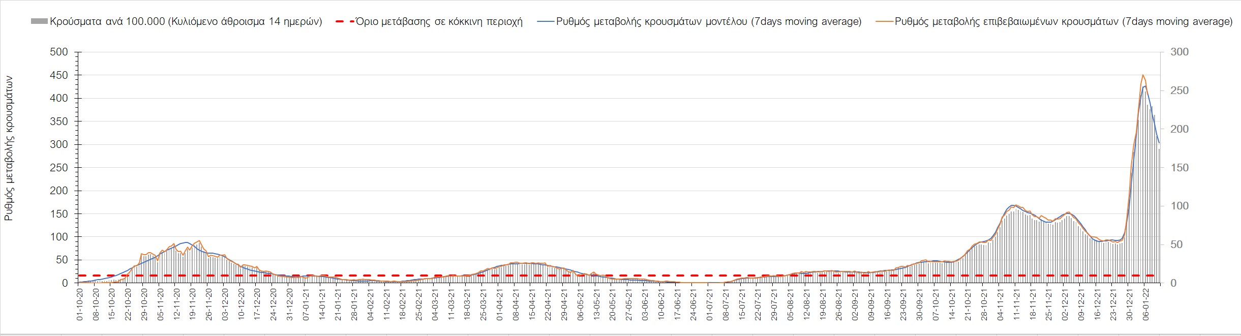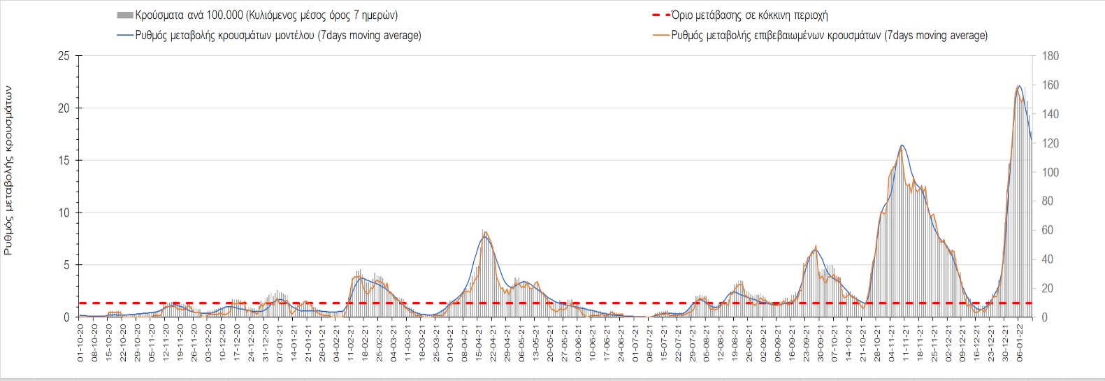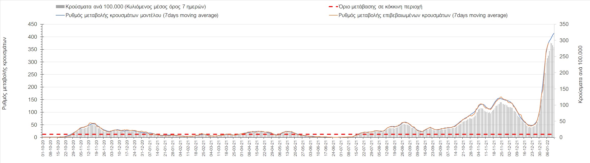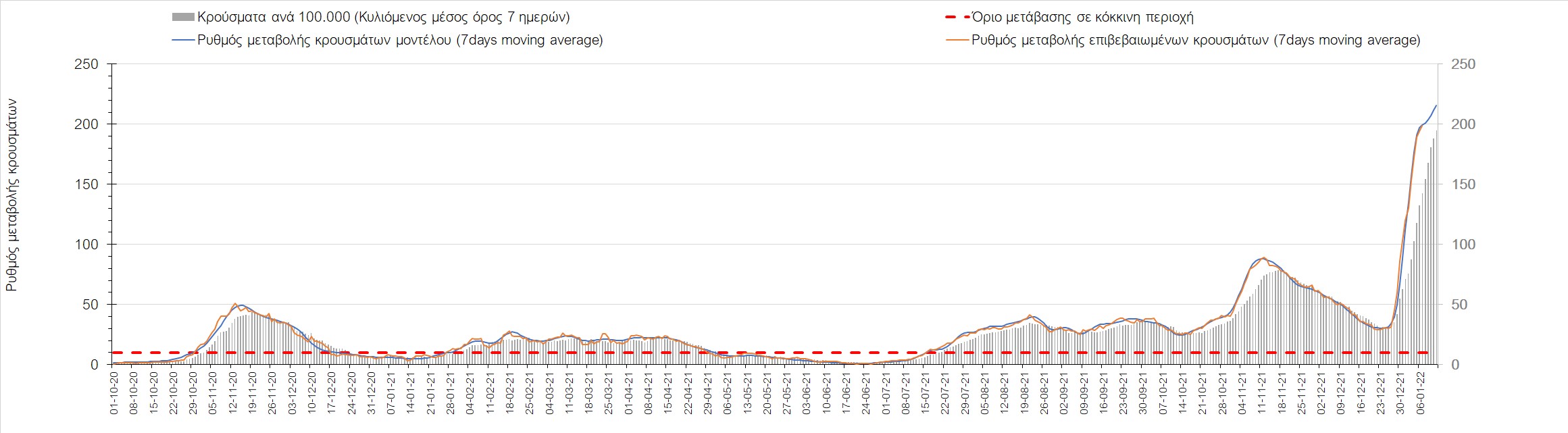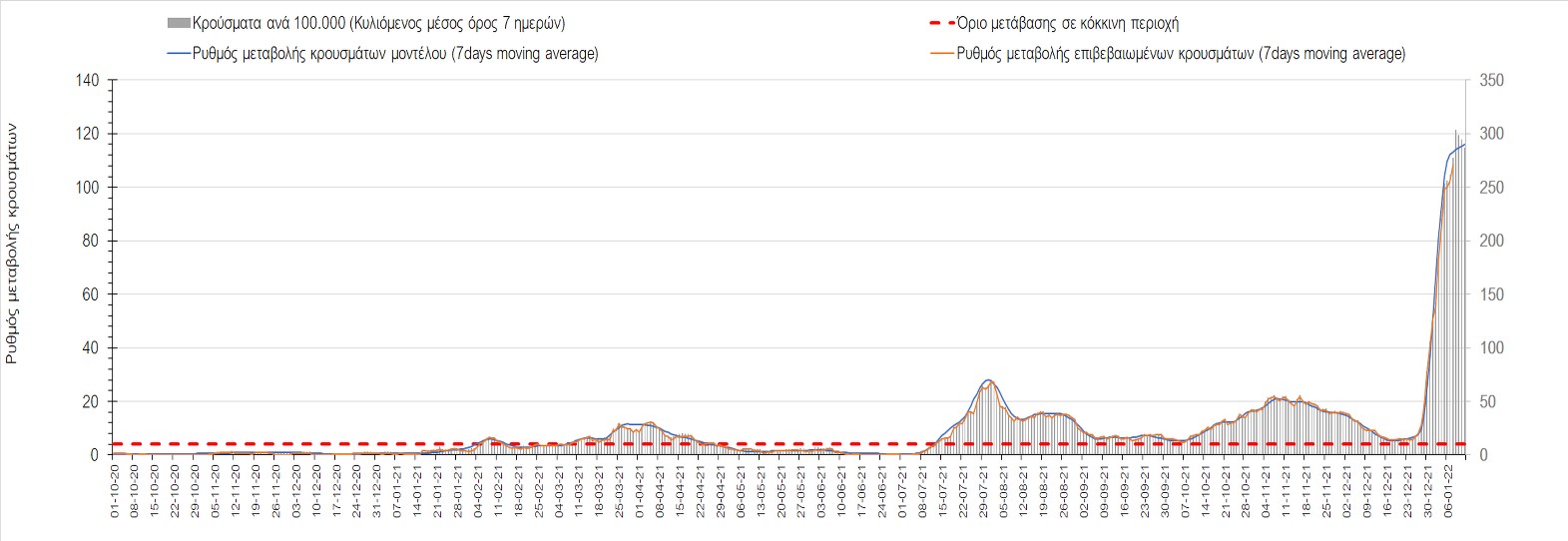 Αυτές τις ημέρες, παρατηρείται σημαντική επιβράδυνση του αριθμού των κρουσμάτων μετά από την πολύ έντονη άνοδο, η οποία πλέον είναι αποδεδειγμένο ότι οφείλεται στη διασπορά του στελέχους Ο στον πληθυσμό. Η εκτίμησή μας είναι ότι πάνω από το 95% των νέων κρουσμάτων στην ελληνική επικράτεια αφορά πια στο στέλεχος Ο. Δεδομένου ότι η αύξηση της διασποράς της παραλλαγής Ο στον ελληνικό πληθυσμό εξηγεί την παρατηρούμενη αύξηση της συνολικής διασποράς του ιού, πλέον το βάρος πέφτει στην εφαρμογή των μέτρων αντιμετώπισης της διασποράς του ιού, η οποία προβλέπεται να αναπτυχθεί περαιτέρω μέχρι τα μέσα Ιανουαρίου. Και για σήμερα παρατηρείται πτώση του αριθμού των κρουσμάτων (κυλιόμενος μέσος όρος 7 ημερών), και μένει να δούμε στις επόμενες ημέρες, εάν αυτή η μείωση είναι αποτέλεσμα της ελλιπούς καταγραφής των κρουσμάτων λόγω των συνεχόμενων εορταστικών αργιών και θα υπάρξει συνέχιση της ανοδικής πορείας, ή εάν άρχισε νωρίτερα η κάμψη του 5ου κύματος.