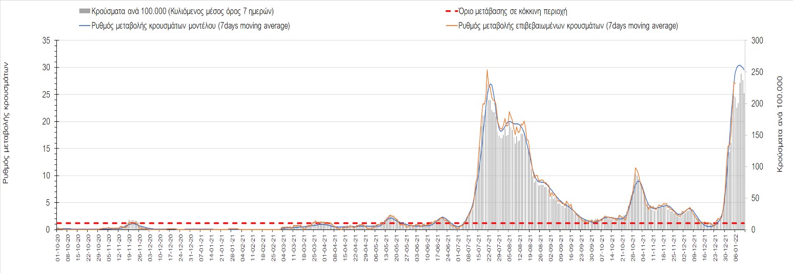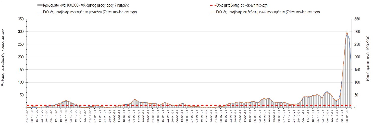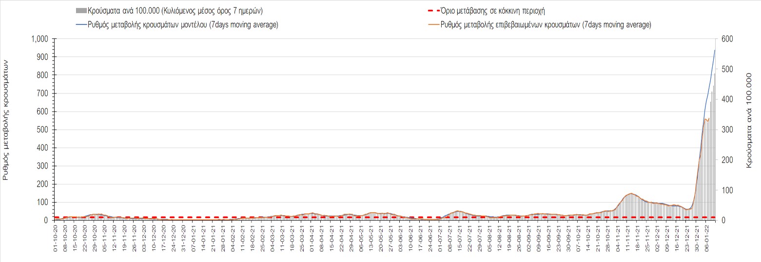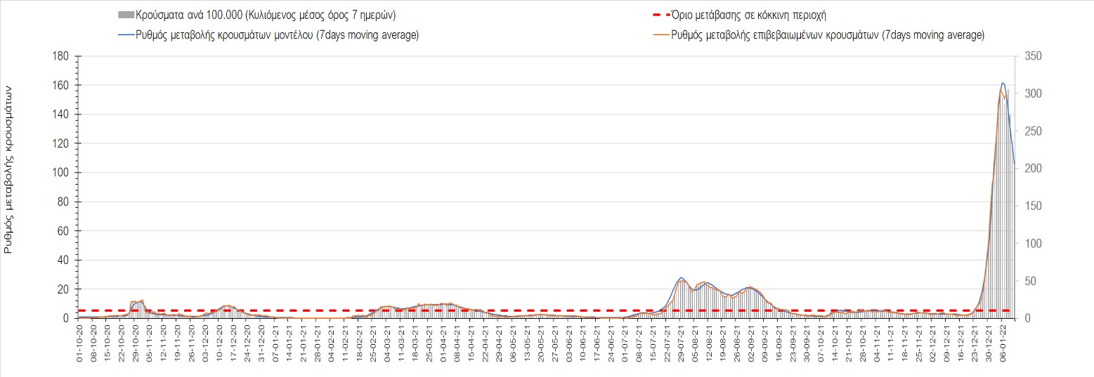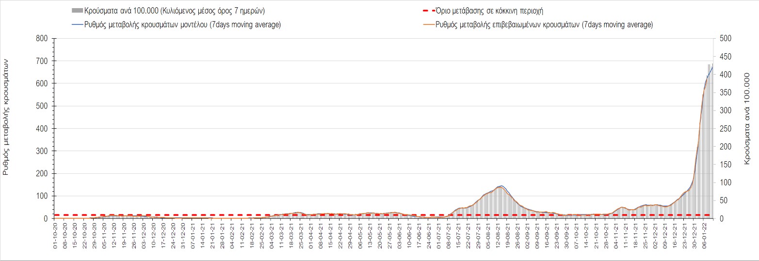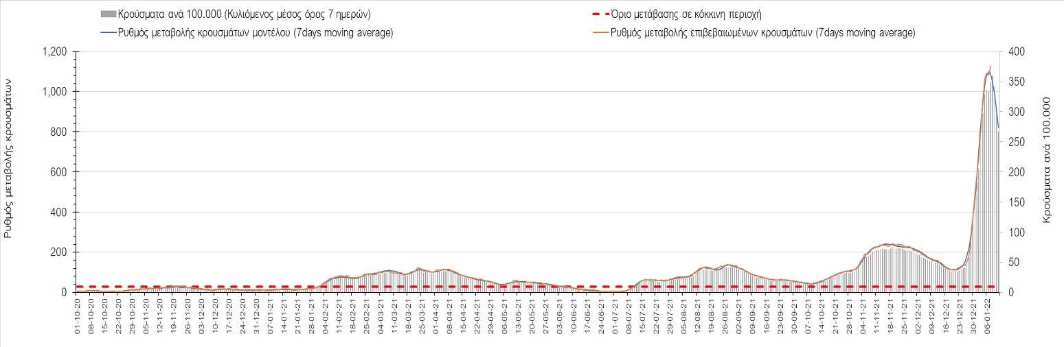 Η ανοδική τάση που είχε διαμορφωθεί από τις 23/12 και που οφείλεται στην μετάλλαξη Ο, παρουσιάζει σημαντική επιβράδυνση, και αντικατοπτρίζεται στον ημερήσιο αριθμό των κρουσμάτων (κυλιόμενος μέσος όρος 7 ημερών), ο οποίος βρίσκεται κάτω από τις 36000 (35445). Αξίζει να σημειωθεί ότι σε αρκετές περιοχές παρουσιάζεται επιβράδυνση του ρυθμού ανόδου ή ακόμα και κάμψη, πράγμα που σημαίνει ότι τα μέτρα που εφαρμοστήκαν στις 24 και 29/12, άρχισαν να αποδίδουν, ενώ το πότε και σε τι ύψος θα κορυφωθεί το 5ο κύμα σε κάθε περιοχή θα εξαρτηθεί σε σημαντικό βαθμό, πέρα από την εφαρμογή των μέτρων, και από το ποσοστό εμβολιασμού (και μάλιστα με 3η δόση). Παρά του ότι και σήμερα, μετά από 18 ημέρες συνεχόμενης ανόδου και 2 μέρες πτώσης παρατηρείται άνοδος του αριθμού των κρουσμάτων (στον κυλιόμενο μέσο όρο 7 ημερών), μένει να δούμε στις επόμενες ημέρες, εάν η μείωση των προηγουμένων 2 ημερών είναι αποτέλεσμα της μη πλήρους καταγραφής των κρουσμάτων λόγω των συνεχόμενων εορταστικών αργιών και θα ακολουθήσει συνέχιση της ανοδικής πορείας, ή εάν άρχισε νωρίτερα η κάμψη του 5ου κύματος λόγω της αποτελεσματικής εφαρμογής των μέτρων που ανακοινώθηκαν στις 24 και 29 Δεκεμβρίου, σε συνδυασμό με την σημαντική συνειδητοποίηση εκ μέρους του πληθυσμού ότι χρειάζεται προσοχή και σύνεση για την αντιμετώπιση της διασποράς της παραλλαγής Ο. Πέρα από την εφαρμογή των μέτρων, η συστηματική αποκλιμάκωση της πανδημίας (της οποίας η έναρξη όπως ήδη βλέπουμε να τοποθετείται σε διαφορετικό χρονικό σημείο ανά περιοχή) θα οφείλεται στο συνδυασμό των επιπέδων ανοσίας του πληθυσμού (επίκτητη και φυσική), αλλά και στον πολύ μεγάλο αριθμό των τεστ συνολικά (μοριακά, rapid και self-test) που πραγματοποιούνται καθημερινά, των οποίων ο αριθμός έχει φθάσει σε ημερήσια βάση τις 700.000.