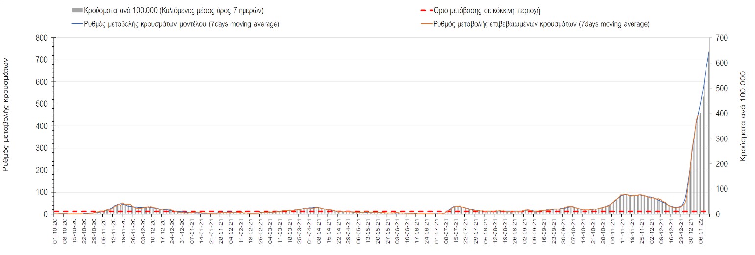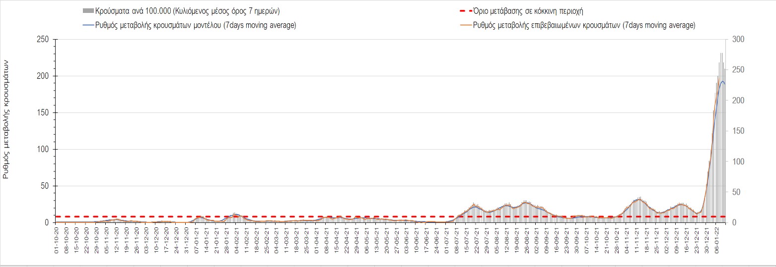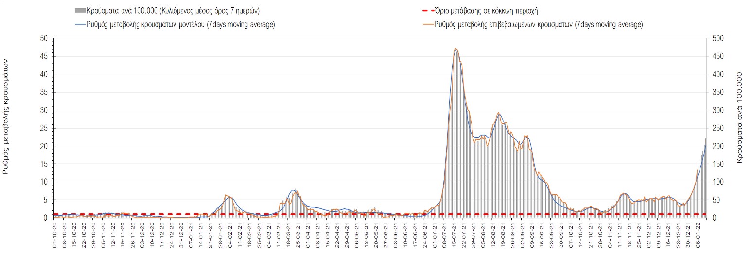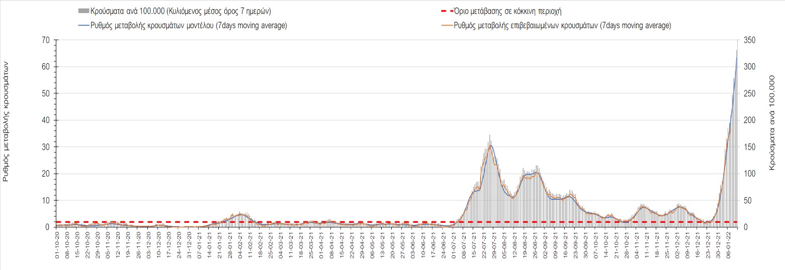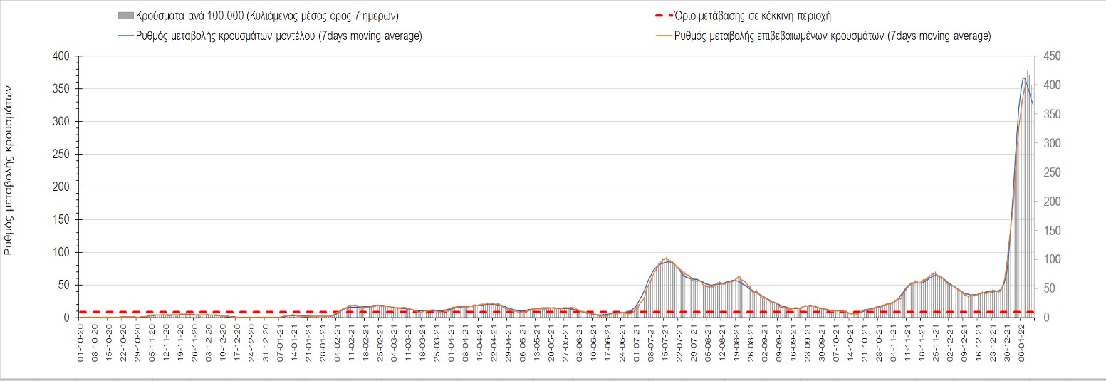 Η ανοδική τάση που είχε διαμορφωθεί από τις 23/12 και που οφείλεται στην μετάλλαξη Ο, παρουσιάζει σημαντική επιβράδυνση, και αντικατοπτρίζεται στον ημερήσιο αριθμό των κρουσμάτων (κυλιόμενος μέσος όρος 7 ημερών), ο οποίος βρίσκεται κάτω από τις 36000 (35445). Αξίζει να σημειωθεί ότι σε αρκετές περιοχές παρουσιάζεται επιβράδυνση του ρυθμού ανόδου ή ακόμα και κάμψη, πράγμα που σημαίνει ότι τα μέτρα που εφαρμοστήκαν στις 24 και 29/12, άρχισαν να αποδίδουν, ενώ το πότε και σε τι ύψος θα κορυφωθεί το 5ο κύμα σε κάθε περιοχή θα εξαρτηθεί σε σημαντικό βαθμό, πέρα από την εφαρμογή των μέτρων, και από το ποσοστό εμβολιασμού (και μάλιστα με 3η δόση). Παρά του ότι και σήμερα, μετά από 18 ημέρες συνεχόμενης ανόδου και 2 μέρες πτώσης παρατηρείται άνοδος του αριθμού των κρουσμάτων (στον κυλιόμενο μέσο όρο 7 ημερών), μένει να δούμε στις επόμενες ημέρες, εάν η μείωση των προηγουμένων 2 ημερών είναι αποτέλεσμα της μη πλήρους καταγραφής των κρουσμάτων λόγω των συνεχόμενων εορταστικών αργιών και θα ακολουθήσει συνέχιση της ανοδικής πορείας, ή εάν άρχισε νωρίτερα η κάμψη του 5ου κύματος λόγω της αποτελεσματικής εφαρμογής των μέτρων που ανακοινώθηκαν στις 24 και 29 Δεκεμβρίου, σε συνδυασμό με την σημαντική συνειδητοποίηση εκ μέρους του πληθυσμού ότι χρειάζεται προσοχή και σύνεση για την αντιμετώπιση της διασποράς της παραλλαγής Ο. Πέρα από την εφαρμογή των μέτρων, η συστηματική αποκλιμάκωση της πανδημίας (της οποίας η έναρξη όπως ήδη βλέπουμε να τοποθετείται σε διαφορετικό χρονικό σημείο ανά περιοχή) θα οφείλεται στο συνδυασμό των επιπέδων ανοσίας του πληθυσμού (επίκτητη και φυσική), αλλά και στον πολύ μεγάλο αριθμό των τεστ συνολικά (μοριακά, rapid και self-test) που πραγματοποιούνται καθημερινά, των οποίων ο αριθμός έχει φθάσει σε ημερήσια βάση τις 700.000.