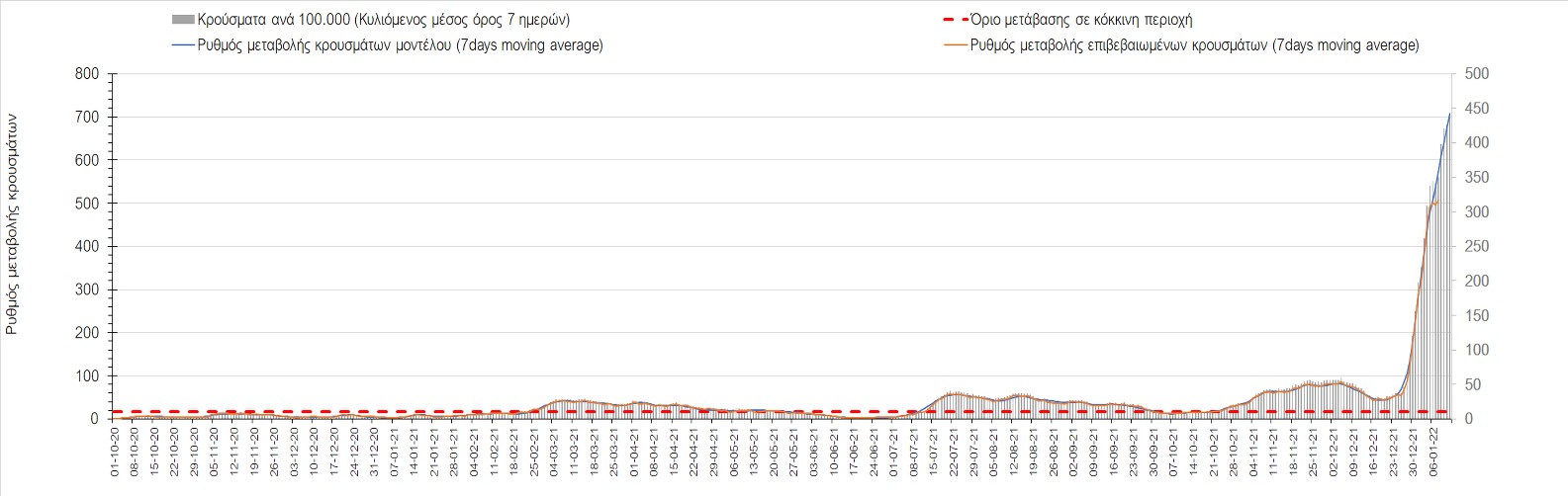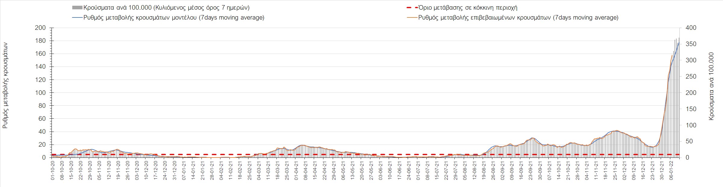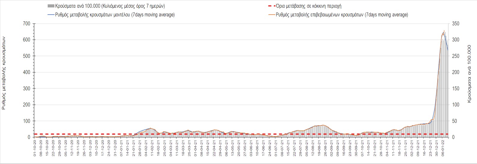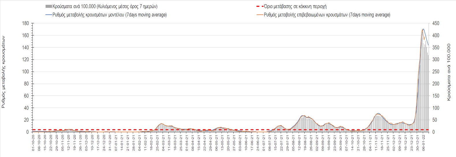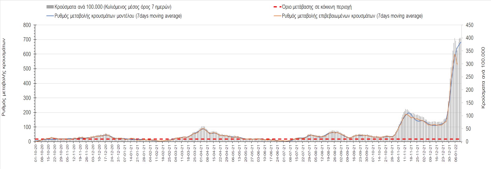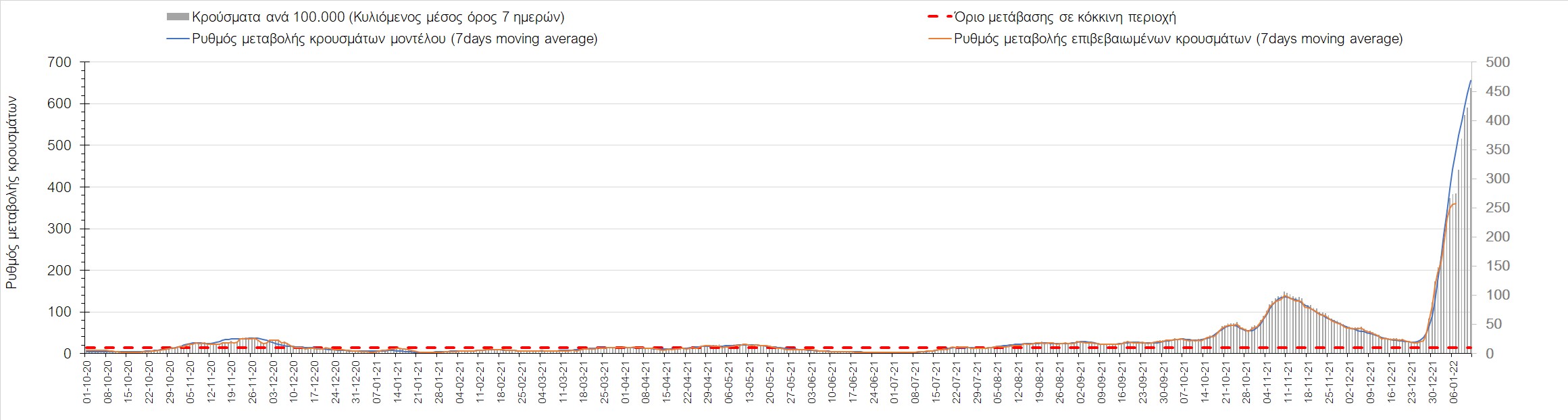 Η ανοδική τάση που είχε διαμορφωθεί από τις 23/12 και που οφείλεται στην μετάλλαξη Ο, παρουσιάζει σημαντική επιβράδυνση, και αντικατοπτρίζεται στον ημερήσιο αριθμό των κρουσμάτων (κυλιόμενος μέσος όρος 7 ημερών), ο οποίος βρίσκεται κάτω από τις 36000 (35445). Αξίζει να σημειωθεί ότι σε αρκετές περιοχές παρουσιάζεται επιβράδυνση του ρυθμού ανόδου ή ακόμα και κάμψη, πράγμα που σημαίνει ότι τα μέτρα που εφαρμοστήκαν στις 24 και 29/12, άρχισαν να αποδίδουν, ενώ το πότε και σε τι ύψος θα κορυφωθεί το 5ο κύμα σε κάθε περιοχή θα εξαρτηθεί σε σημαντικό βαθμό, πέρα από την εφαρμογή των μέτρων, και από το ποσοστό εμβολιασμού (και μάλιστα με 3η δόση). Παρά του ότι και σήμερα, μετά από 18 ημέρες συνεχόμενης ανόδου και 2 μέρες πτώσης παρατηρείται άνοδος του αριθμού των κρουσμάτων (στον κυλιόμενο μέσο όρο 7 ημερών), μένει να δούμε στις επόμενες ημέρες, εάν η μείωση των προηγουμένων 2 ημερών είναι αποτέλεσμα της μη πλήρους καταγραφής των κρουσμάτων λόγω των συνεχόμενων εορταστικών αργιών και θα ακολουθήσει συνέχιση της ανοδικής πορείας, ή εάν άρχισε νωρίτερα η κάμψη του 5ου κύματος λόγω της αποτελεσματικής εφαρμογής των μέτρων που ανακοινώθηκαν στις 24 και 29 Δεκεμβρίου, σε συνδυασμό με την σημαντική συνειδητοποίηση εκ μέρους του πληθυσμού ότι χρειάζεται προσοχή και σύνεση για την αντιμετώπιση της διασποράς της παραλλαγής Ο. Πέρα από την εφαρμογή των μέτρων, η συστηματική αποκλιμάκωση της πανδημίας (της οποίας η έναρξη όπως ήδη βλέπουμε να τοποθετείται σε διαφορετικό χρονικό σημείο ανά περιοχή) θα οφείλεται στο συνδυασμό των επιπέδων ανοσίας του πληθυσμού (επίκτητη και φυσική), αλλά και στον πολύ μεγάλο αριθμό των τεστ συνολικά (μοριακά, rapid και self-test) που πραγματοποιούνται καθημερινά, των οποίων ο αριθμός έχει φθάσει σε ημερήσια βάση τις 700.000.
