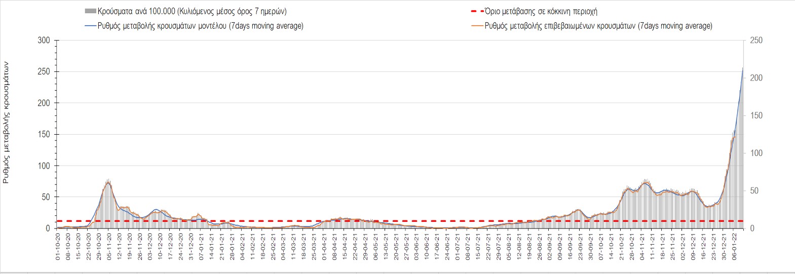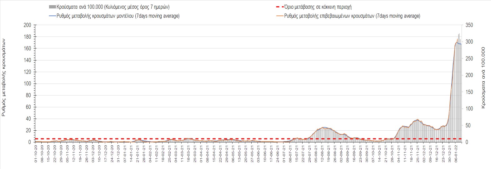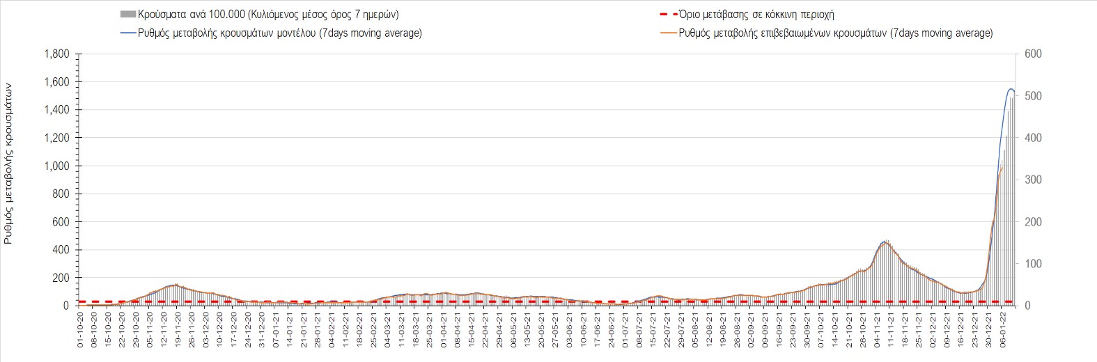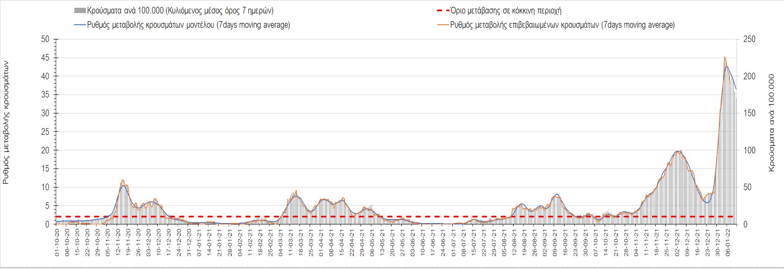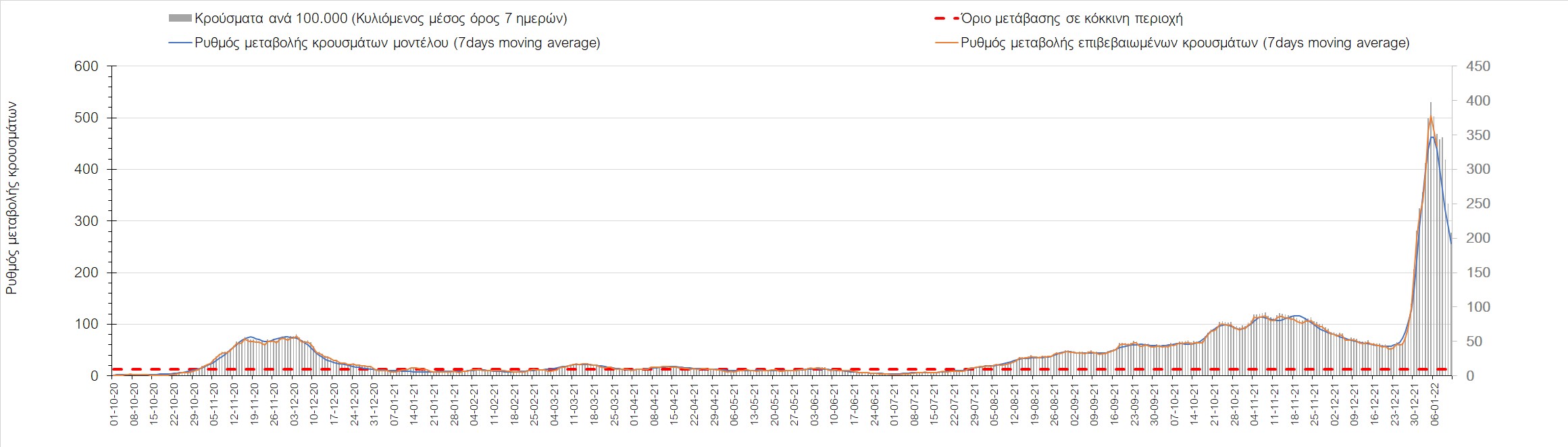 Η ανοδική τάση που είχε διαμορφωθεί από τις 23/12 και που οφείλεται στην μετάλλαξη Ο, παρουσιάζει σημαντική επιβράδυνση, και αντικατοπτρίζεται στον ημερήσιο αριθμό των κρουσμάτων (κυλιόμενος μέσος όρος 7 ημερών), ο οποίος βρίσκεται κάτω από τις 36000 (35445). Αξίζει να σημειωθεί ότι σε αρκετές περιοχές παρουσιάζεται επιβράδυνση του ρυθμού ανόδου ή ακόμα και κάμψη, πράγμα που σημαίνει ότι τα μέτρα που εφαρμοστήκαν στις 24 και 29/12, άρχισαν να αποδίδουν, ενώ το πότε και σε τι ύψος θα κορυφωθεί το 5ο κύμα σε κάθε περιοχή θα εξαρτηθεί σε σημαντικό βαθμό, πέρα από την εφαρμογή των μέτρων, και από το ποσοστό εμβολιασμού (και μάλιστα με 3η δόση). Παρά του ότι και σήμερα, μετά από 18 ημέρες συνεχόμενης ανόδου και 2 μέρες πτώσης παρατηρείται άνοδος του αριθμού των κρουσμάτων (στον κυλιόμενο μέσο όρο 7 ημερών), μένει να δούμε στις επόμενες ημέρες, εάν η μείωση των προηγουμένων 2 ημερών είναι αποτέλεσμα της μη πλήρους καταγραφής των κρουσμάτων λόγω των συνεχόμενων εορταστικών αργιών και θα ακολουθήσει συνέχιση της ανοδικής πορείας, ή εάν άρχισε νωρίτερα η κάμψη του 5ου κύματος λόγω της αποτελεσματικής εφαρμογής των μέτρων που ανακοινώθηκαν στις 24 και 29 Δεκεμβρίου, σε συνδυασμό με την σημαντική συνειδητοποίηση εκ μέρους του πληθυσμού ότι χρειάζεται προσοχή και σύνεση για την αντιμετώπιση της διασποράς της παραλλαγής Ο. Πέρα από την εφαρμογή των μέτρων, η συστηματική αποκλιμάκωση της πανδημίας (της οποίας η έναρξη όπως ήδη βλέπουμε να τοποθετείται σε διαφορετικό χρονικό σημείο ανά περιοχή) θα οφείλεται στο συνδυασμό των επιπέδων ανοσίας του πληθυσμού (επίκτητη και φυσική), αλλά και στον πολύ μεγάλο αριθμό των τεστ συνολικά (μοριακά, rapid και self-test) που πραγματοποιούνται καθημερινά, των οποίων ο αριθμός έχει φθάσει σε ημερήσια βάση τις 700.000.