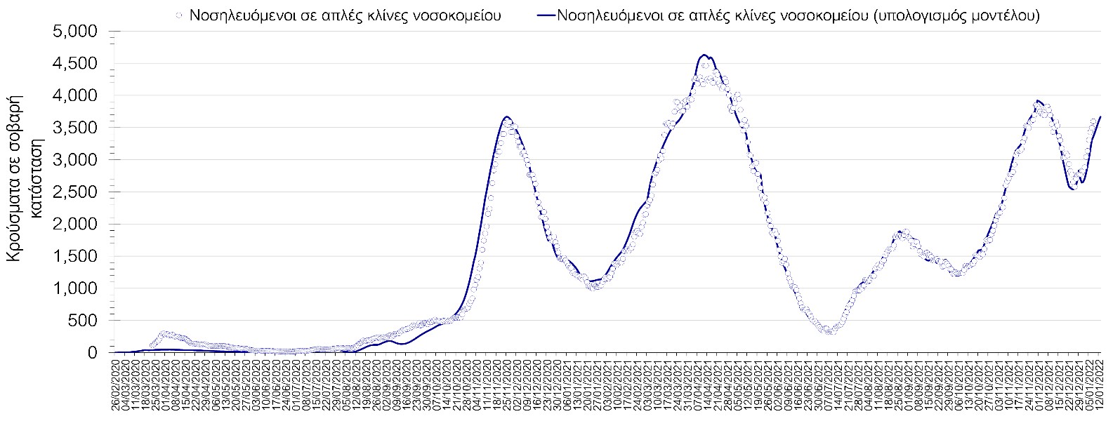 Σχήμα 2. Αριθμός κρουσμάτων σε σοβαρή κατάσταση (νοσηλευόμενοι σε απλές κλίνες) σύμφωνα με τα στοιχεία του ΕΟΔΥ και τις προβλέψεις της υπολογιστικής πλατφόρμας CORE.