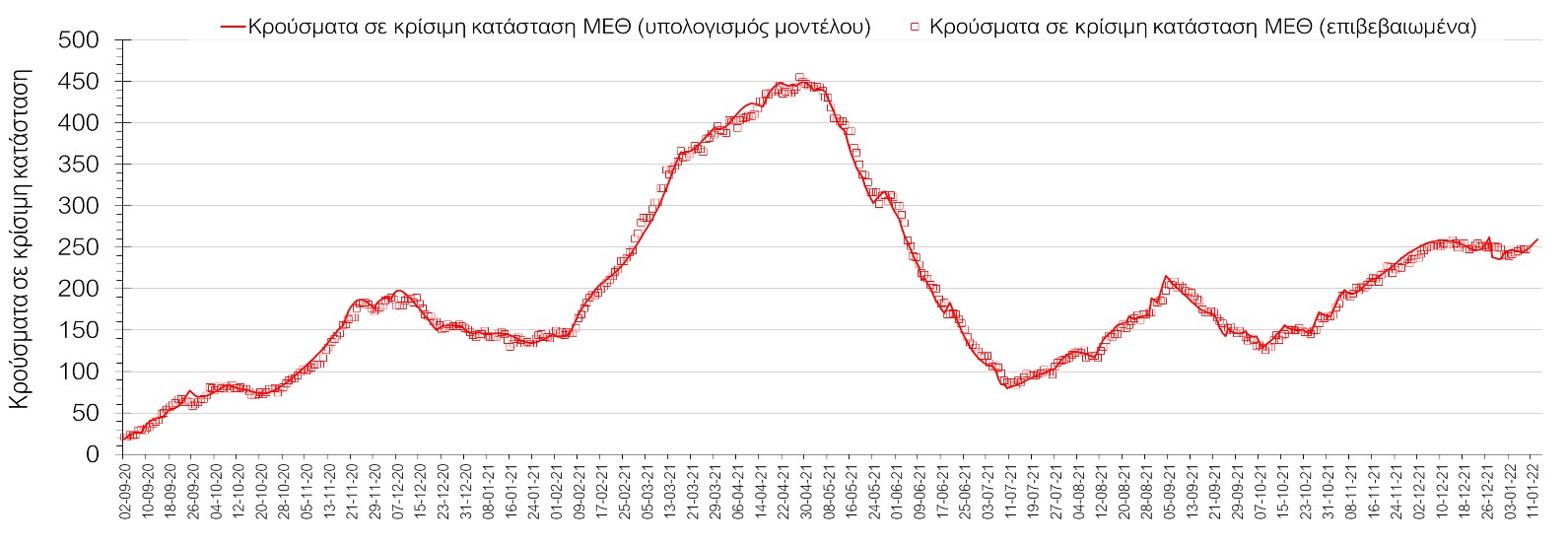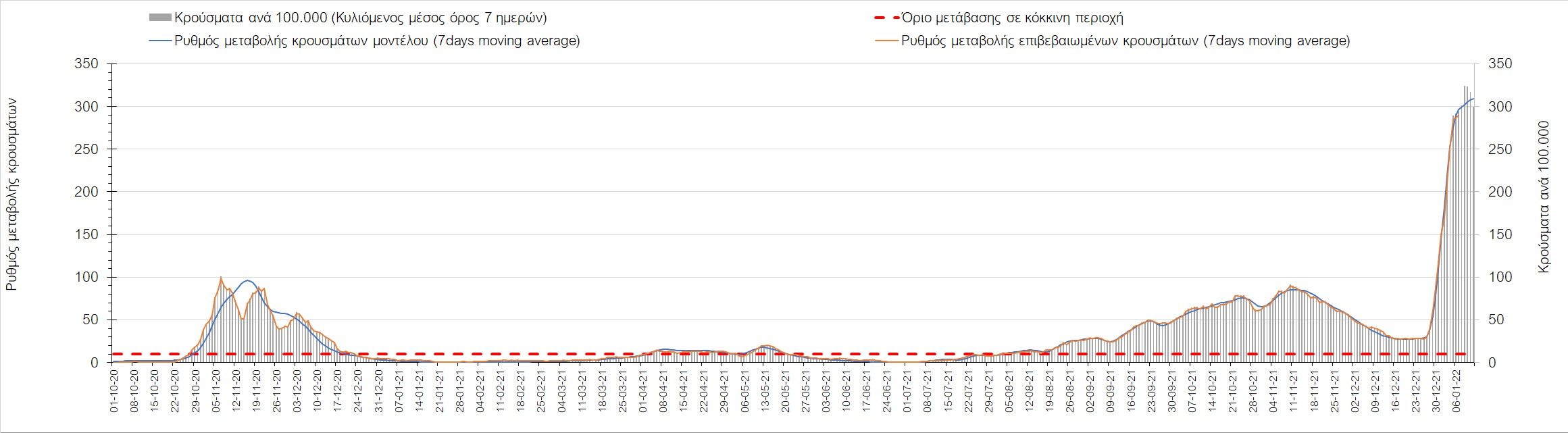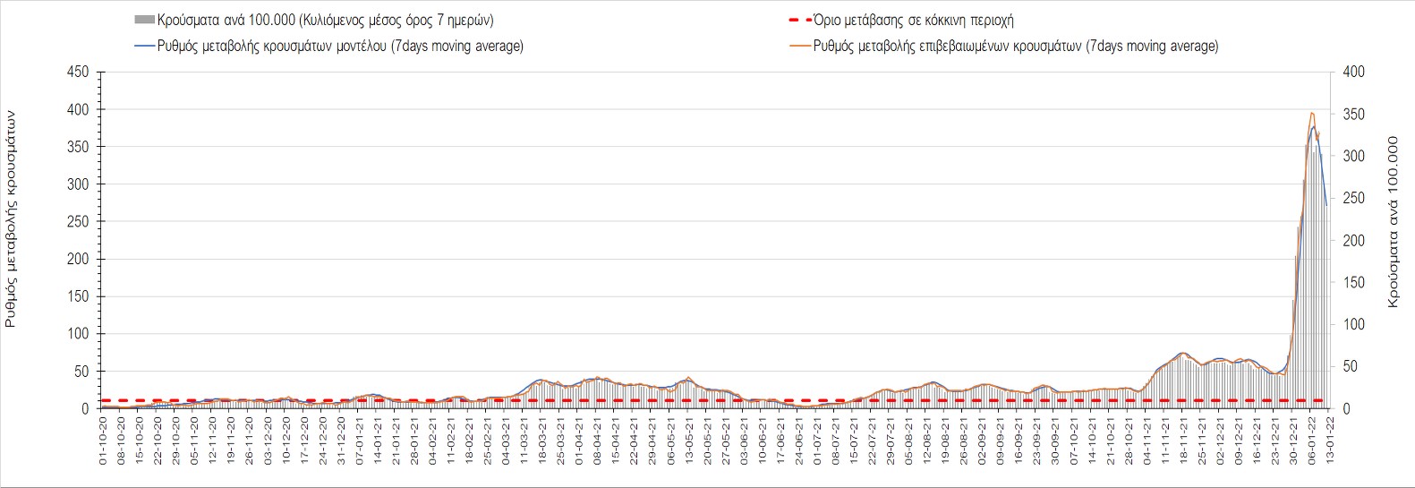 Η πορεία της μέσης εβδομαδιαίας τιμής των κρουσμάτων, καθώς και του κυλιόμενου μέσου όρου 7 ημερών του αριθμού των κρουσμάτων ανά 100.000 πληθυσμού, όπως έχουν καταγραφεί από τον ΕΟΔΥ και η αναμενόμενη πορεία τους όπως προδιαγράφεται από την υπολογιστική πλατφόρμα CORE για την Ελληνική επικράτεια μέχρι τις 15 Ιανουαρίου, αποτυπώνονται στο Σχήμα 4. Αυτή η προβλεπόμενη πορεία, που αφορά τα κρούσματα, τους νοσηλευόμενους σε απλές κλίνες, όσο και σε ΜΕΘ, καθώς επίσης και τους θανάτους, βασίζεται στις ακόλουθες παραδοχές: