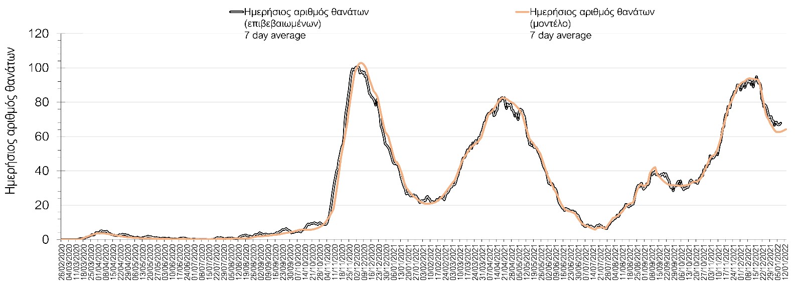 Σχήμα 3. Αριθμός θανάτων (κυλιόμενος μέσος όρος 7 ημερών) σύμφωνα με τα στοιχεία του ΕΟΔΥ και τις προβλέψεις της υπολογιστικής πλατφόρμας CORE.