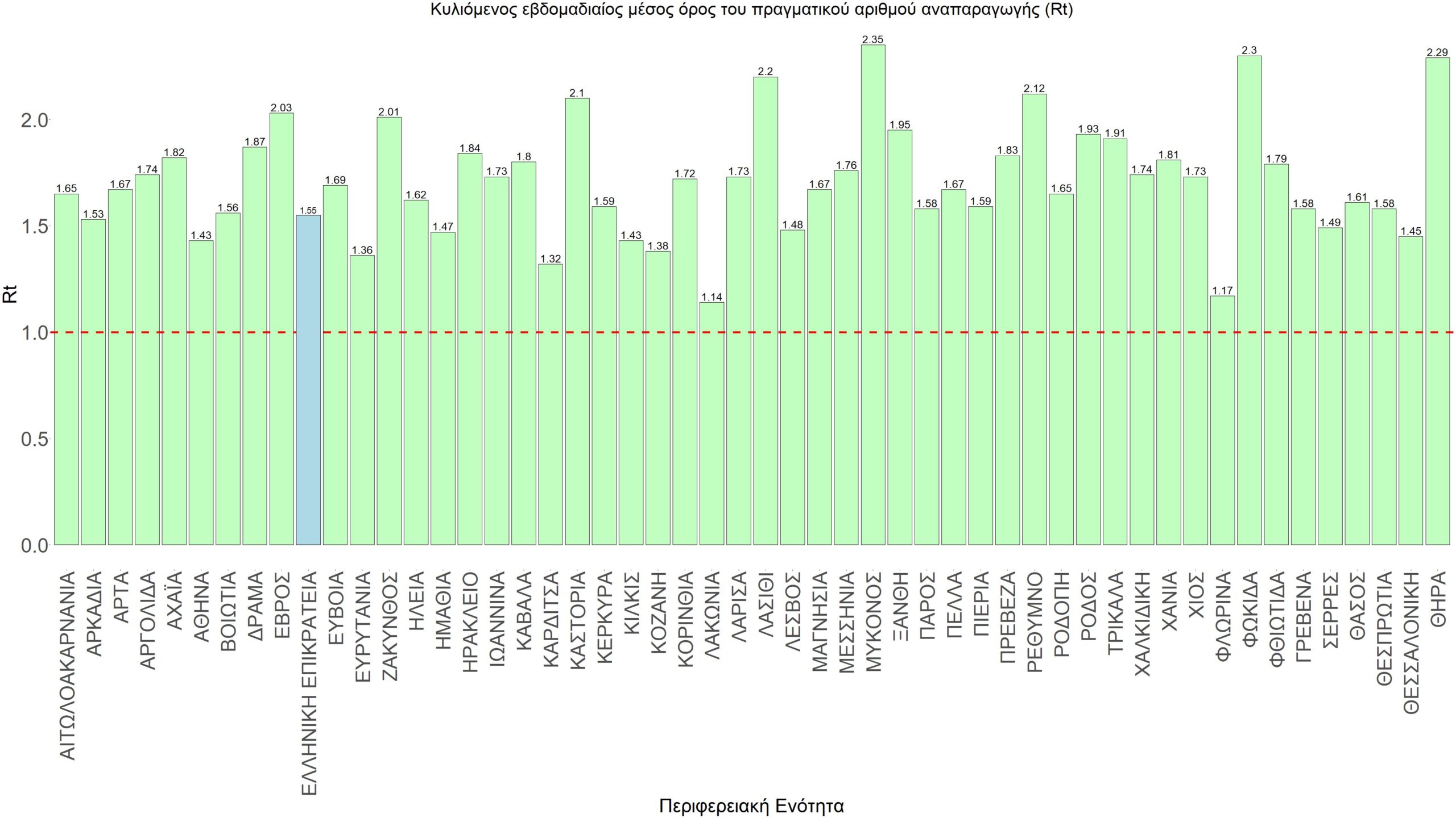 O πραγματικός αριθμός αναπαραγωγής Rt ανά περιφερειακή ενότητα της χώρας παρουσιάζεται στο Σχήμα 58.