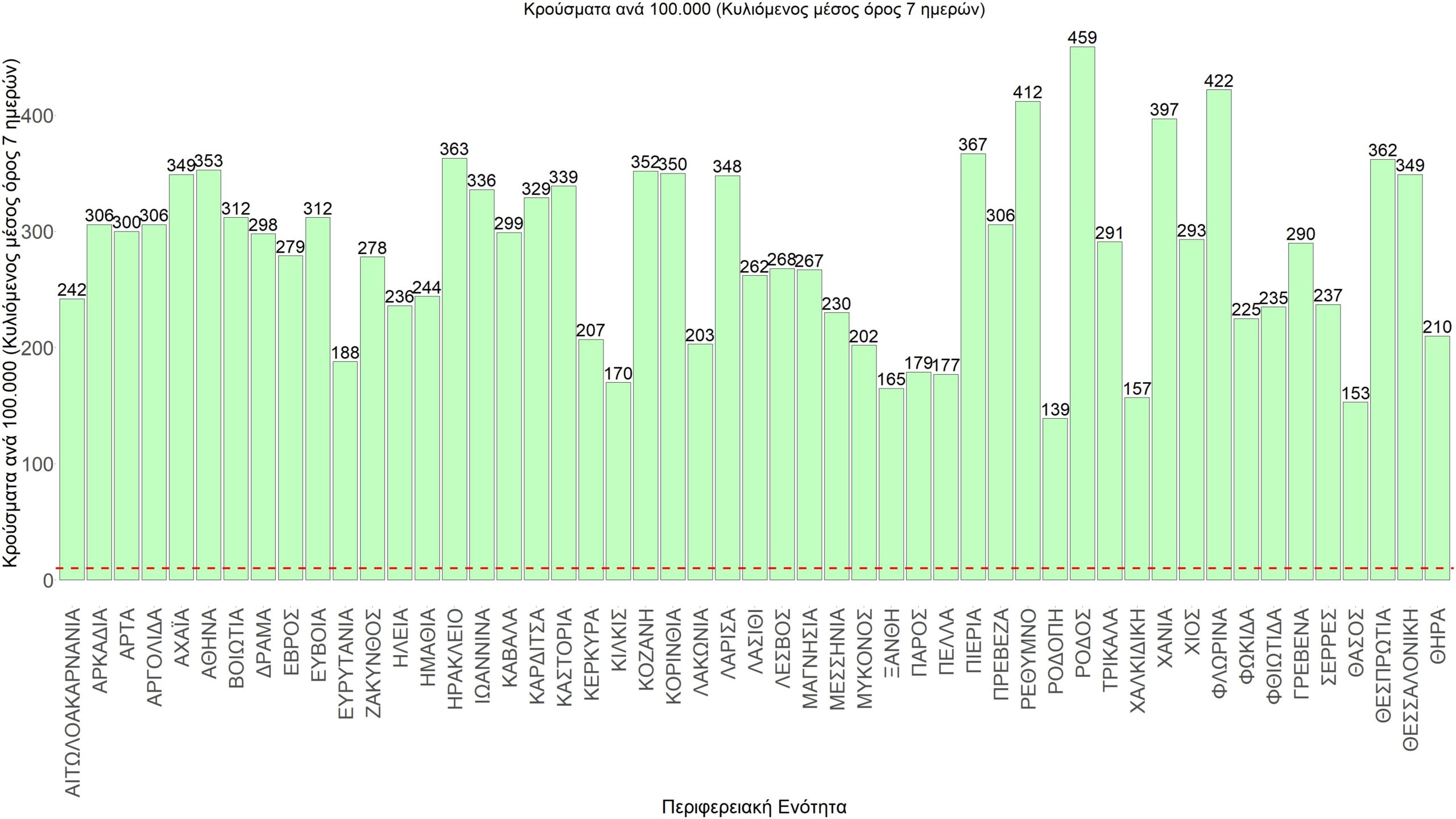 Η αποτύπωση των τάσεων στις επιμέρους περιοχές, παρουσιάζεται στο Σχήμα 61, όπου παρουσιάζεται ο ρυθμός μεταβολής των νέων κρουσμάτων ανά 100.000 κατοίκους (κυλιόμενος μέσος όρος 7 ημερών) των επιμέρους περιοχών. Θετικές τιμές του ρυθμού μεταβολής υποδηλώνουν άνοδο, ενώ αρνητικές τιμές υποδηλώνουν πτωτική πορεία. Το σχήμα αυτό είναι ιδιαίτερα κατατοπιστικό, γιατί οι τιμές που παρουσιάζονται είναι κανονικοποιημένες ως προς τον πληθυσμό, και η σύγκριση των τάσεων ανάμεσα στις επιμέρους περιοχές είναι άμεση.