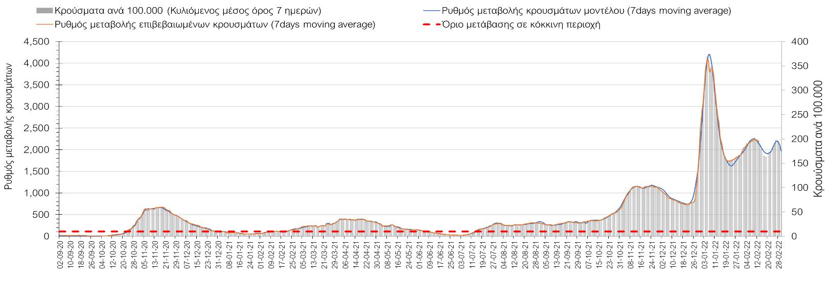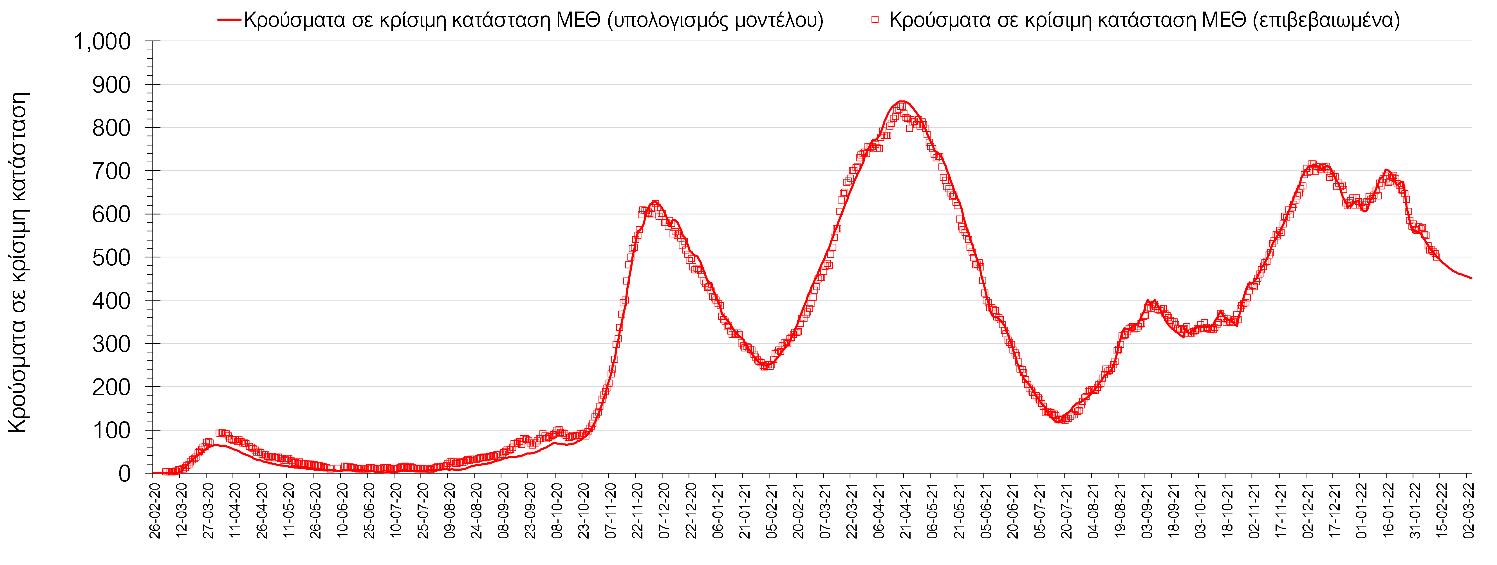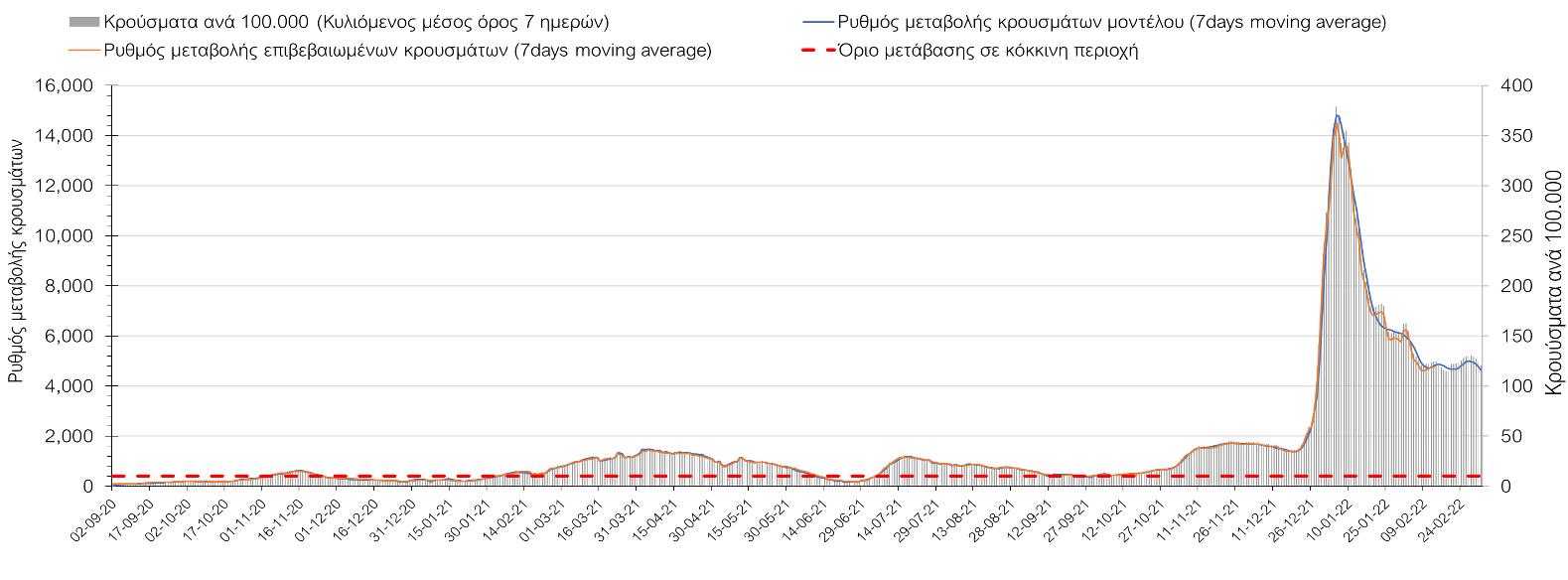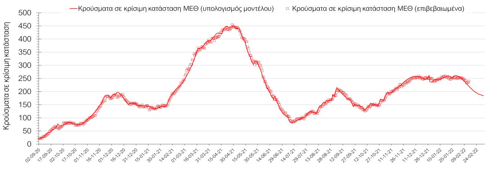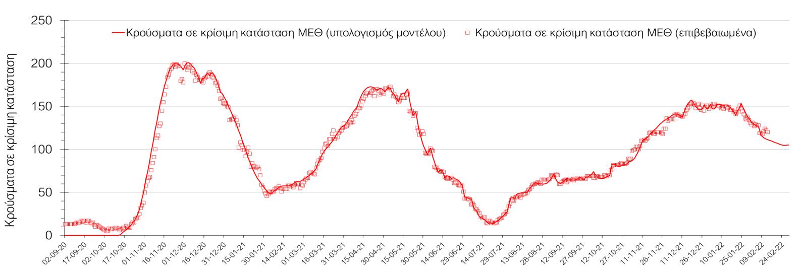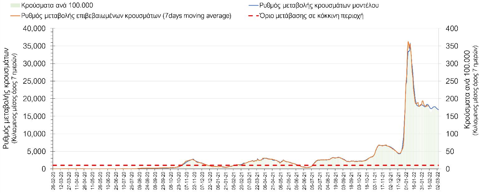 Η πορεία της μέσης εβδομαδιαίας τιμής των κρουσμάτων, καθώς και του κυλιόμενου μέσου όρου 7 ημερών του αριθμού των κρουσμάτων ανά 100.000 πληθυσμού, όπως έχουν καταγραφεί από τον ΕΟΔΥ και η αναμενόμενη πορεία τους, όπως προδιαγράφεται από την υπολογιστική πλατφόρμα CORE για την Ελληνική επικράτεια μέχρι τις 15 Φεβρουαρίου, αποτυπώνονται στο Σχήμα 4. Αυτή η προβλεπόμενη πορεία, που αφορά τα κρούσματα, τους νοσηλευόμενους σε απλές κλίνες, όσο και σε ΜΕΘ, καθώς επίσης και τους θανάτους, βασίζεται στις ακόλουθες παραδοχές:
