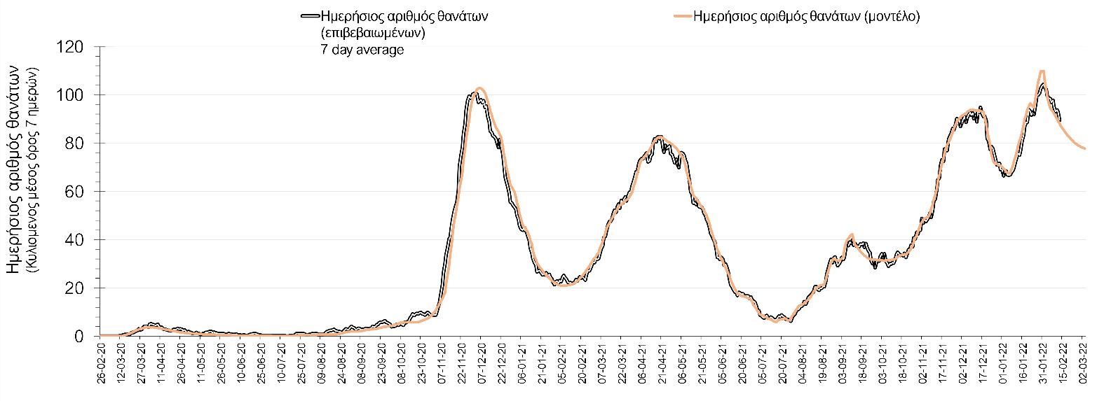 Ο αριθμός ημερήσιων θανάτων (72) που καταγράφηκε είναι υψηλότερος σε σχέση με το Σάββατο (66). Όπως είχαμε προβλέψει ο κυλιόμενος εβδομαδιαίος μέσος όρος που σήμερα είναι 89,6 και παραμένει υψηλός, ιδιαίτερα σε σχέση με τον αριθμό των νοσηλειών σε κρίσιμη κατάσταση (διασωληνωμένοι σε ΜΕΘ).