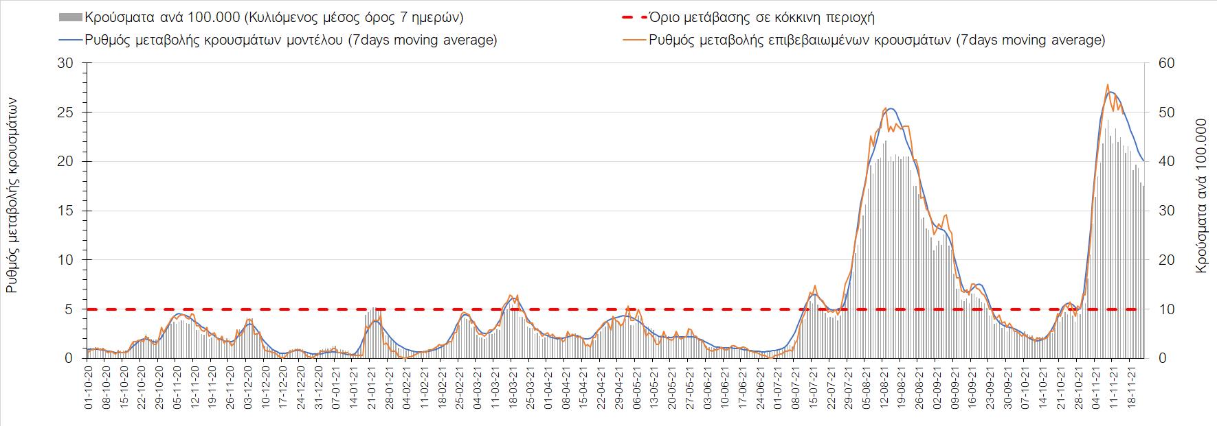 Η πορεία της μέσης εβδομαδιαίας τιμής των κρουσμάτων, καθώς και του κυλιόμενου μέσου όρου 7 ημερών του αριθμού των κρουσμάτων ανά 100.000 πληθυσμού, όπως έχουν καταγραφεί από τον ΕΟΔΥ και η αναμενόμενη πορεία τους όπως προδιαγράφεται από την υπολογιστική πλατφόρμα CORE για την Ελληνική επικράτεια μέχρι τις 30 Νοεμβρίου, αποτυπώνονται στο Σχήμα 4. Αυτή η προβλεπόμενη πορεία, που αφορά τα κρούσματα, τους νοσηλευόμενους σε απλές κλίνες, όσο και σε ΜΕΘ, καθώς επίσης και τους θανάτους, βασίζεται στις ακόλουθες παραδοχές: