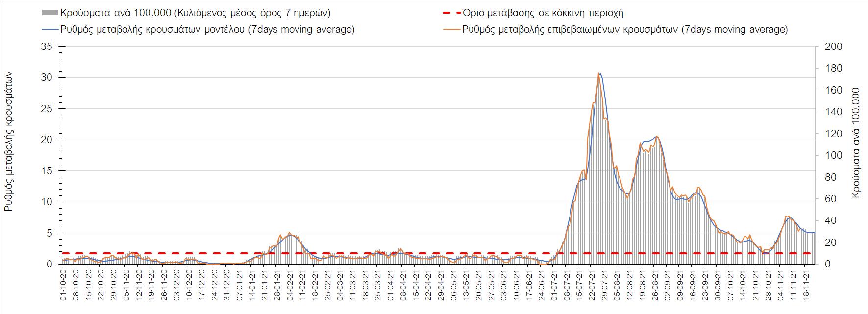 Συνολικά η επιβράδυνση της ανοδικής τάση των τελευταίων ημερών αντικατοπτρίζεται και από τον ημερήσιο αριθμό των κρουσμάτων (κυλιόμενος μέσος όρος 7 ημερών), ο οποίος έπεσε κάτω από τα 6700 (6622). Αυτή την εβδομάδα ο ρυθμός ανόδου μειώθηκε σε σχέση με την προηγούμενη, και παρατηρείται ήπια αναστροφή της ανοδικής πορείας (που αναμέναμε να συμβεί μετά τα μέσα Οκτώβρη).