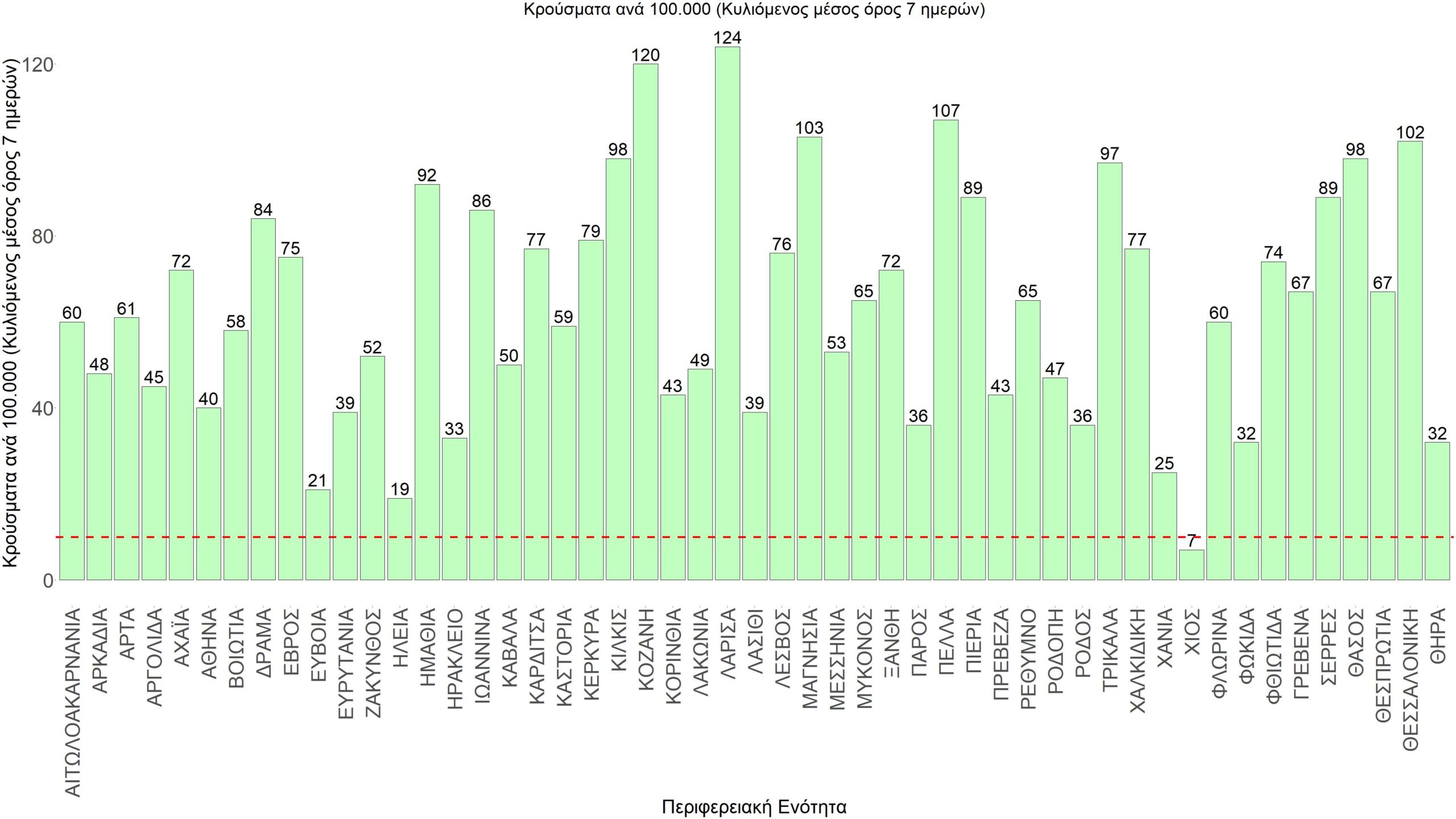 Σχήμα 60. Συγκεντρωτική εικόνα των νέων κρουσμάτων ανά 100.000 κατοίκους (κυλιόμενος μέσος όρος 7 ημερών) των επιμέρους περιοχών