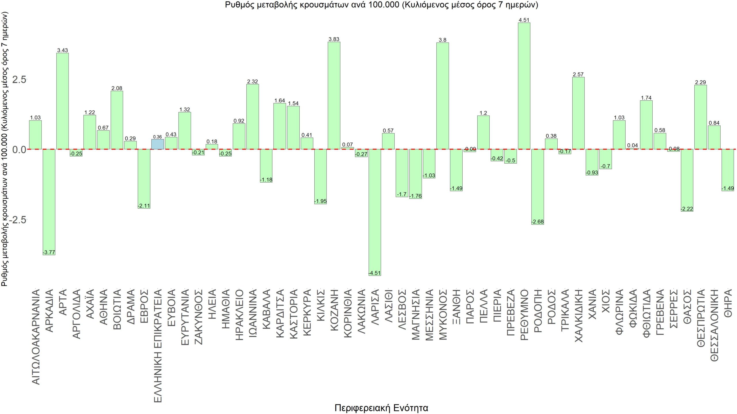 Η αποτύπωση των τάσεων στις επιμέρους περιοχές, παρουσιάζεται στο Σχήμα 61, όπου παρουσιάζεται ο ρυθμός μεταβολής των νέων κρουσμάτων ανά 100.000 κατοίκους (κυλιόμενος μέσος όρος 7 ημερών) των επιμέρους περιοχών. Θετικές τιμές του ρυθμού μεταβολής υποδηλώνουν άνοδο, ενώ αρνητικές τιμές υποδηλώνουν πτωτική πορεία. Το σχήμα αυτό είναι ιδιαίτερα κατατοπιστικό, γιατί οι τιμές που παρουσιάζονται είναι κανονικοποιημένες ως προς τον πληθυσμό, και η σύγκριση των τάσεων ανάμεσα στις επιμέρους περιοχές είναι άμεση. Πλέον αρκετές περιοχές παρουσιάζουν επιβράδυνση (Φωκίδα, Αρκαδία, Έβρος, Κιλκίς, Λάρισα, Μαγνησία, Μεσσηνία, Ροδόπη, Χανιά, Λέσβος, Χίος, Θάσος και Σαντορίνη