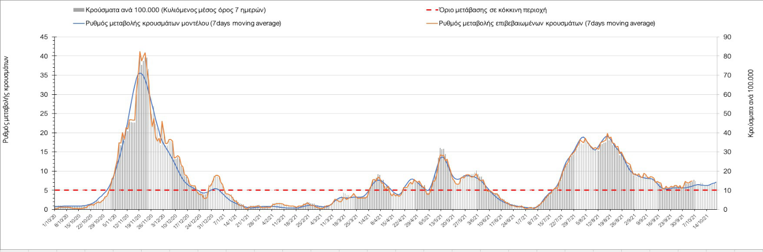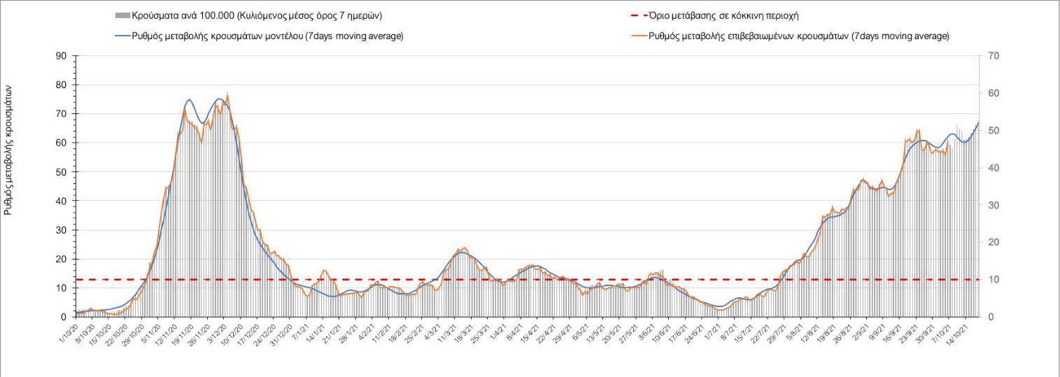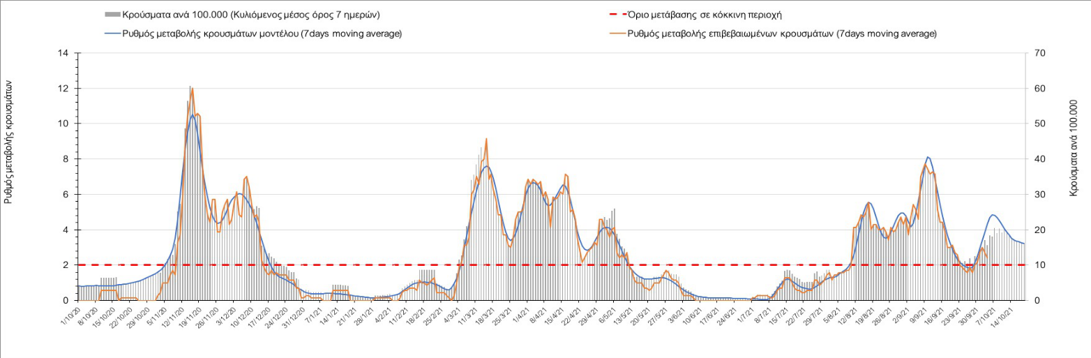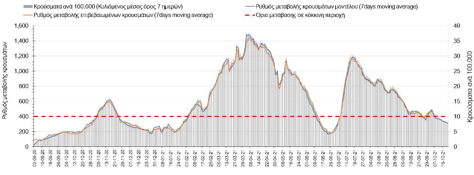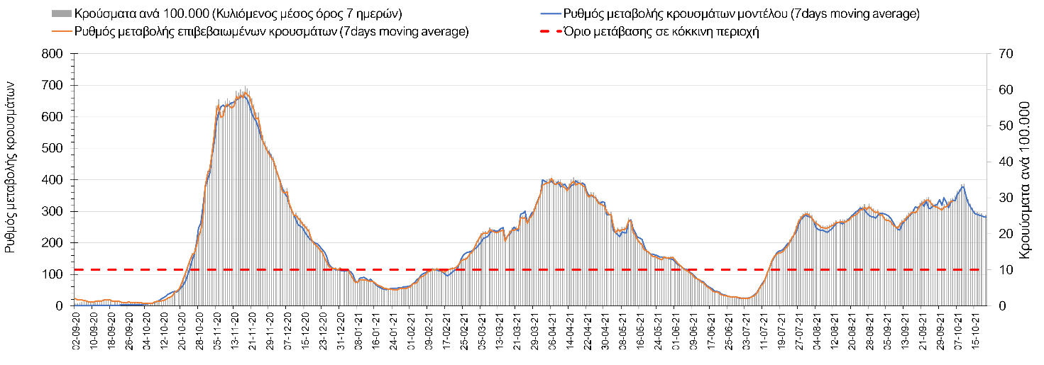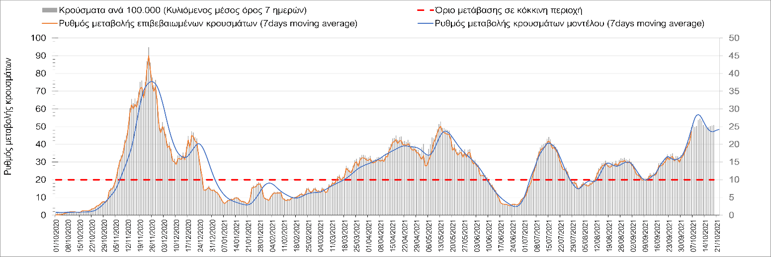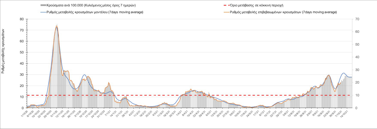 Σε πανελλαδικό επίπεδο ο κυλιόμενος εβδομαδιαίος μέσος όρος του δείκτη θετικότητας διαμορφώθηκε στο 1,4% (η ημερήσια τιμή είναι 1,2 %) ενώ ο κυλιόμενος εβδομαδιαίος μέσος όρος του πραγματικού αριθμού αναπαραγωγής Rt (δηλαδή ο αριθμός των ατόμων που ένας φορέας μπορεί να επιμολύνει) αυξήθηκε ελαφρά στο 1,02 (Rt πάνω από τη μονάδα υποδηλώνει καθαρή αύξηση της διασποράς του ιού στην κοινότητα).