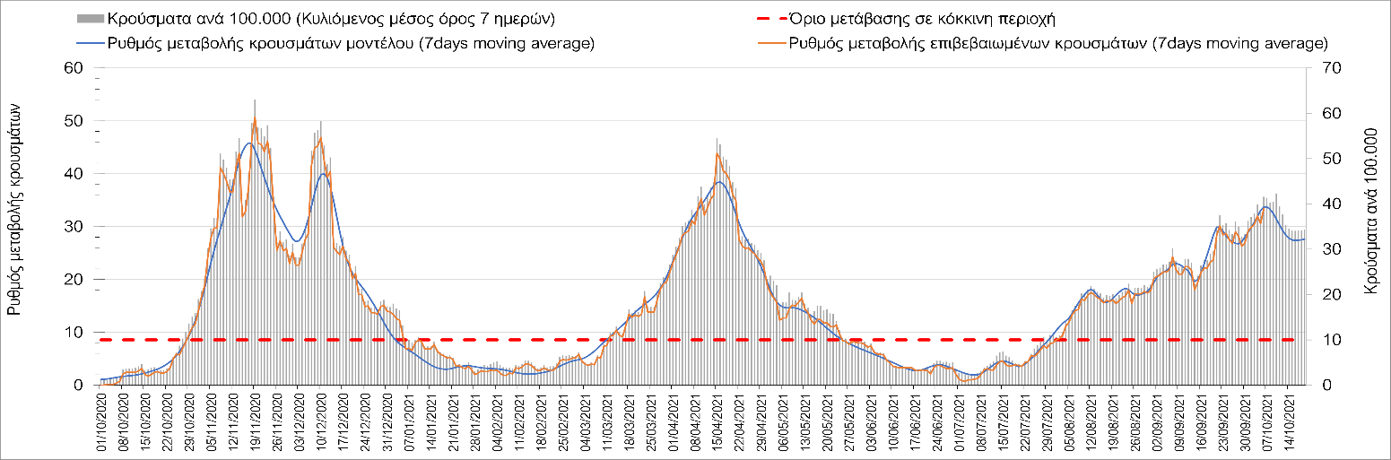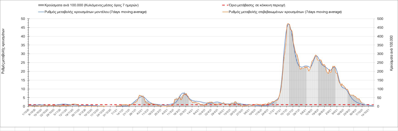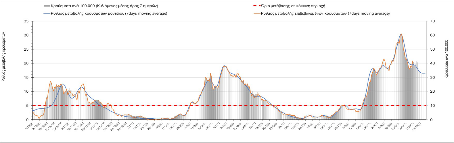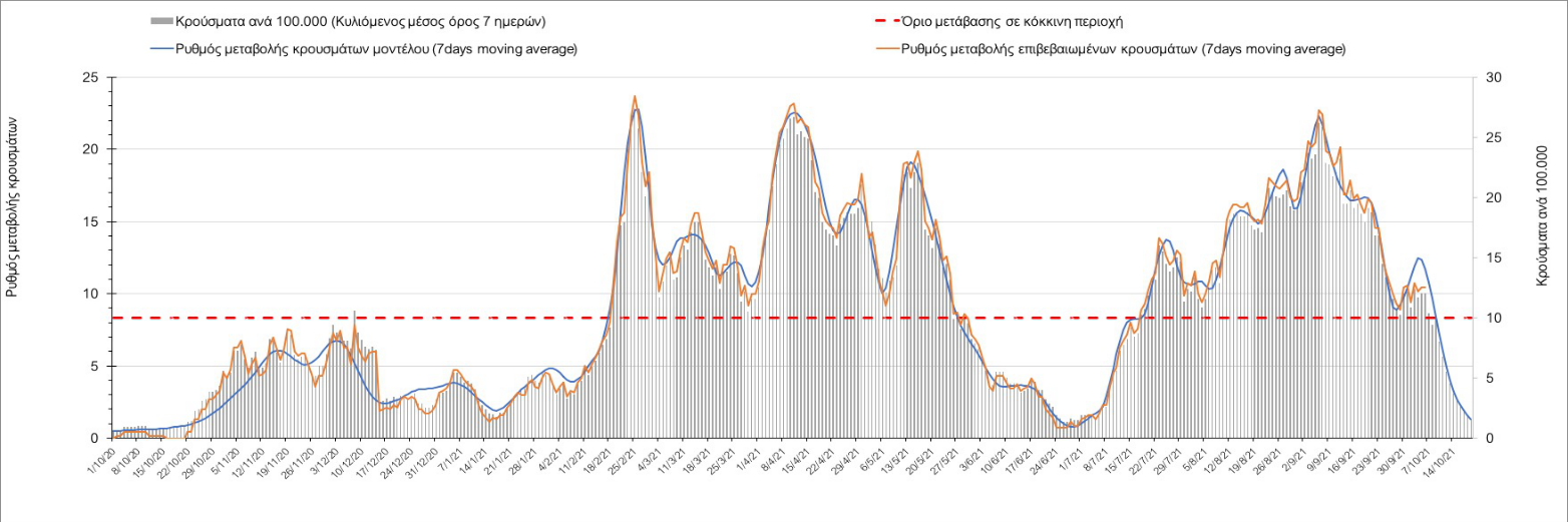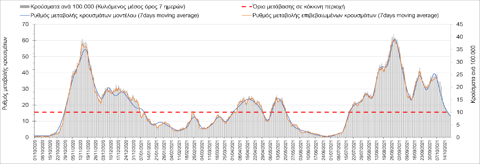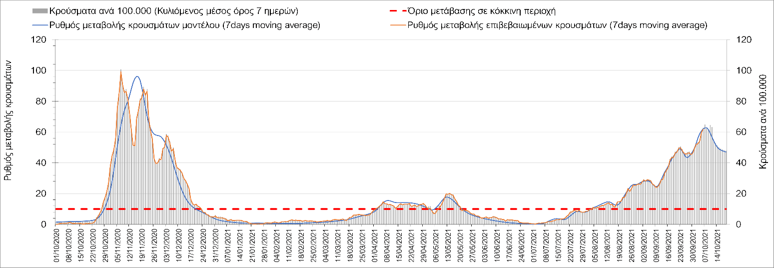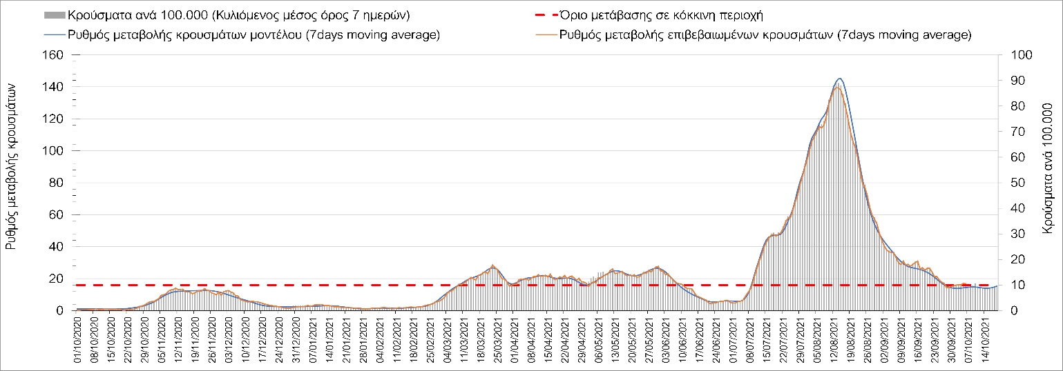 Σε πανελλαδικό επίπεδο ο κυλιόμενος εβδομαδιαίος μέσος όρος του δείκτη θετικότητας διαμορφώθηκε στο 1,4% (η ημερήσια τιμή είναι 1,2 %) ενώ ο κυλιόμενος εβδομαδιαίος μέσος όρος του πραγματικού αριθμού αναπαραγωγής Rt (δηλαδή ο αριθμός των ατόμων που ένας φορέας μπορεί να επιμολύνει) αυξήθηκε ελαφρά στο 1,02 (Rt πάνω από τη μονάδα υποδηλώνει καθαρή αύξηση της διασποράς του ιού στην κοινότητα).