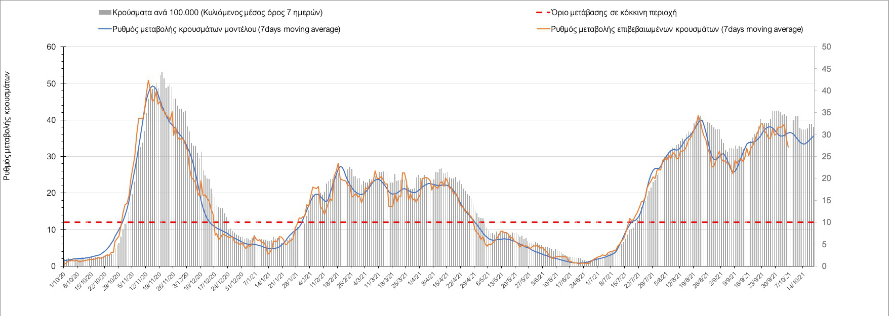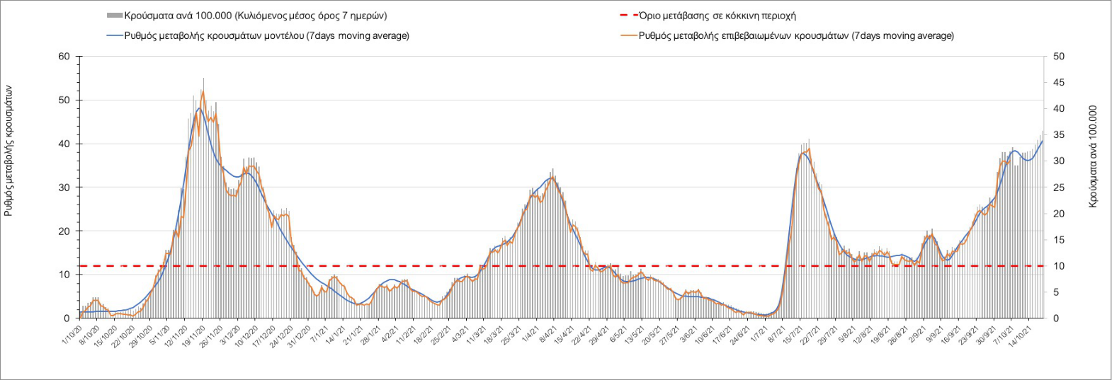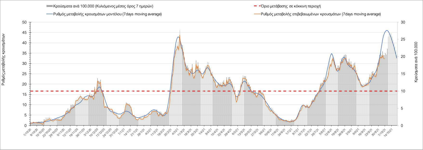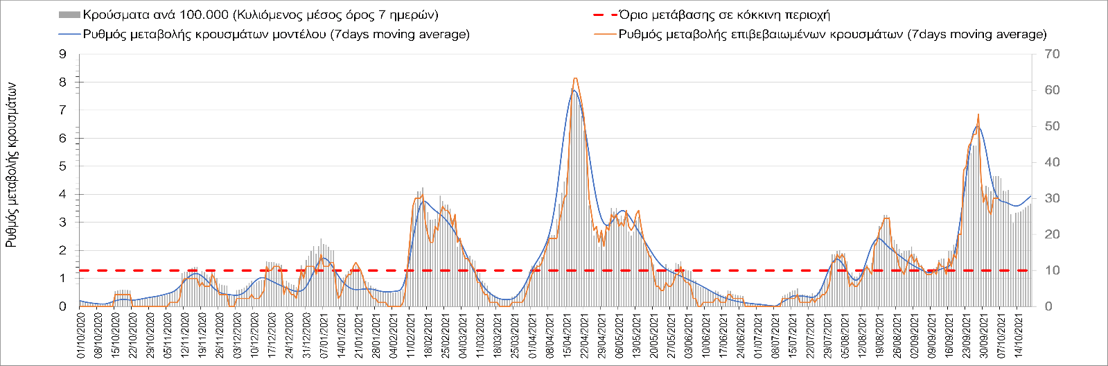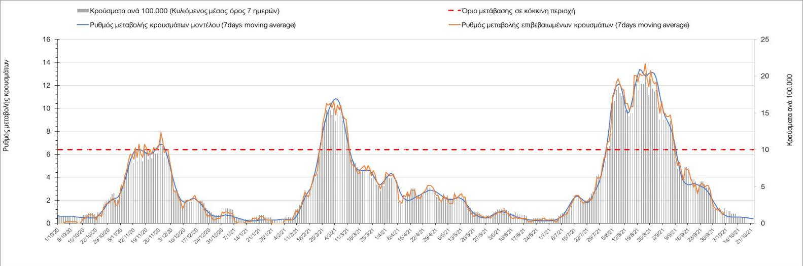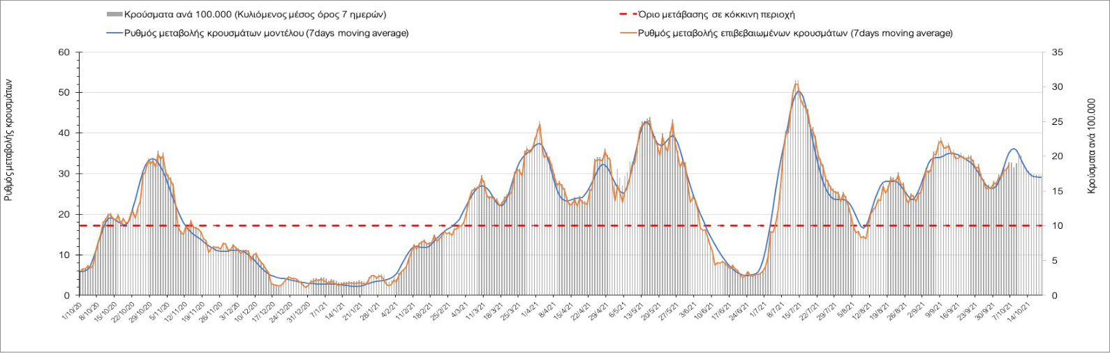 Σε πανελλαδικό επίπεδο ο κυλιόμενος εβδομαδιαίος μέσος όρος του δείκτη θετικότητας διαμορφώθηκε στο 1,4% (η ημερήσια τιμή είναι 1,2 %) ενώ ο κυλιόμενος εβδομαδιαίος μέσος όρος του πραγματικού αριθμού αναπαραγωγής Rt (δηλαδή ο αριθμός των ατόμων που ένας φορέας μπορεί να επιμολύνει) αυξήθηκε ελαφρά στο 1,02 (Rt πάνω από τη μονάδα υποδηλώνει καθαρή αύξηση της διασποράς του ιού στην κοινότητα).