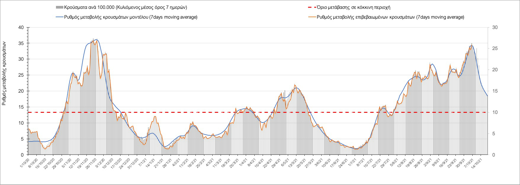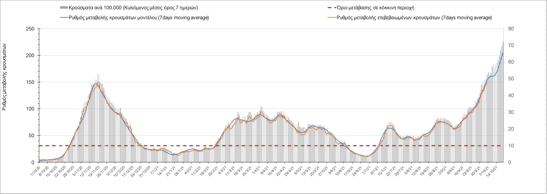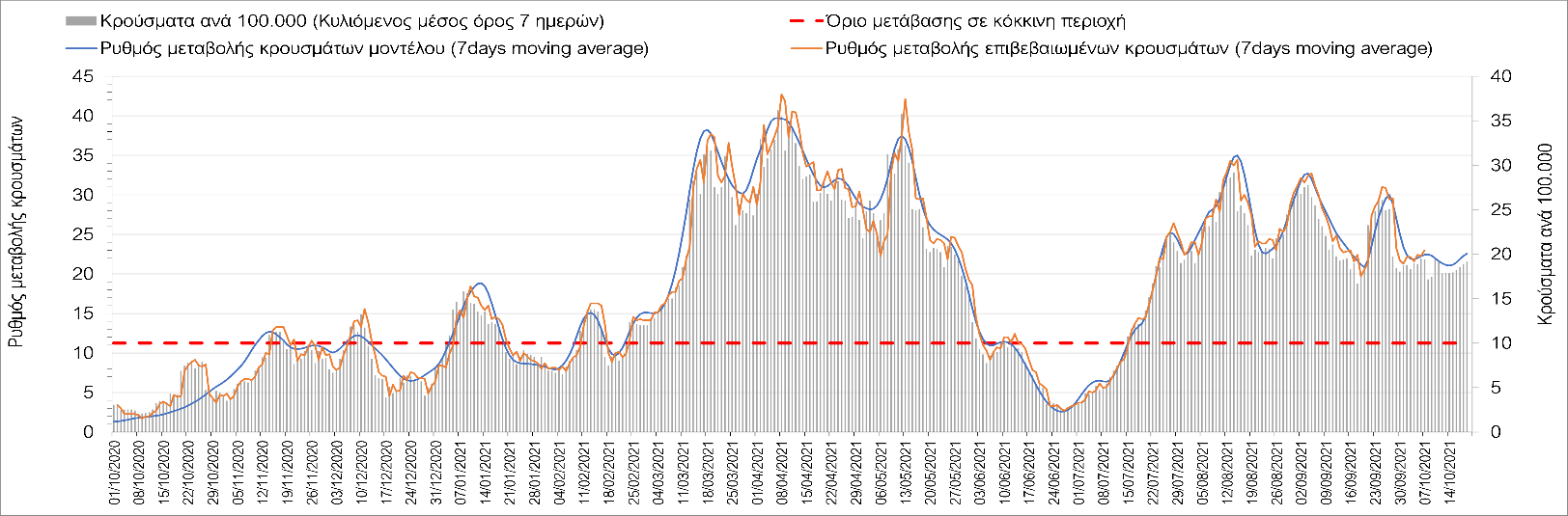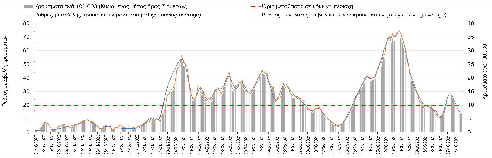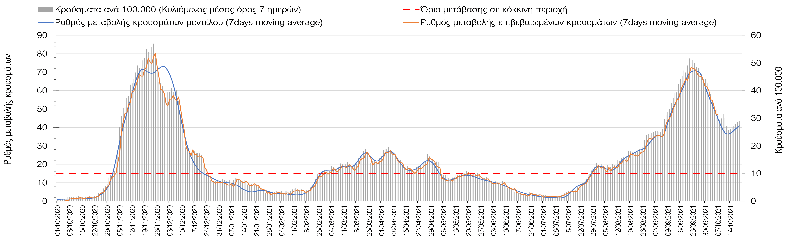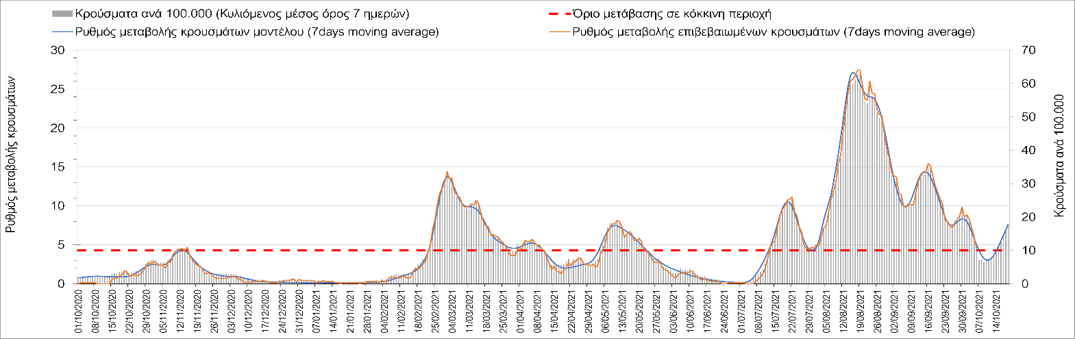 Η πορεία της μέσης εβδομαδιαίας τιμής των κρουσμάτων, καθώς και του κυλιόμενου μέσου όρου 7 ημερών του αριθμού των κρουσμάτων ανά 100.000 πληθυσμού, όπως έχουν καταγραφεί από τον ΕΟΔΥ και η αναμενόμενη πορεία τους όπως προδιαγράφεται από την υπολογιστική πλατφόρμα CORE για την Ελληνική επικράτεια μέχρι τις 20 Οκτωβρίου, αποτυπώνονται στο Σχήμα 4.