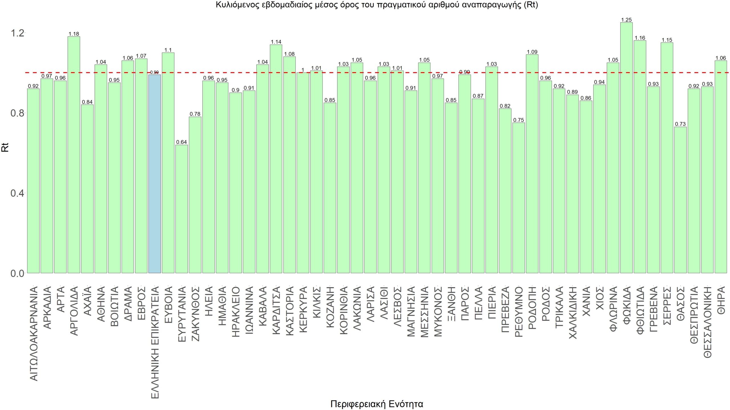 O πραγματικός αριθμός αναπαραγωγής Rt ανά περιφερειακή ενότητα της χώρας παρουσιάζεται στο Σχήμα 58.