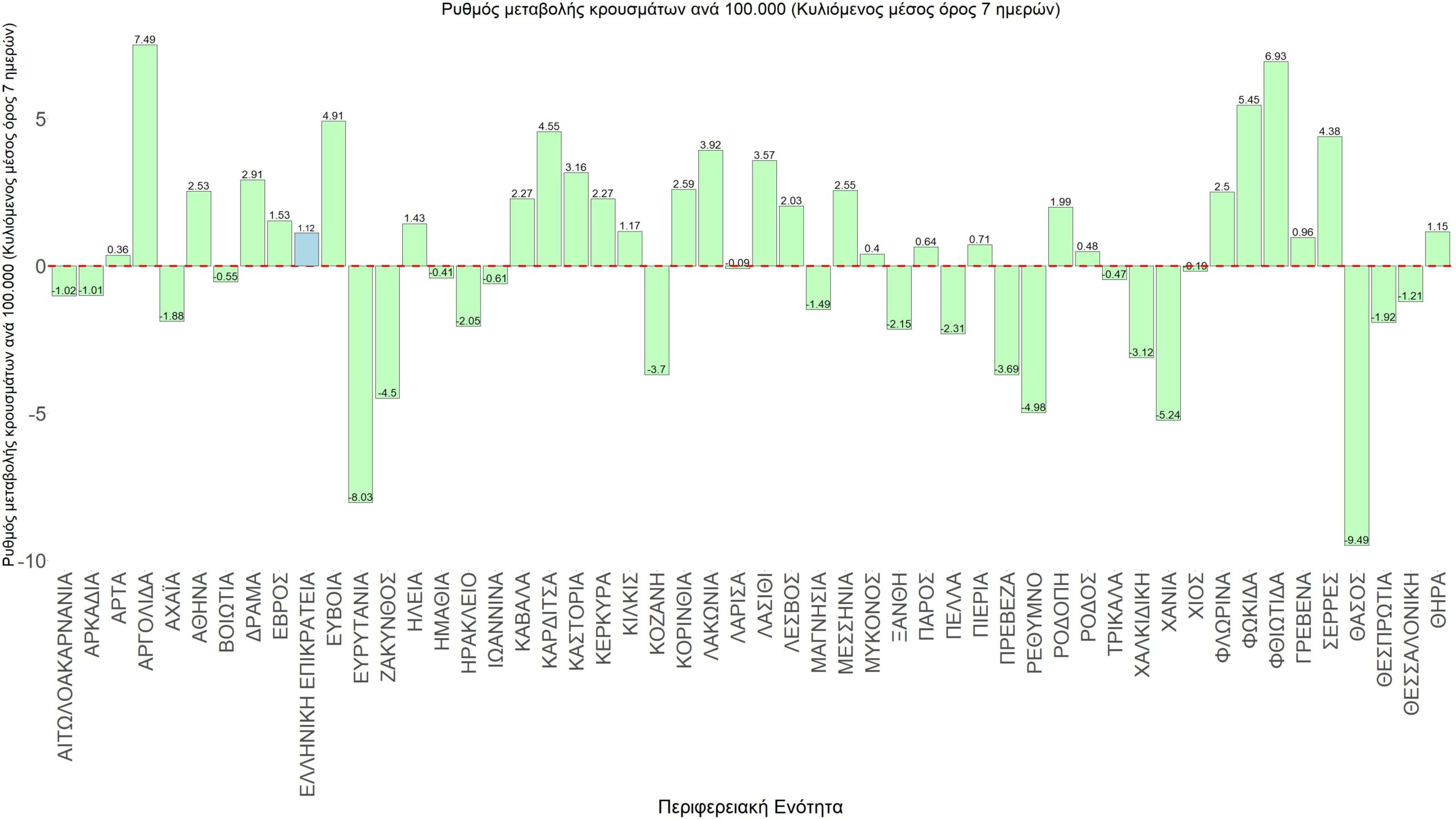 Η αποτύπωση των τάσεων στις επιμέρους περιοχές, παρουσιάζεται στο Σχήμα 61, όπου παρουσιάζεται ο ρυθμός μεταβολής των νέων κρουσμάτων ανά 100.000 κατοίκους (κυλιόμενος μέσος όρος 7 ημερών) των επιμέρους περιοχών. Θετικές τιμές του ρυθμού μεταβολής υποδηλώνουν άνοδο, ενώ αρνητικές τιμές υποδηλώνουν πτωτική πορεία.