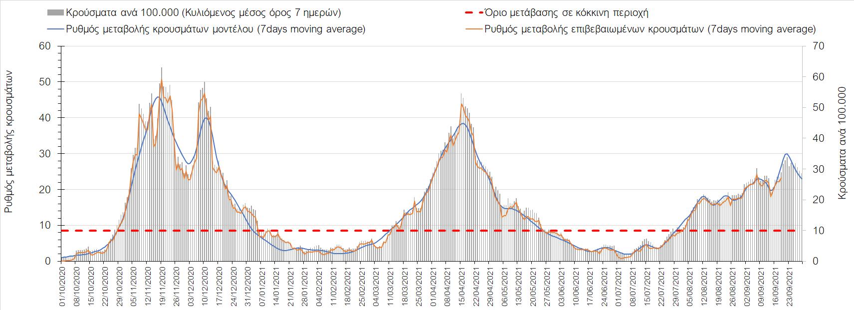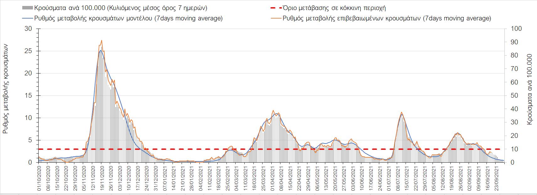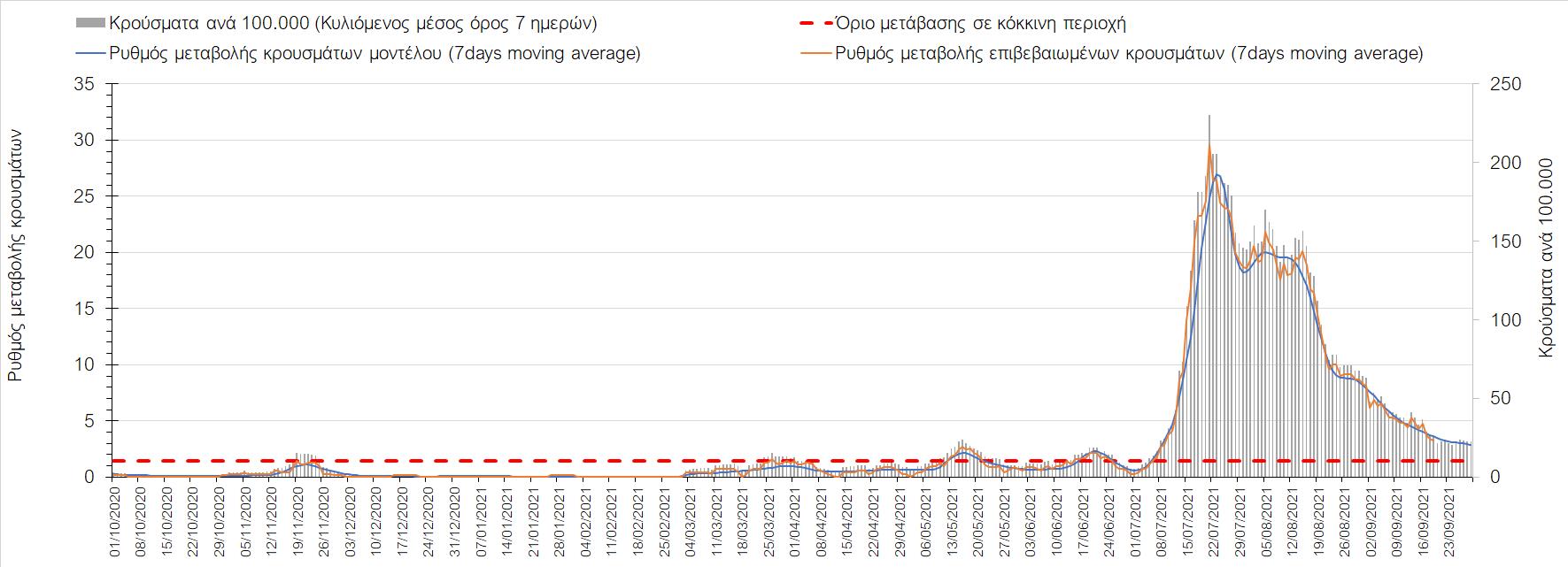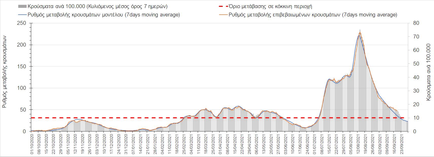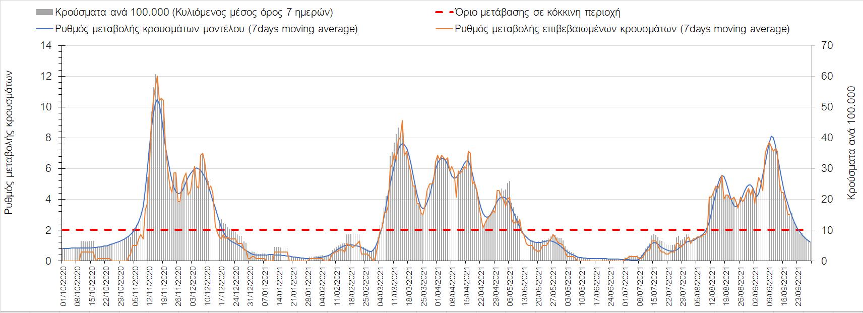 Σε πανελλαδικό επίπεδο ο κυλιόμενος εβδομαδιαίος μέσος όρος του δείκτη θετικότητας διαμορφώθηκε στο 1,3% (η ημερήσια τιμή είναι 0,8%) ενώ ο κυλιόμενος εβδομαδιαίος μέσος όρος του πραγματικού αριθμού αναπαραγωγής Rt (δηλαδή ο αριθμός των ατόμων που ένας φορέας μπορεί να επιμολύνει) αυξήθηκε ελαφρά και διαμορφώθηκε στο 0,99 (Rt κάτω από τη μονάδα υποδηλώνει μείωση της διασποράς του ιού στην κοινότητα).