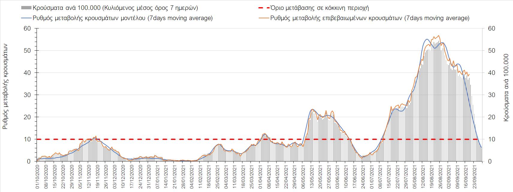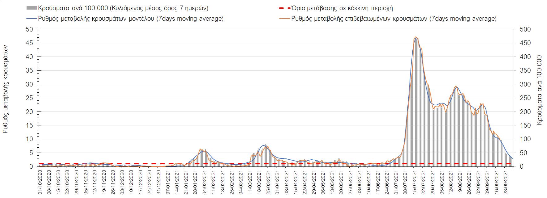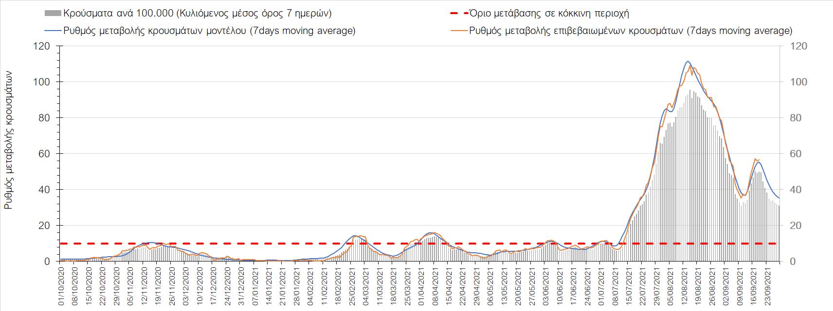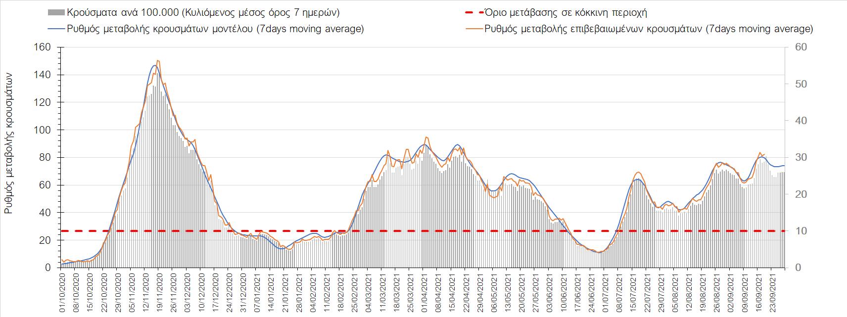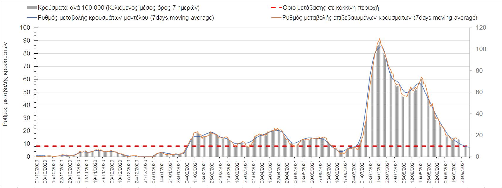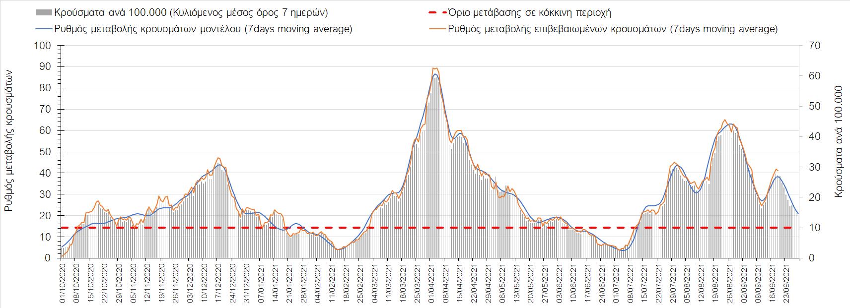 Σε πανελλαδικό επίπεδο ο κυλιόμενος εβδομαδιαίος μέσος όρος του δείκτη θετικότητας διαμορφώθηκε στο 1,3% (η ημερήσια τιμή είναι 0,8%) ενώ ο κυλιόμενος εβδομαδιαίος μέσος όρος του πραγματικού αριθμού αναπαραγωγής Rt (δηλαδή ο αριθμός των ατόμων που ένας φορέας μπορεί να επιμολύνει) αυξήθηκε ελαφρά και διαμορφώθηκε στο 0,99 (Rt κάτω από τη μονάδα υποδηλώνει μείωση της διασποράς του ιού στην κοινότητα).
