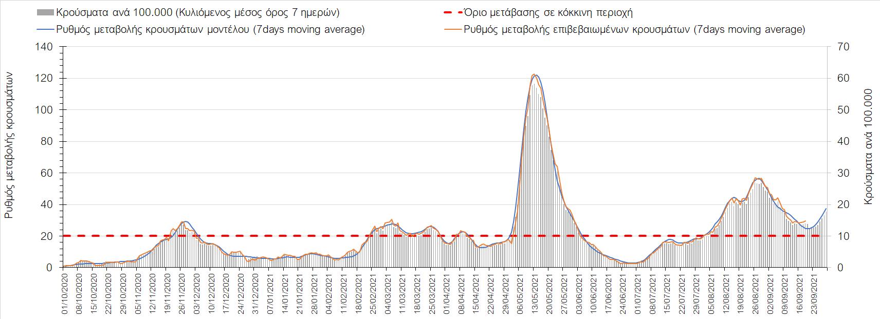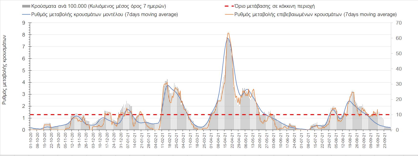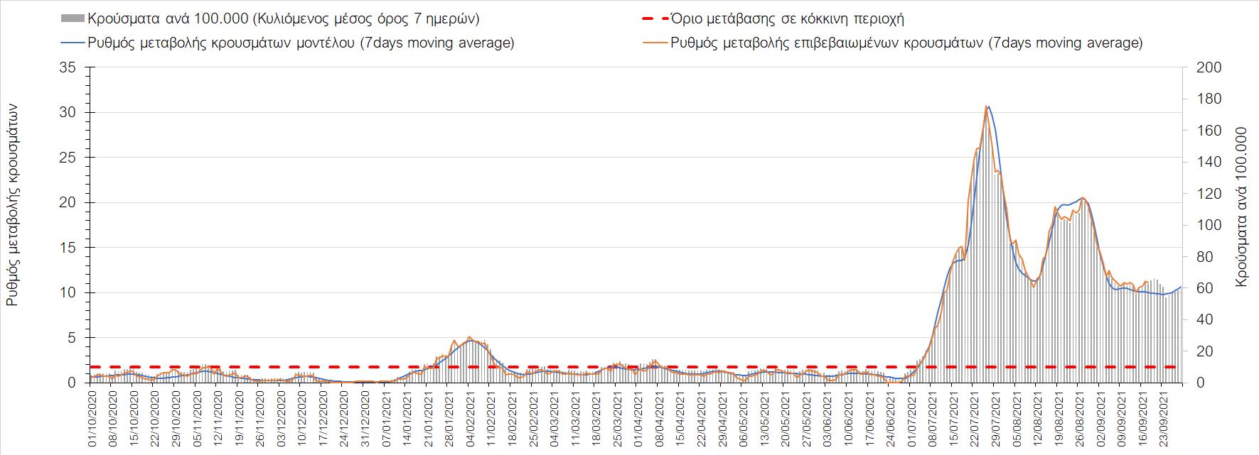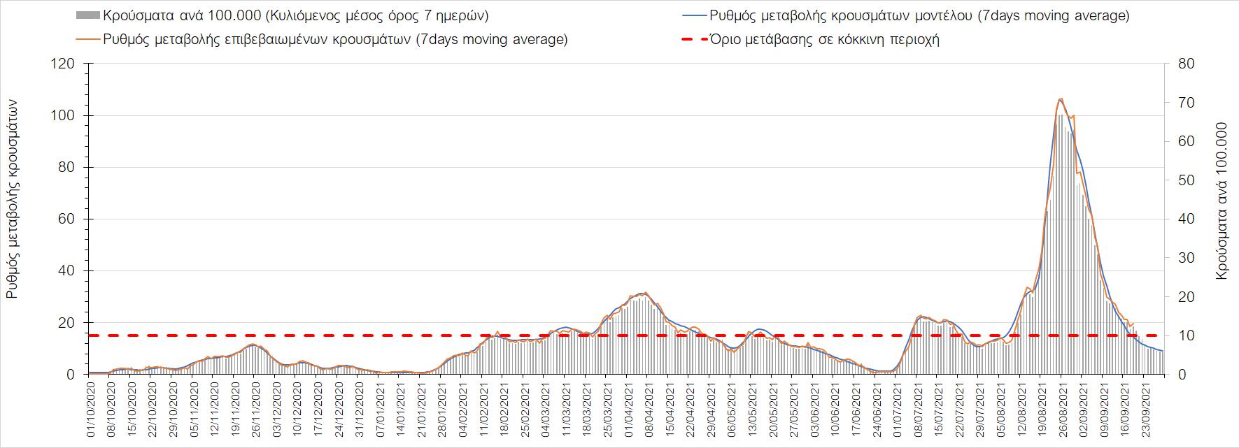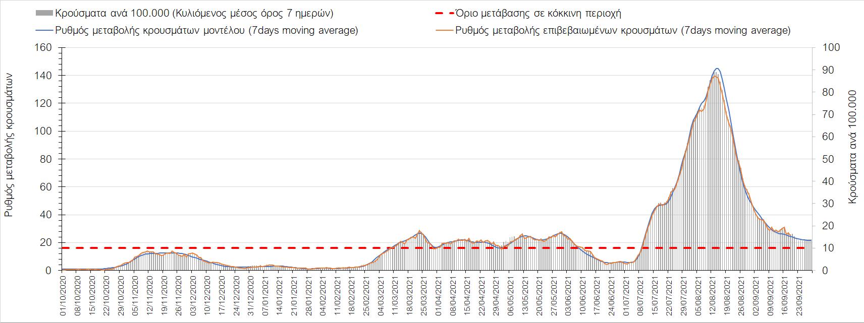 Σε πανελλαδικό επίπεδο ο κυλιόμενος εβδομαδιαίος μέσος όρος του δείκτη θετικότητας διαμορφώθηκε στο 1,3% (η ημερήσια τιμή είναι 0,8%) ενώ ο κυλιόμενος εβδομαδιαίος μέσος όρος του πραγματικού αριθμού αναπαραγωγής Rt (δηλαδή ο αριθμός των ατόμων που ένας φορέας μπορεί να επιμολύνει) αυξήθηκε ελαφρά και διαμορφώθηκε στο 0,99 (Rt κάτω από τη μονάδα υποδηλώνει μείωση της διασποράς του ιού στην κοινότητα).