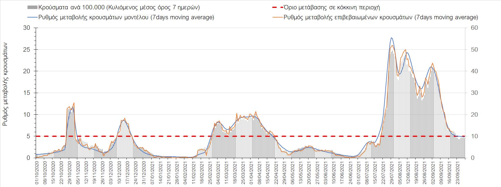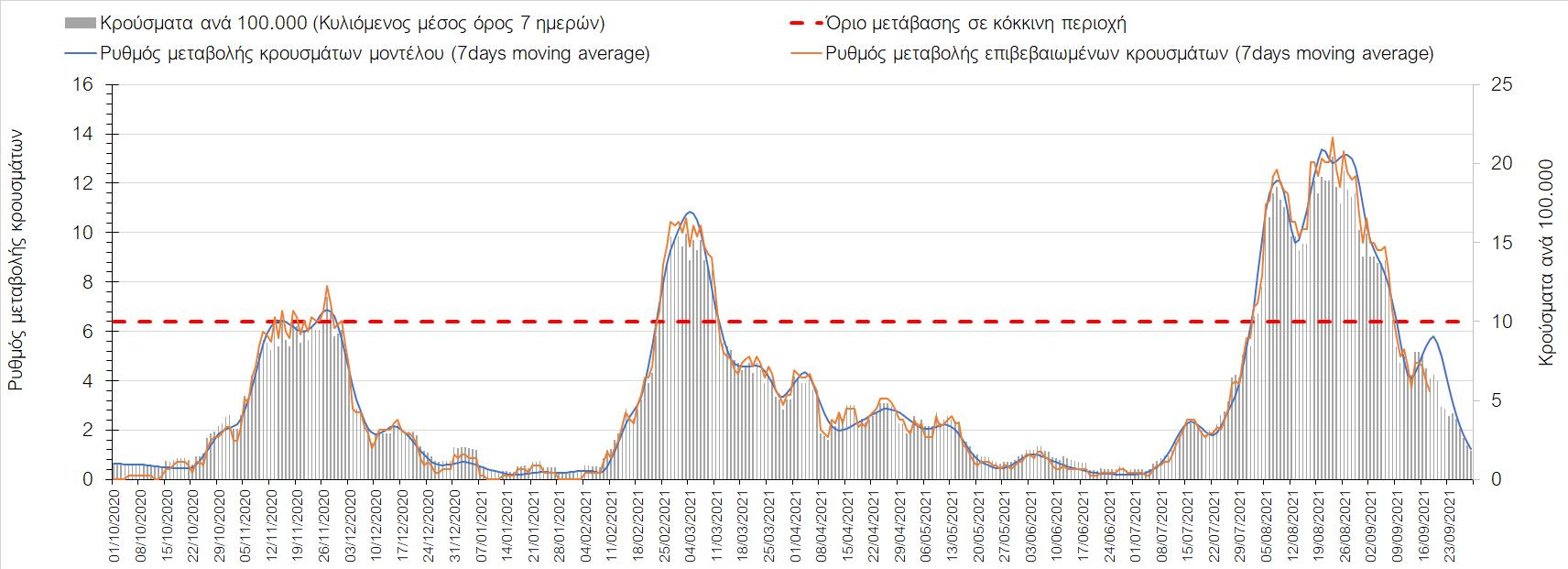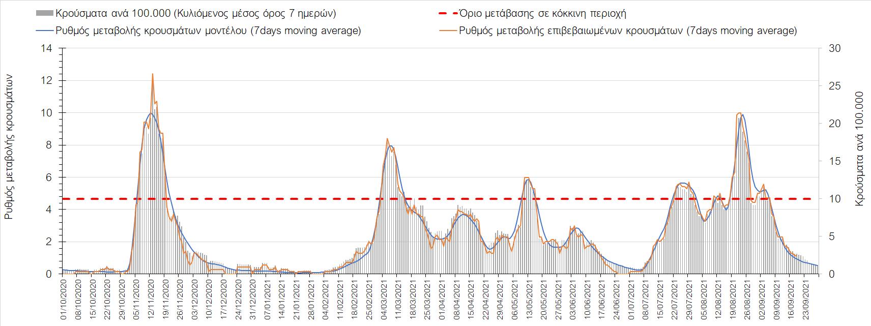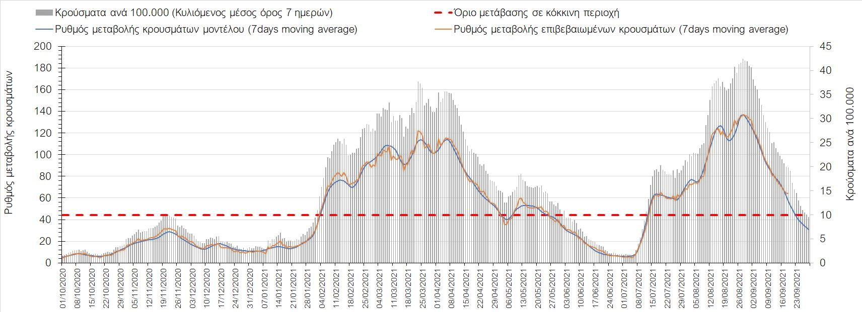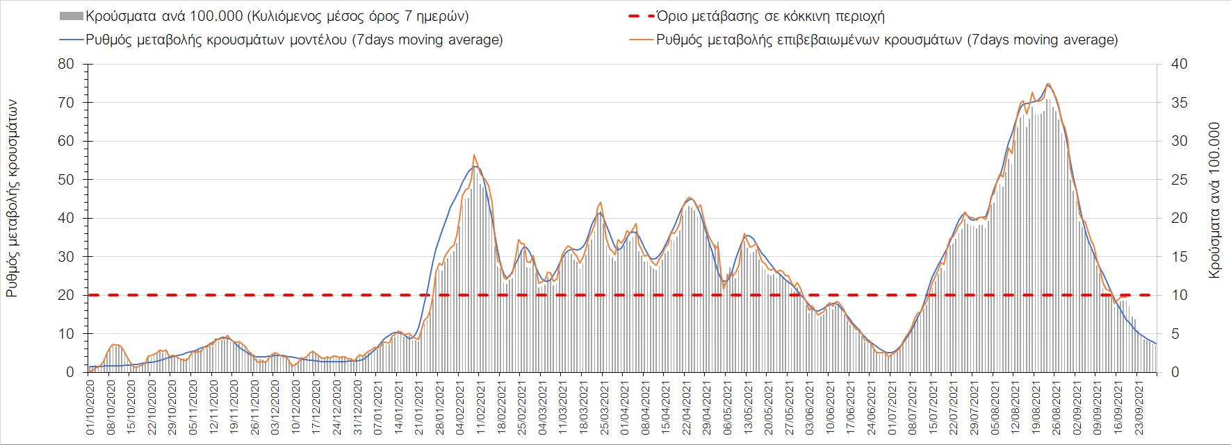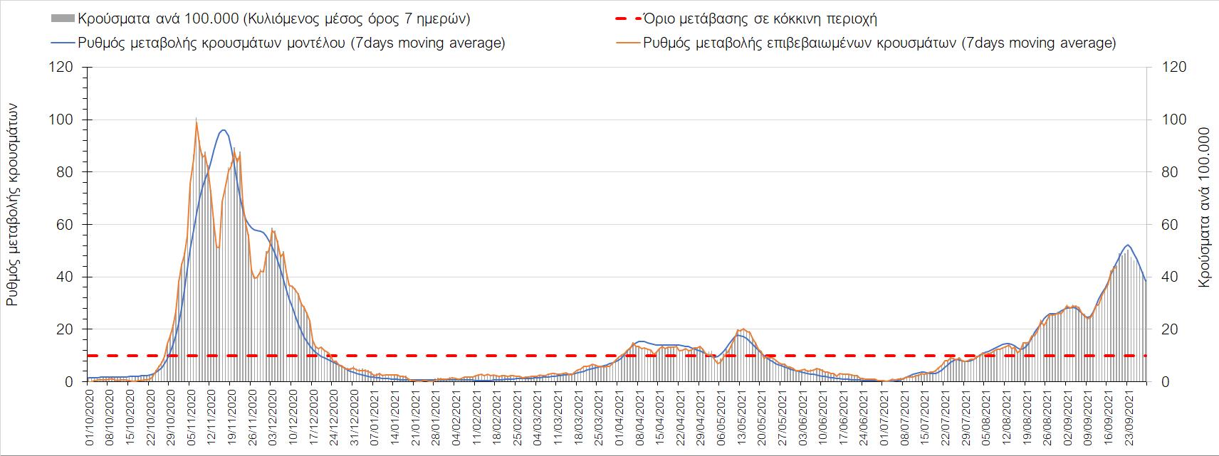 Σε πανελλαδικό επίπεδο ο κυλιόμενος εβδομαδιαίος μέσος όρος του δείκτη θετικότητας διαμορφώθηκε στο 1,3% (η ημερήσια τιμή είναι 0,8%) ενώ ο κυλιόμενος εβδομαδιαίος μέσος όρος του πραγματικού αριθμού αναπαραγωγής Rt (δηλαδή ο αριθμός των ατόμων που ένας φορέας μπορεί να επιμολύνει) αυξήθηκε ελαφρά και διαμορφώθηκε στο 0,99 (Rt κάτω από τη μονάδα υποδηλώνει μείωση της διασποράς του ιού στην κοινότητα).