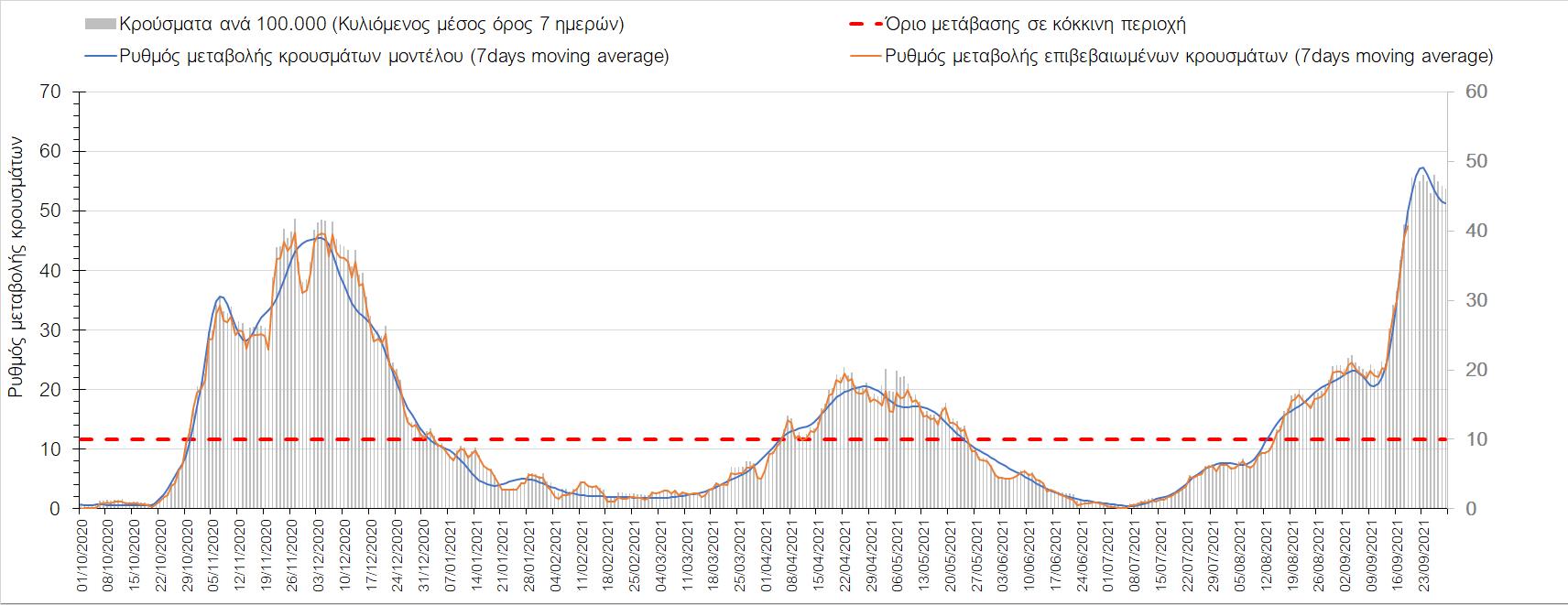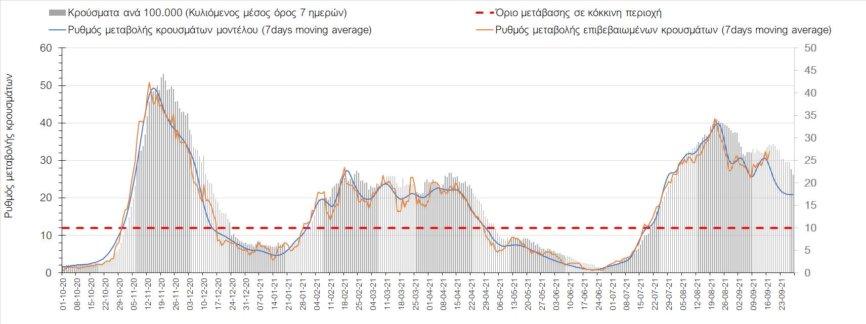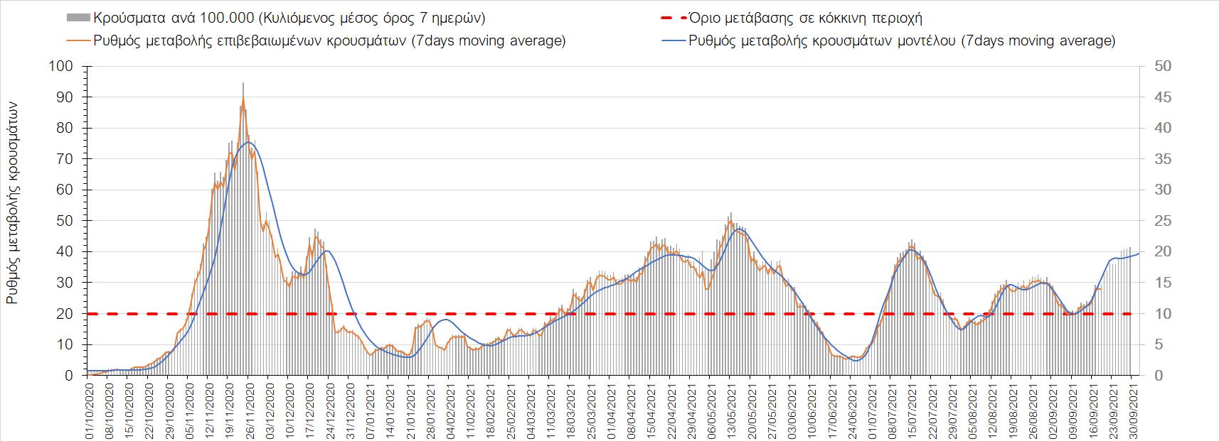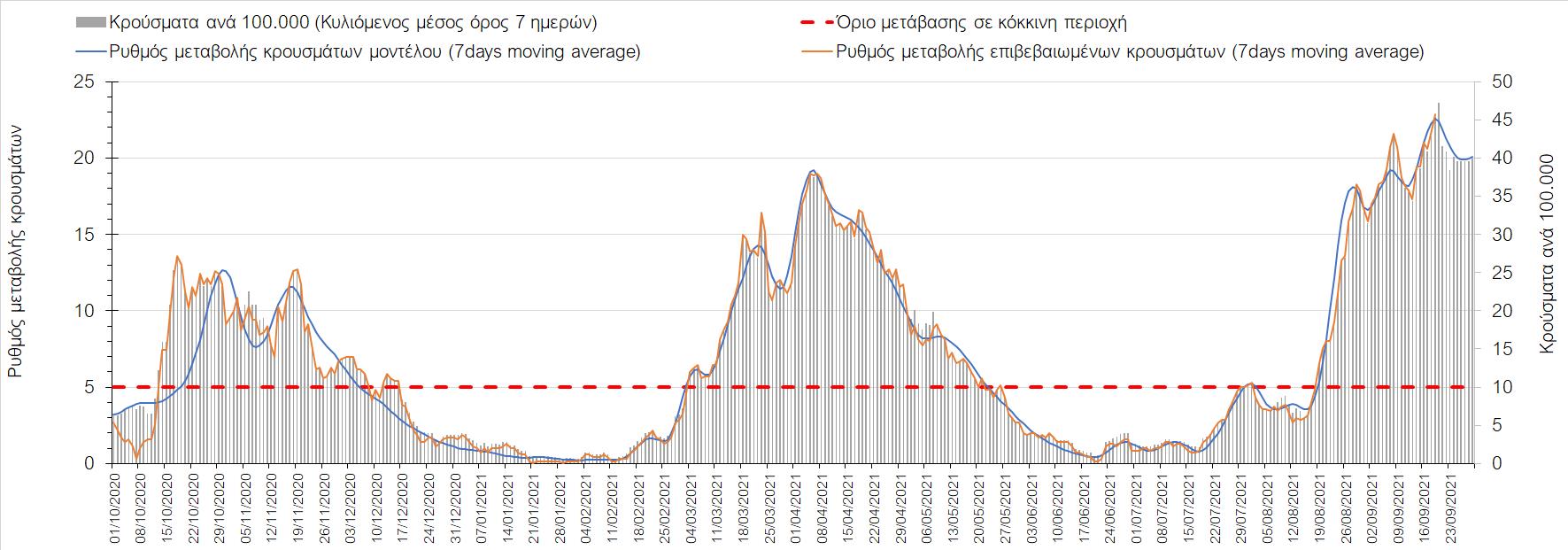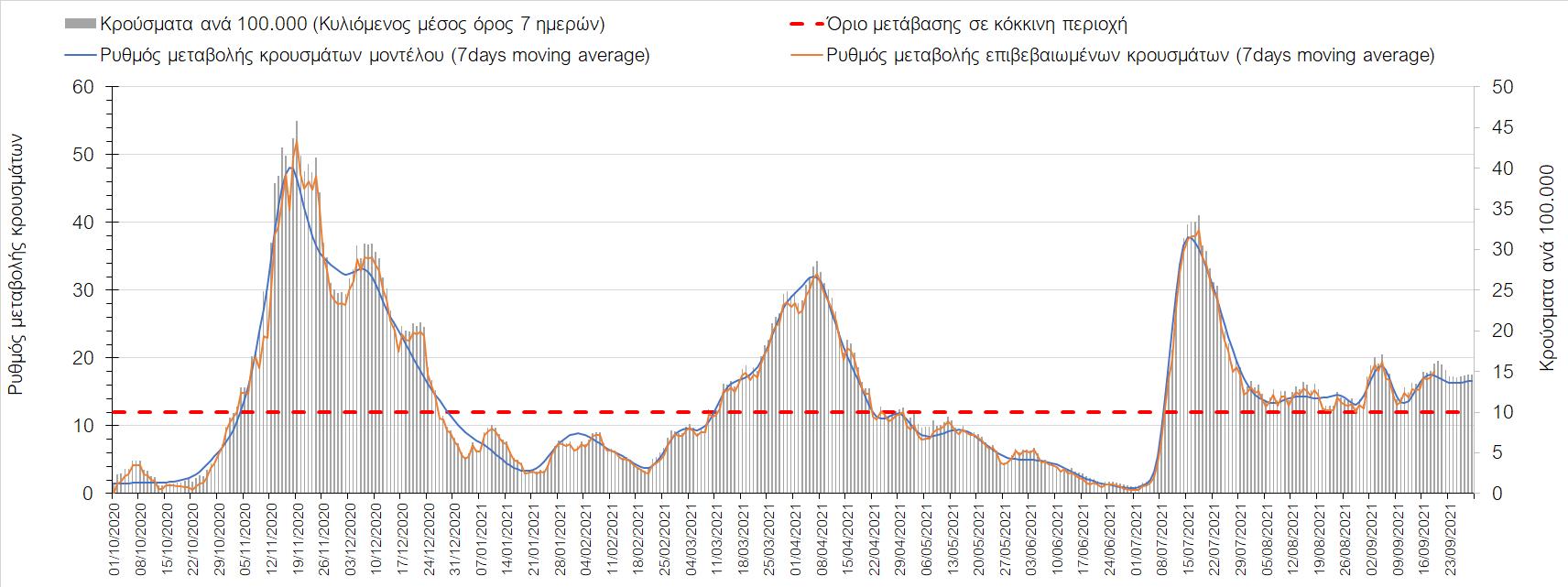 Σε πανελλαδικό επίπεδο ο κυλιόμενος εβδομαδιαίος μέσος όρος του δείκτη θετικότητας διαμορφώθηκε στο 1,3% (η ημερήσια τιμή είναι 0,8%) ενώ ο κυλιόμενος εβδομαδιαίος μέσος όρος του πραγματικού αριθμού αναπαραγωγής Rt (δηλαδή ο αριθμός των ατόμων που ένας φορέας μπορεί να επιμολύνει) αυξήθηκε ελαφρά και διαμορφώθηκε στο 0,99 (Rt κάτω από τη μονάδα υποδηλώνει μείωση της διασποράς του ιού στην κοινότητα).