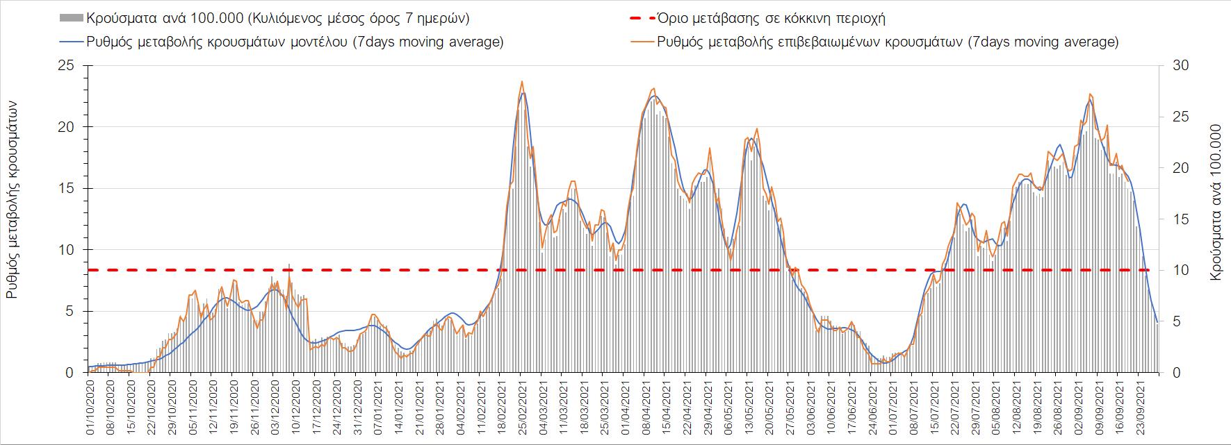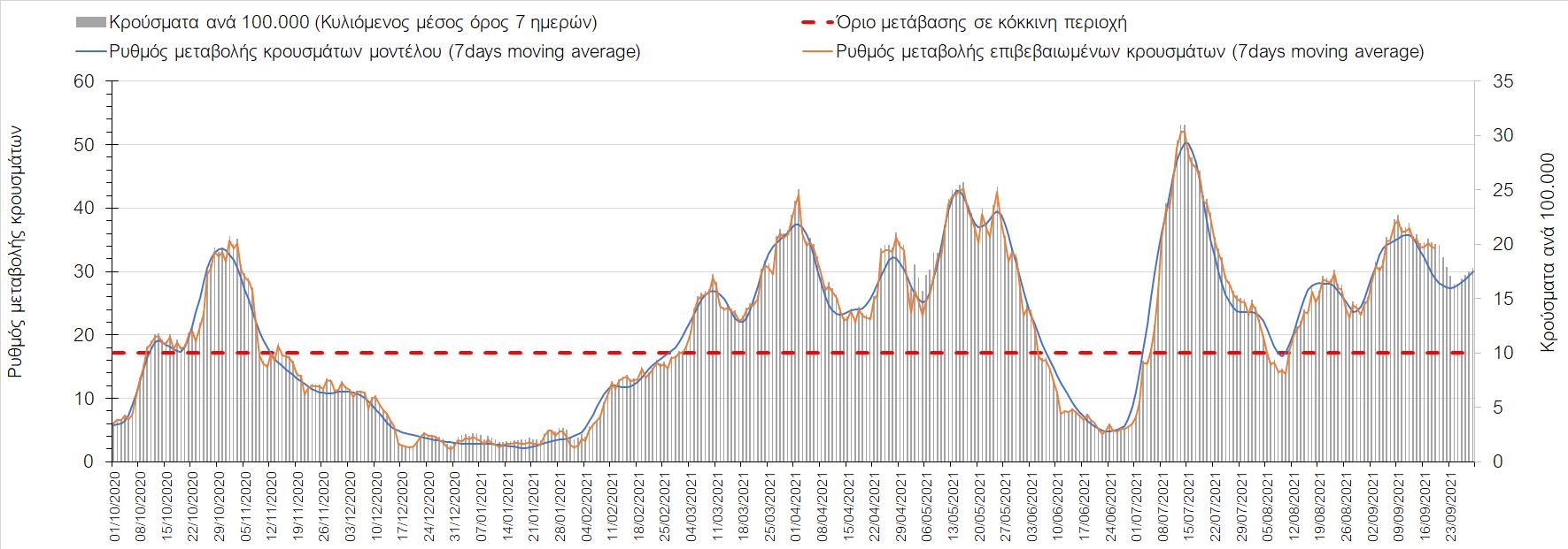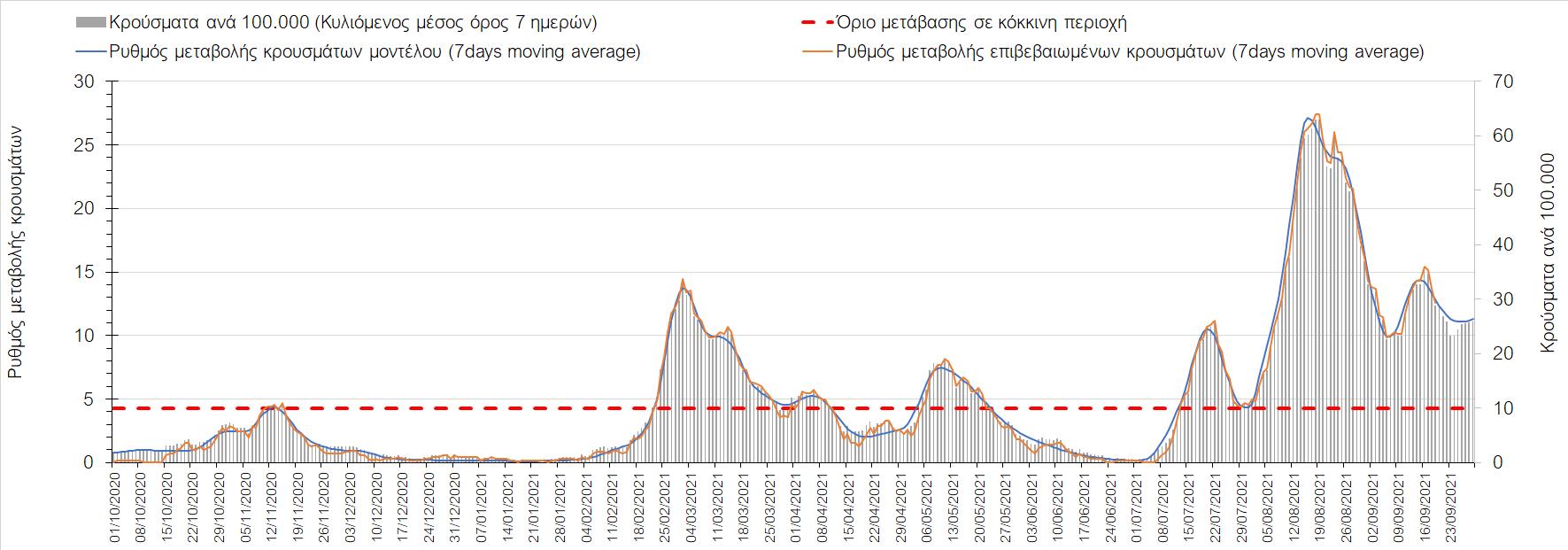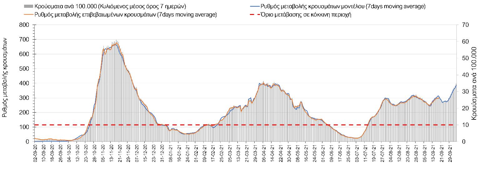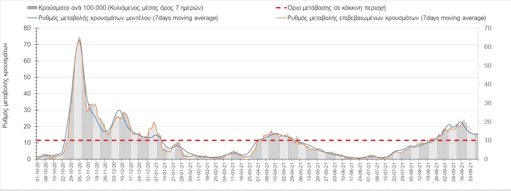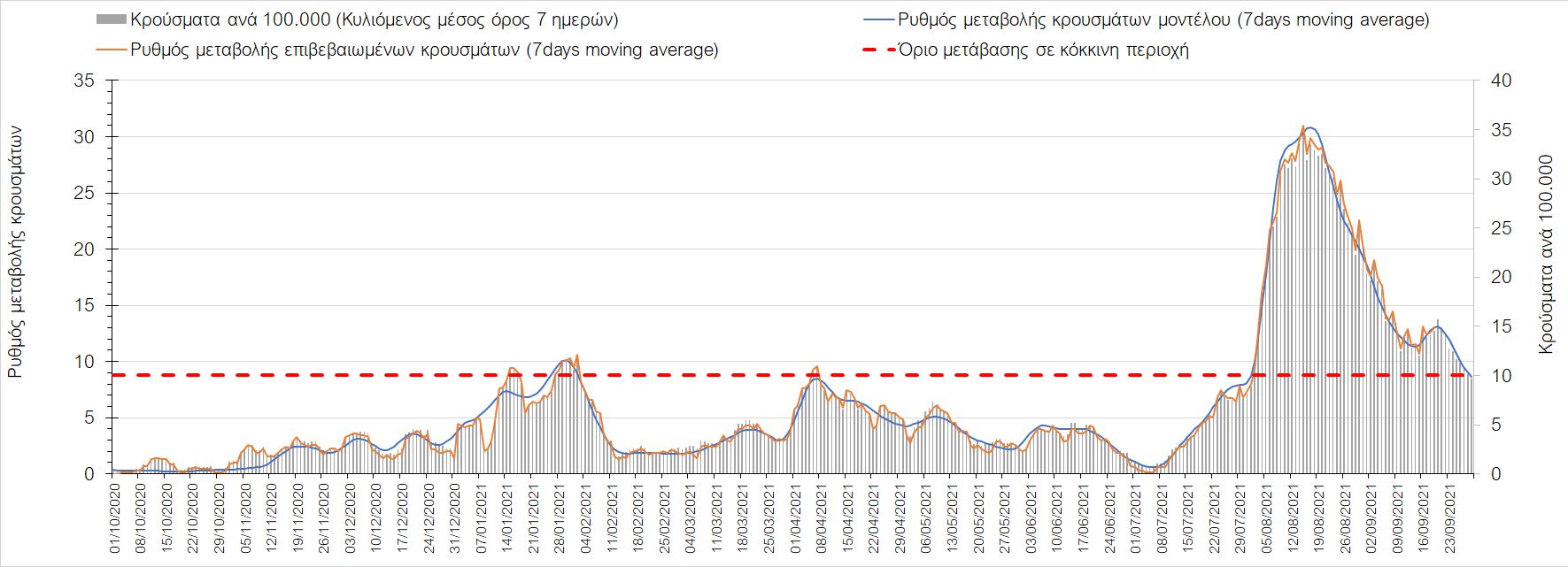 Σε πανελλαδικό επίπεδο ο κυλιόμενος εβδομαδιαίος μέσος όρος του δείκτη θετικότητας διαμορφώθηκε στο 1,3% (η ημερήσια τιμή είναι 0,8%) ενώ ο κυλιόμενος εβδομαδιαίος μέσος όρος του πραγματικού αριθμού αναπαραγωγής Rt (δηλαδή ο αριθμός των ατόμων που ένας φορέας μπορεί να επιμολύνει) αυξήθηκε ελαφρά και διαμορφώθηκε στο 0,99 (Rt κάτω από τη μονάδα υποδηλώνει μείωση της διασποράς του ιού στην κοινότητα).
