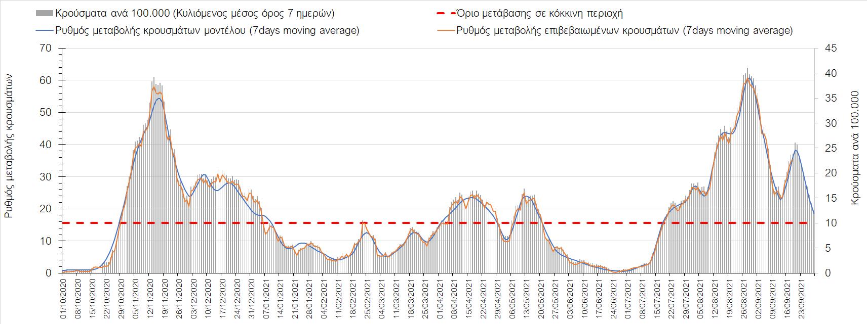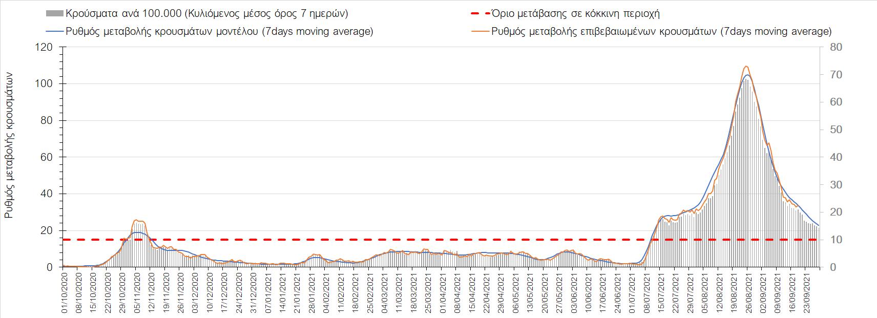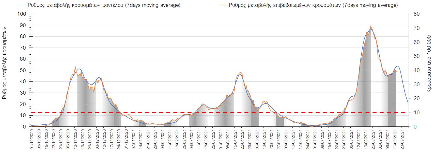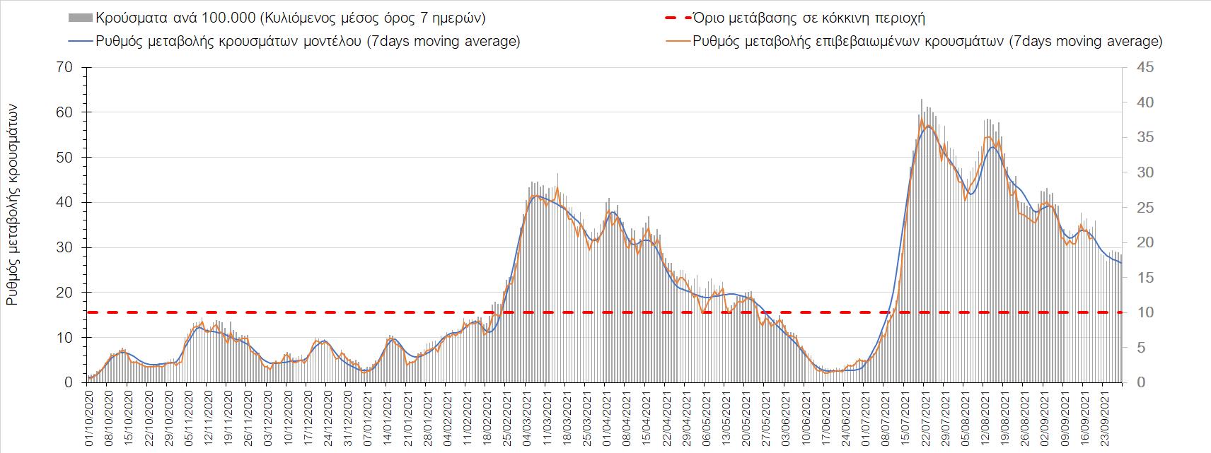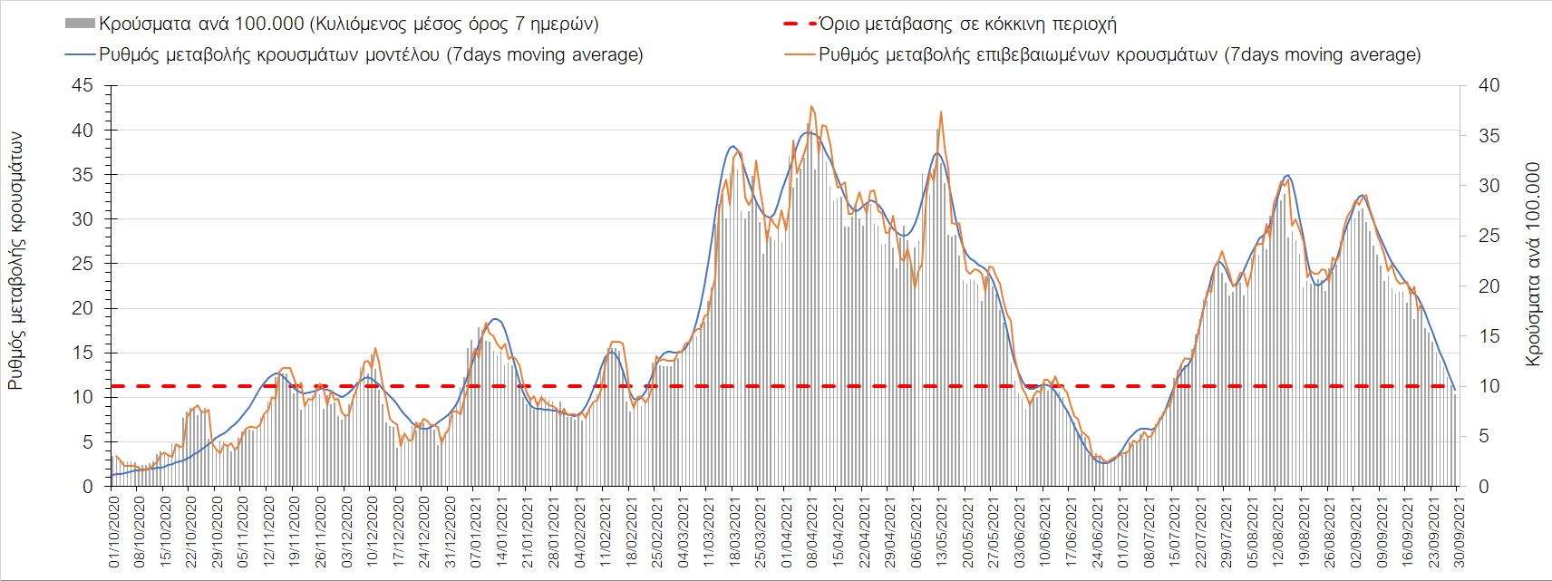 Αναμένουμε τις επόμενες ημέρες για να δούμε τις επιπτώσεις της επιστροφής του κύματος εξόδου του Αυγούστου, σε συνδυασμό με το άνοιγμα των σχολείων στην πορεία της πανδημίας. Αξίζει επίσης να σημειωθεί ότι οι υψηλές θερμοκρασίες των προηγουμένων ημερών, συντέλεσαν στη μείωση της μεταδοτικότητας και συνέβαλλαν στη συγκράτηση του αριθμού των κρουσμάτων, αλλά ήδη αρχίζει να διαφαίνεται επιβράδυνση της πτωτικής πορείας.