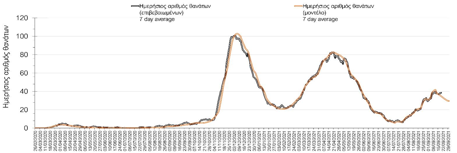 Ο αριθμός ημερήσιων θανάτων (33) που καταγράφηκε είναι μικρότερος σε σχέση με το Σάββατο (37). Όπως είχαμε προβλέψει ο κυλιόμενος εβδομαδιαίος μέσος όρος που είναι 37,9 ακολουθεί πλέον την πορεία του αριθμού των ασθενών σε κρίσιμη κατάσταση.