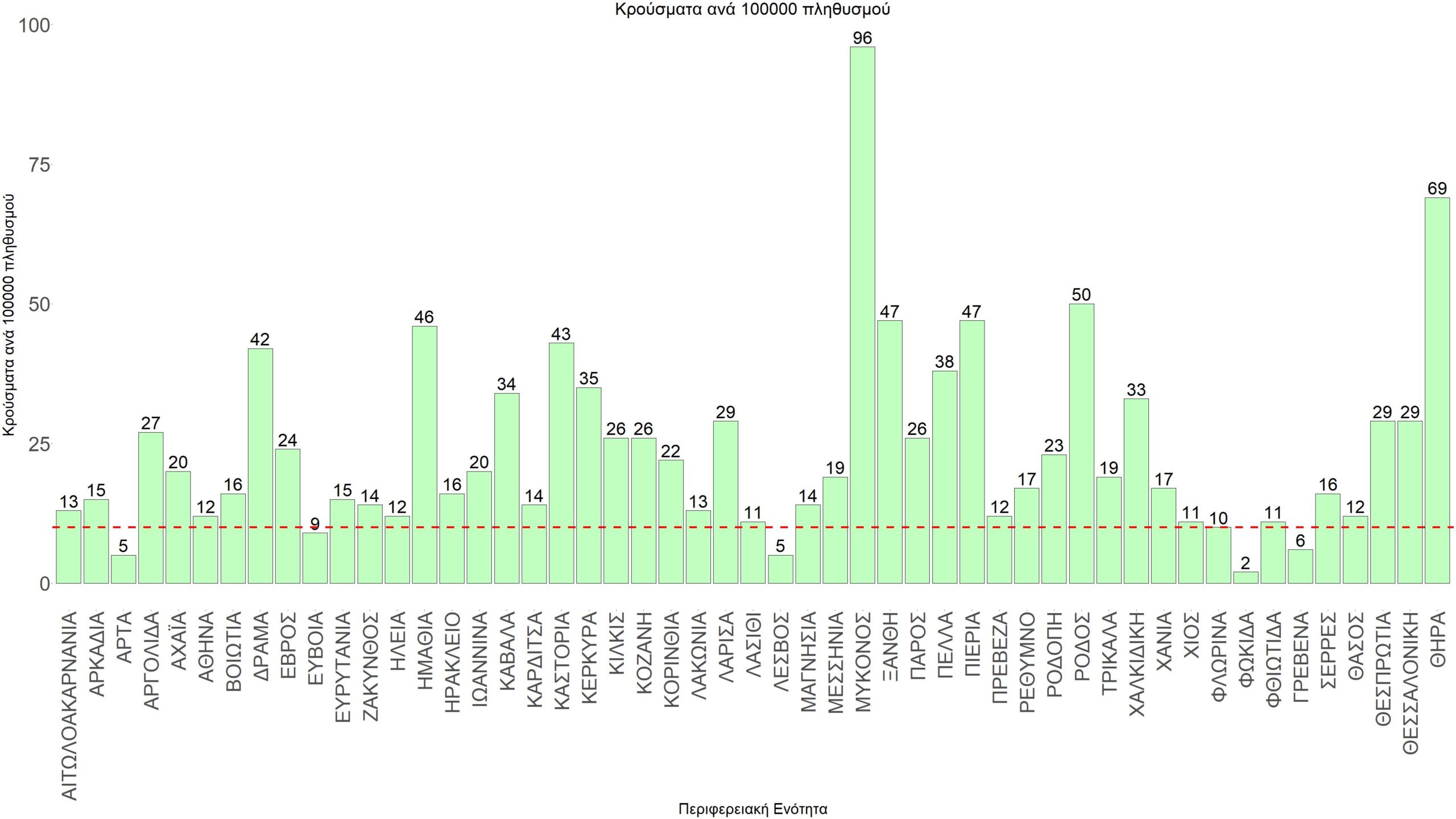 Όσον αφορά επιμέρους περιοχές, παραμένουν ακόμα πάνω από το όριο χαρακτηρισμού ως περιοχές ανησυχίας, η Αττική, η Θεσσαλονίκη η Λάρισα, η Καρδίτσα, τα Τρίκαλα, η Αχαΐα, η Λακωνία, η Αργολίδα, η Αρκαδία, η Κορινθία, η Μεσσηνία, η Ηλεία, η Αιτωλοακαρνανία, η Βοιωτία, η Φθιώτιδα, τα Ιωάννινα, η Θεσπρωτία, η Πρέβεζα, η Κοζάνη, η Ημαθία, η Πέλλα, το Κιλκίς, η Καβάλα, η Καστοριά, η Φλώρινα, η Πέλλα, τα Γρεβενά, η Δράμα, οι Σέρρες, η Χαλκιδική, η Πιερία, η Ροδόπη, η Ξάνθη, ο Έβρος, το Ηράκλειο, τα Χανιά, το Ρέθυμνο, το Λασίθι, η Κέρκυρα, η Χίος, η Πάρος, η Ζάκυνθος, η Μύκονος, η Σαντορίνη, και η Ρόδος. Η συγκεντρωτική εικόνα των επιμέρους περιοχών παρουσιάζεται στο Σχήμα 59.