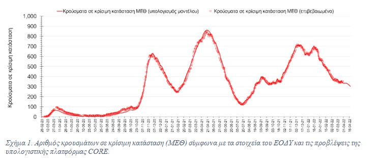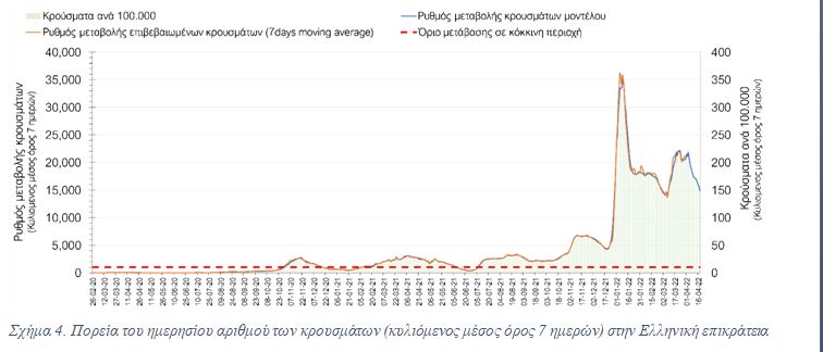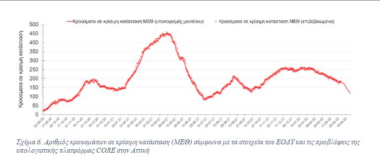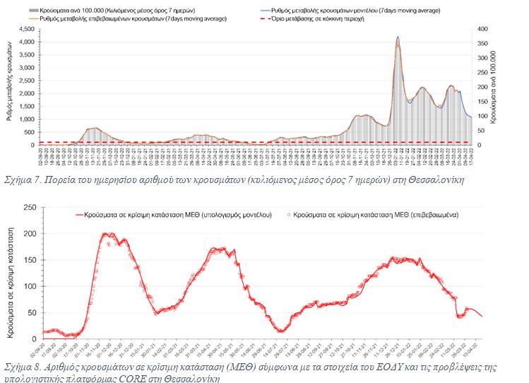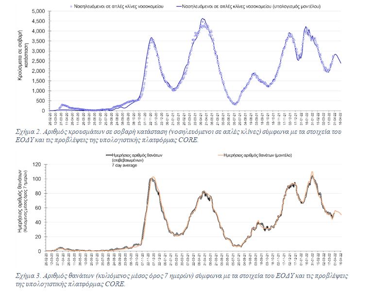 Η πορεία της μέσης εβδομαδιαίας τιμής των κρουσμάτων, καθώς και του κυλιόμενου μέσου όρου 7 ημερών του αριθμού των κρουσμάτων ανά 100.000 πληθυσμού, όπως έχουν καταγραφεί από τον ΕΟΔΥ και η αναμενόμενη πορεία τους, όπως προδιαγράφεται από την υπολογιστική πλατφόρμα CORE για την ελληνική επικράτεια (όπως και στην Αττική και τη Θεσσαλονίκη) έως τις 30 Μαρτίου, αποτυπώνονται στο Σχήμα 4. Αυτή η προβλεπόμενη πορεία, που αφορά στα κρούσματα, τους νοσηλευόμενους σε απλές κλίνες, όσο και σε ΜΕΘ, καθώς επίσης και τους θανάτους, βασίζεται στις ακόλουθες παραδοχές: