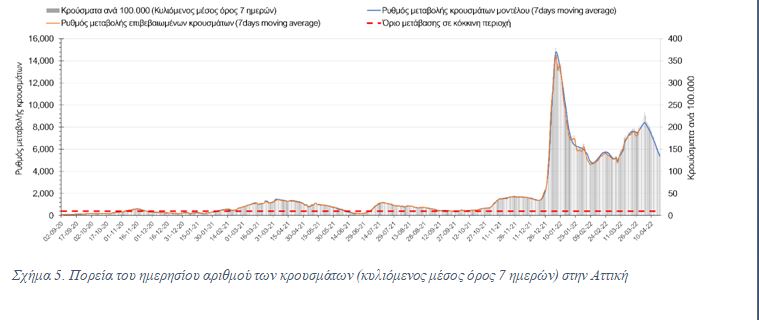 Στις επιμέρους περιοχές με υψηλό υγειονομικό κίνδυνο, χθες παρατηρήθηκε μικρότερος αριθμός κρουσμάτων στη Θεσσαλονίκη με 2191 κρούσματα (2827 κρούσματα χθες), όπως και στην Αττική, με 8453 κρούσματα (11207 κρούσματα προχθές). Η Αττική αντιπροσωπεύει περίπου το 38% των κρουσμάτων, και εμφανίζει σχεδόν 4 φορές περισσότερα κρούσματα από τη Θεσσαλονίκη. Η ανοδική πορεία των κρουσμάτων στην Αττική, αρχίζει να κάμπτεται και θα γίνει πιο έντονη η τάση αυτή στις επόμενες ημέρες (Σχήμα 5), ενώ η πορεία των κρουσμάτων σε κρίσιμη κατάσταση (διασωληνωμένοι σε ΜΕΘ) παρουσιάζεται στο Σχήμα 6.