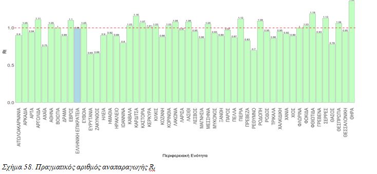 O πραγματικός αριθμός αναπαραγωγής Rt ανά περιφερειακή ενότητα της χώρας παρουσιάζεται στο Σχήμα 58.